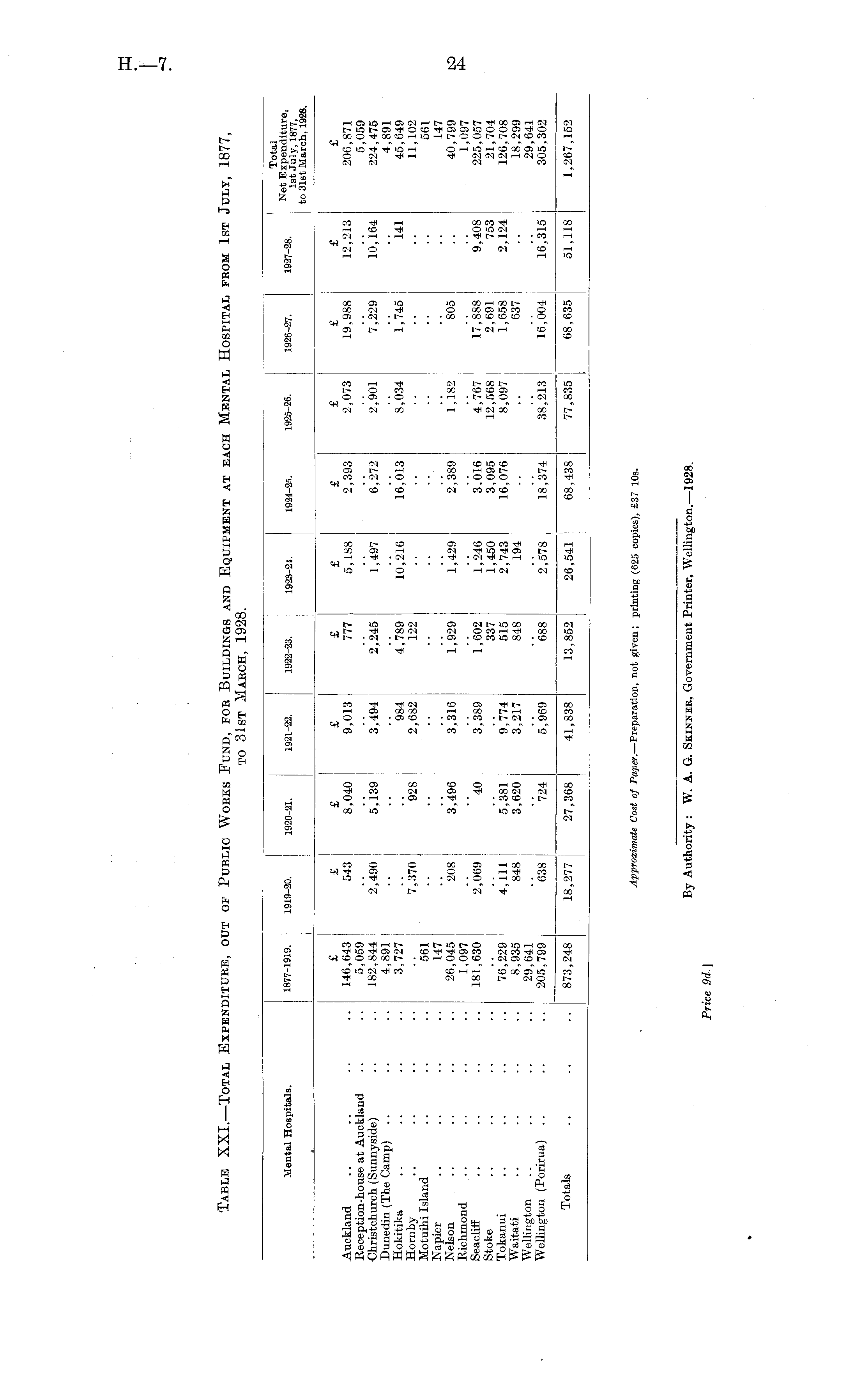 Table XXI.—Total Expenditure, out of Public Works Fund, for Buildings and Equipment at each Mental Hospital from 1st July, 1877, to 31st March, 1928.