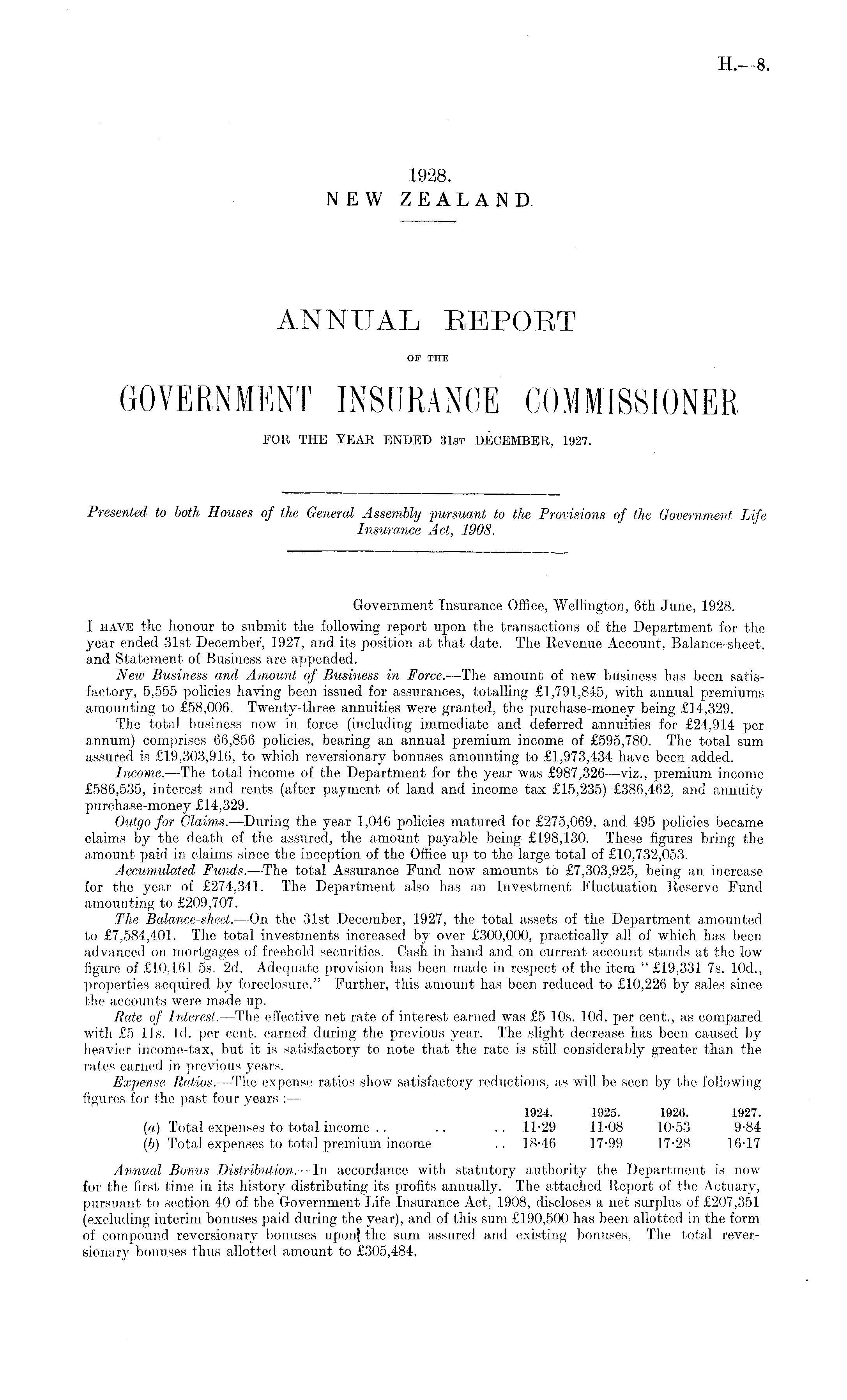 Government Insurance Office, Wellington, 6th June, 1928. I have the honour to submit the following report upon the transactions of the Department for the year ended 31st December, 1927, and its position at that date. The Revenue Account, Balance-sheet, and Statement of Business are appended. New Business and Amount of Business in Force.—The amount of new business has been satisfactory, 5,555 policies having been issued for assurances, totalling £1,791,845, with annual premiums amounting to £58,006. Twenty-three annuities were granted, the purchase-money being £14,329. The total business now in force (including immediate and deferred annuities for £24,914 per annum) comprises 66,856 policies, bearing an annual premium income of £595,780. The total sum assured is £19,303,916, to which reversionary bonuses amounting to £1,973,434 have been added. Income. —The total income of the Department for the year was £987,326 —viz., premium income £586,535, interest and rents (after payment of land and income tax £15,235) £386,462, and annuity purchase-money £14,329. Outgo for Claims. —During the year 1,046 policies matured for £275,069, and 495 policies became claims by the death of the assured, the amount payable being £198,130. These figures bring the amount paid in claims since the inception of the Office up to the large total of £10,732,053. Accumulated Funds. —The total Assurance Fund now amounts to £7,303,925, being an increase for the year of £274,341. The Department also has an Investment Fluctuation Reserve Fund amounting to £209,707. The Balance-sheet. —On the 31st December, 1927, the total assets of the Department amounted to £7,584,401. The total investments increased by over £300,000, practically al! of which has been advanced on mortgages of freehold securities. Cash in hand and on current account stands at the low figure of £10,161 ss. 2d. Adequate provision has been made in respect of the item " £19,331 7s. 10d., properties acquired by foreclosure." Further, this amount has been reduced to £10,226 by sales since the accounts were made up. Bate of Interest.—The effective net rate of interest earned was £5 10s. lOd. per cent., as compared with £5 lis. Id. per cent, earned during the previous year. The slight decrease has been caused by heavier income-tax, but it is satisfactory to note that the rate is still considerably greater than the rates earned in previous years. Expense Ratios. —The expense ratios show satisfactory reductions, as will be seen by the following figures for the past four years : — 1924. 1925. 1926. 1927. (a) Total expenses to total income .. .. .. 11-29 11-08 10-53 9-84 (b) Total expenses to total premium income .. 18-46 17-99 17-28 16-17 Annual Bonus Distribution. —In accordance with statutory authority the Department is now for the first time in its history distributing its profits annually. The attached Report of the Actuary, pursuant to section 40 of the Government Life Insurance Act, 1908, discloses a net surplus of £207,351 (excluding interim bonuses paid during the year), and of this sum £190,500 has been allotted in the form of compound reversionary bonuses uponj the sum assured and existing bonuses, The total reversionary bonuses thus allotted amount to £305,484.