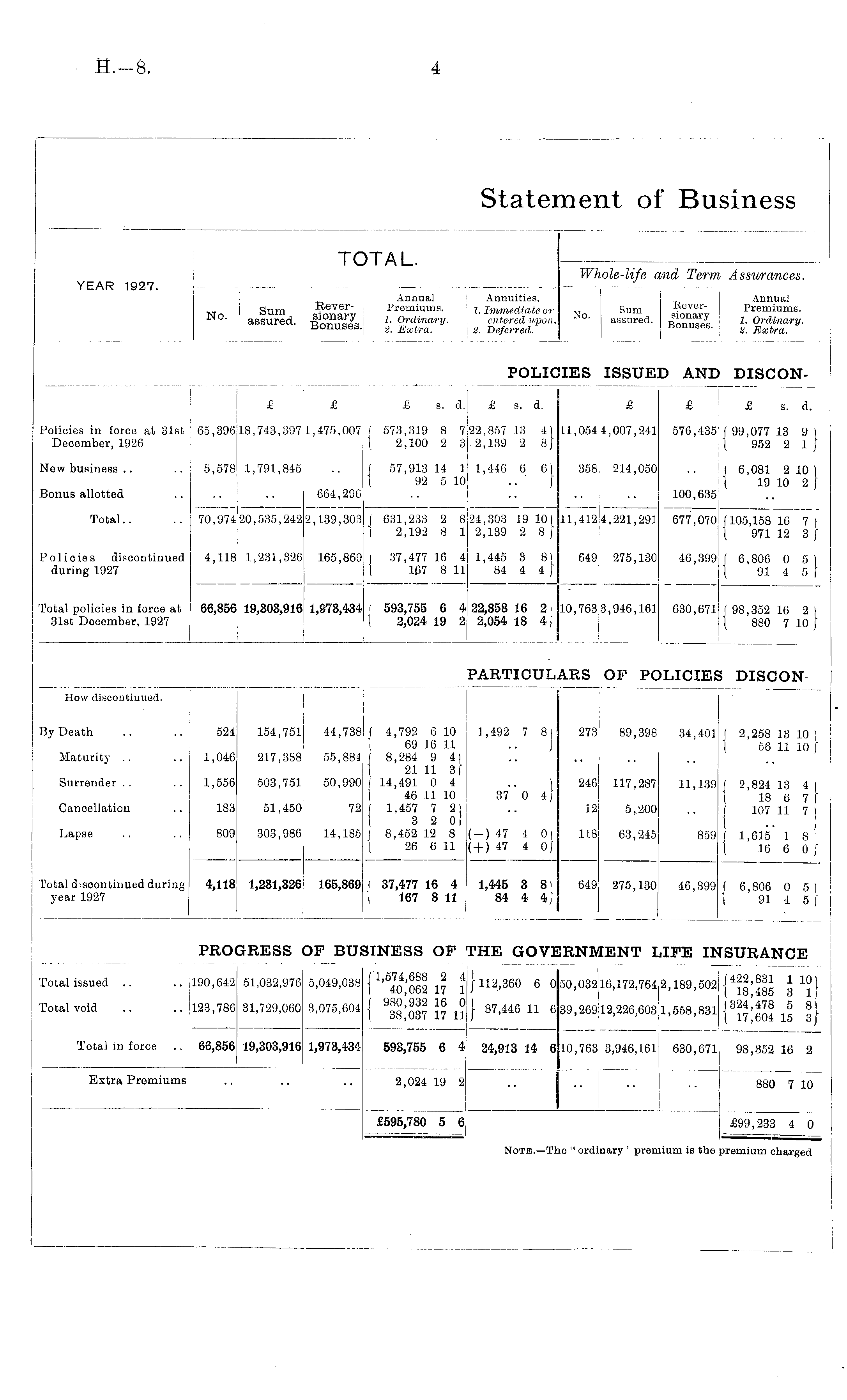 TOTAL. : Whole-life and, Term Assura?ices. YEAR 1927. : — —. Annual Annuities. ] Annual Sum Premiums. L Immediate or „ Sum Premiums. jN0 ' assured. 1. Ordinary. entered upon. 1 °- assured. ! o'" 1. Ordinary. Bonuses. Extra. j 2. Deferred. Bonuses. Extra. POLICIES ISSUED AND DISCON- £ £ £ s. d. £ s. d. £ £ £ a. d. Policies in force at 31st 65,39618,743,397 1,475,007 / 573,319 8 722,857.13 4111,054 4,007,241 576,435(99,077 13 9 1 December, 1926 \ 2,100 2 3 2,139 2 8J { 952 2 1 } New business .. .. 5,578 1,791,845 .. ( 57,913 14 1 1,446 6 6) 358 214,050 .. j 6,081 2 10) 1 92 5 10 .. ' J t 19 10 2 f Bonus allotted .. .. .. 664,296 .. .. .. .. 100,635 Total.. .. 70,97420,535,2422,139,303 ] 631,233 2 8 24,30-3 19 10111,412 4,221,291 677,070 (105,158 16 7| I 2,192 8 1 2,139 2 8 j | 971 12 3 f Polioies discontinued 4,118 1,231,326 165,869 1 37,477 16 4 1,445 3 81 649 275,130 46,399 / 6,806 0 5) during 1927 1 167 8 11 84 4 4 f { 91 4 5 | " Total policies in force at 66,856 19,303,916 1,973,434 1 593,755 6 4 22,858 16 2 | 10,763 3,946,161 630,671 / 98,352 16 2 1 31st December, 1927 I 2,024 19 2 2,054 18 4 j { 880 7 10 J PARTICULARS OF POLICIES DISCON How discontinued. j : By Death .. .. 524 154,751 44,738 / 4,792 6 10 1,492 7 8| 273 ! 89,398 34,401 f 2,258 13 10) I 69 16 11 j 56 11 io Maturity .. .. 1,046 217,388 55,884 / 8,284 9 4) \ 21 11 3) Surrender .. .. 1,556 503,751 50,990 / 14,491 0 4 .. j 246 117,287 11,139 ( 2,824 13 4 I 1 46 11 10 37 0 4| 1 18 6 7 f Cancellation .. 183 51,450 72 j 1,457 7 21 .. 12 5,200 .. f 107 11 7 | 1 3 2 Of ( ' Lapse .. .. 809 303,986 14,185 / 8,452 12 8 (-) 47 4 0| 118 63,245 859 1 615 1 8 1 1 26 6 11 ( + ) 47 4 0) \ 16 6 0 | Total discontinued during 4,118 1,231,326 165,869 / 37,477 16 4 1,445 3 8| 649 275,130 46,399 / 6,806 0 5) year 1927 | ( 167 8 11 84 4 4/ ( 91 4 5 [ PROGRESS OF BUSINESS OF THE GOVERNMENT LIFE INSURANCE Total issued .. .. 190,642 51,032,976 5,049,038 j } 112,360 6 0 50,03216,172,764:2,189,5021 g Total void .. .. 123,786 31,729,060 3,075,604 j 9 J® £ } 37,446 11 6 39,26912,226,6031,558,831 | J ®j Total in force .. 66,856 19,303,916 1,973,434 593,755 6 4 24,913 14 6 10,763 3,946,161 630,671 98,352 16 2 Extra Premiums .. .. .. 2,024 19 2 .. .. .. .. 880 7 10 £595,780 5 6 £99,233 4 0 Note.—The "ordinary ' premium is the premium charged