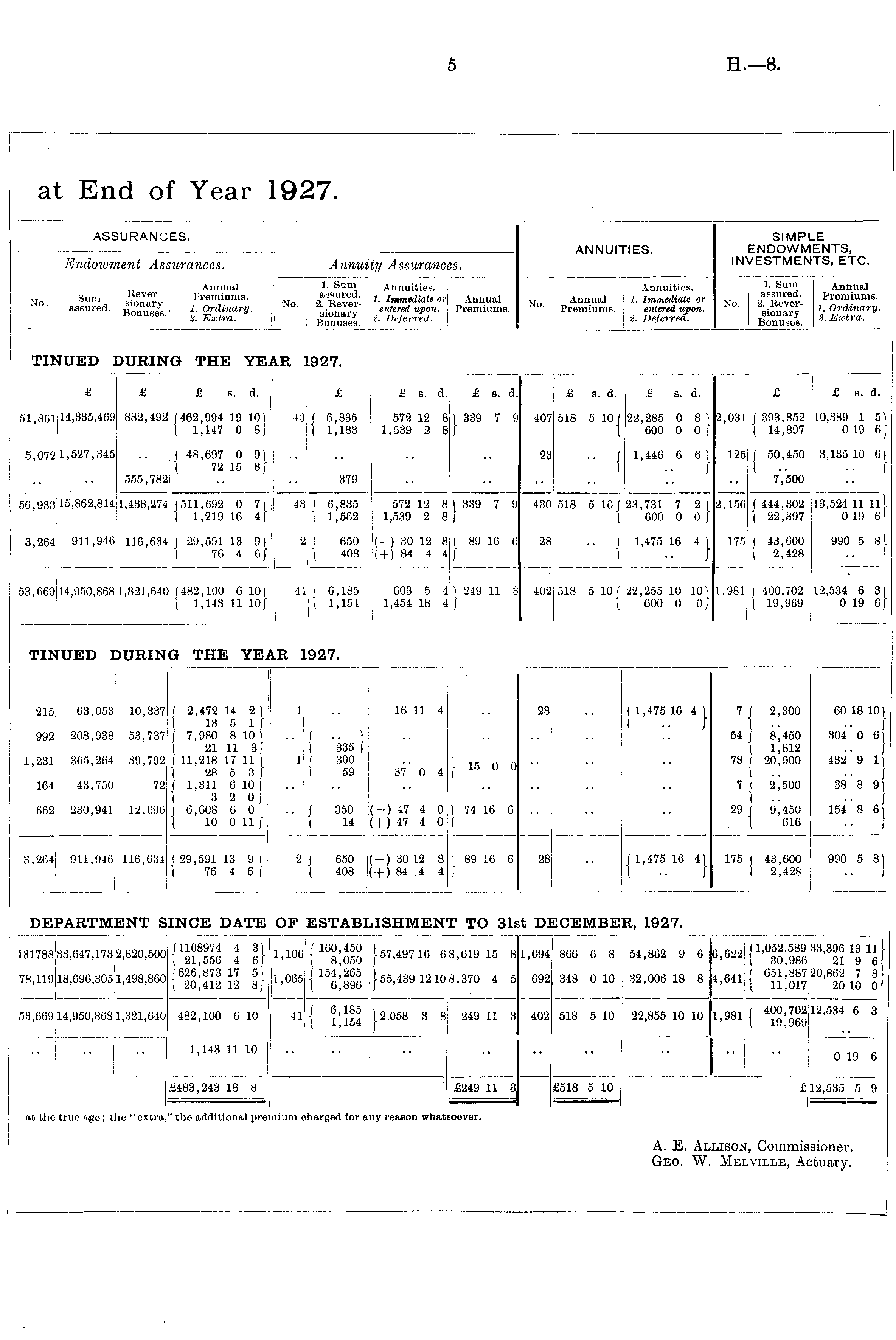 ASSURANCES. SIMPLE ANNUITIES. ENDOWMENTS, Endowment Assurances. Annuity Assurances. INVESTMENTS, ETC. Annual Sum Annuities, i Annuities. Annual No Sum sionarv Premiums. 2 aS Rever- >■ Immediate or\ Annual „ Annual | 1. Immediate or No I Premiums, assured. B nnl] c,21 I 1- Ordinary. | ' '■ entered upon. Premiums. Premiums. entered upon. ' ' i n . 1. Ordinary. * Kxtra. |i B ~el |«- Deferred. \ _ | ». Deferrel | Bonuses- * Extra ' TINUED DURING THE YEAR 1927. | i I £. £ I £ s. d. : £ £ a. d. £ s. d. £ s. d. £ a. d. j £ £ s. d. 51,86l| 14,335,469 882,492j (462,994 19 10) 43/ 6,835 572 12 8 V 339 7 9 407 518 5 10122,285 0 8 ) 2,031 f 393,852 10,389 1 5) t 1,147 0 8J 1 1,183 1,539 2 8 ) ) 600 0 0 ) \\ 14,897 0 19 6j 5,0721,527,345 .. f 48,697 0 9) .. .. .. .. 23 .. ( 1,446 6 6) 125 / 50,450 3,135 10 61 t 72 15 8} | .. J I • • ) 555,782 .. .. 379 .. .. .. .. .. .. 7,500 56,933 15,862,814 1,438,274(511,692 0 71 43 / 6,835 I 572 12 8)339 7 9 430 518 5 10/ 23,731 7 2 ) 2,1561 / 444,302 13,524 11 111 \ 1,219 16 4] ( 1,562 1,539 2 8 J } 600 0 0 J 1 22,397 0 19 6' 3,264 911,946 116,634 J 29,591 13 91 | 2 / 650 ((-) 30 12 8 1 89 16 6 28 .. / 1,475 16 4) 175 / 43,600 990 5 8} I 76 4 6j | 408 (+) 84 4 4 ) ( J ( 2,428 .. J 53,669 14,950,868 1,321,640 (482,100 6 101 41 / 6,185 603 5 4(249 11 3 402 518 5 10/ 22,255 10 1011,981 / 400,702 12,534 6 31 [( 1,143 11 10) t 1,154 1,454 18 4) \ 600 0 0J ( 19,969 0 19 6) I TINUED DURING THE YEAR 1927. 215 63,053 10,337 ( 2,472 14 2) 1 .. 16 11 4 .. 28 .. (1,475 16 4 1 7 ( 2,300 60 18 10) I 13 5 if ! .. \ 992 208,938 53,737 ( 7,980 8 10 1 .. / .. 1 .. .. .. .. 54 j 8,450 304 0 6( ( 21 11 3) 1 335 J ( 1,812 .. ) 1,231 365,264 39,792 ( 11,218 17 11 ) 1 I 300 .. I „ .. .. .. 78 | 20,900 432 9 1) ( 28 5 3 J 1 59 37 0 4 f ( .. .. 164 1 43,750 72 / 1,311 6 10 .. .. .. .... .. .. 7 I 2,500 38 8 9) I 3 2 0 j j .... | 662 230,941 12,696 / 6,608 6 0| .. / 350 }( —) 47 4 0 1 74 16 6 .. .. .. 29 / 9,450 154 8 6) 1 10 0 11 J | 14 j(+) 47 4 0 ) ( 616 .. ) 3,264 911,946 116,634 / 29,591 13 9 1 2 / 650 (-) 30 12 8 1 89 16 6 28 .. / 1,475 16 4) 175 ] 43,600 990 5 8) ( 76 4 6 | | 408 (+) 84 A 4) ( .. J 1 2,428 .. ) I I DEPARTMENT SINCE DATE OF ESTABLISHMENT TO 31st DECEMBER, 1927. 131788 33,647,173 2,820,500 | \ g} 1,106 { 050 j 57 - 49716 68,619 15 8 1,094 866 6 8 54,862 9 6 6,622 {986 33,3 |f X g X g} 78,11918,696,3051,498,860 J 6 12 8/ 1 ' 065 "[ } 55,439 1210 8,3 7 0 4 5 692 348 0 10 32,006 18 8 4,641 -J 2 °' 8 20 10 0^ 53,66914,950,8681,321,640 482,100 6 10 41 j 6,1 g® j. 2,058 3 8 249 11 3 402 518 5 10 22,855 10 10 1,981 | 40 g'g°y 12,534 6 3 " "j 1.H3 1110 I .. 0 19 6 £483,243 18 8 £249 11 3 £518 5 10 £12,535 5 9 ~ — I I = at the true age; the "extra," the additional premium charged for any reason whatsoever.