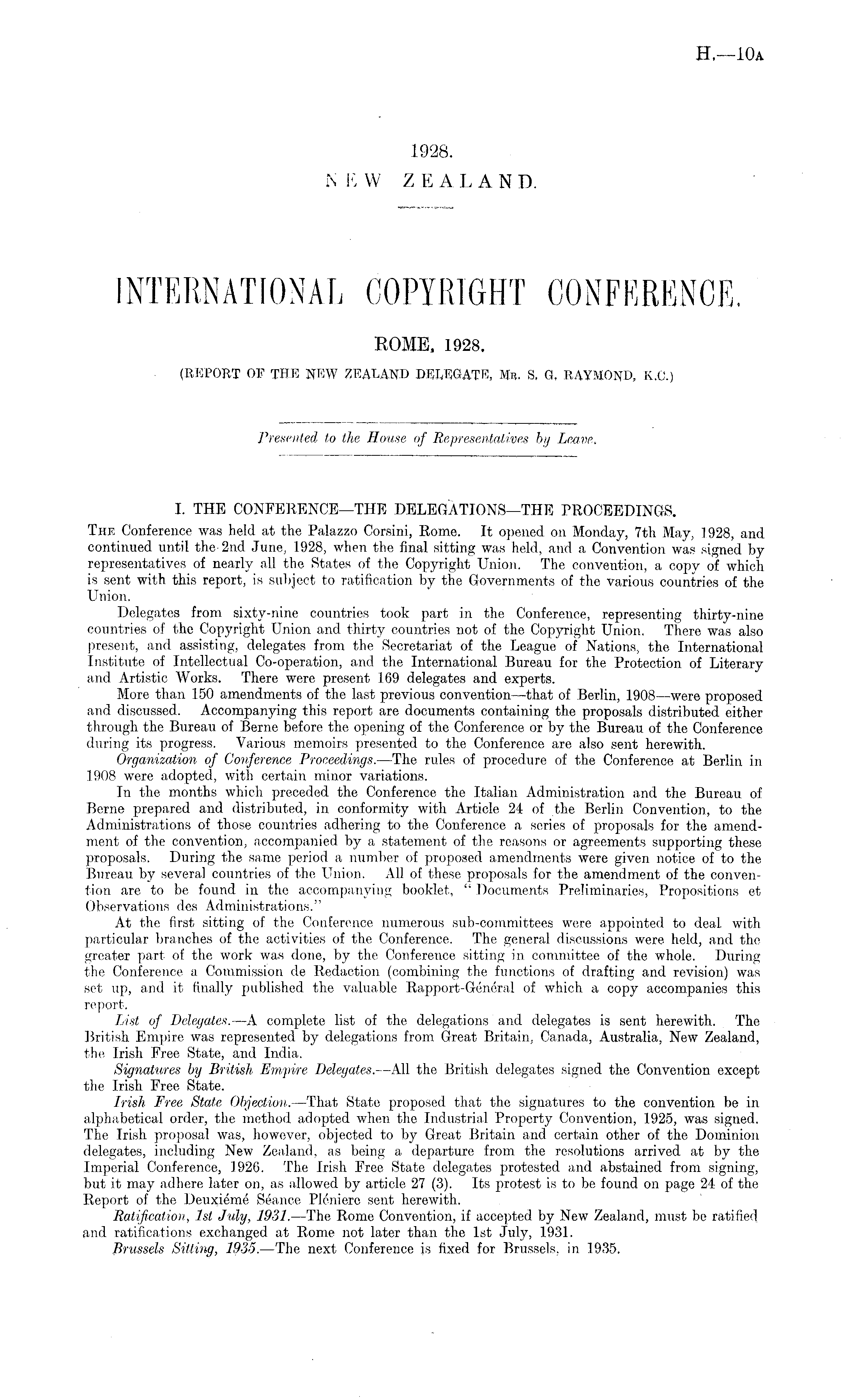INTERNATIONAL COPYRIGHT CONFERENCE. ROME, 1928. (REPORT OF THE NEW ZEALAND DELEGATE, Mr. S. G. RAYMOND, K.C.)