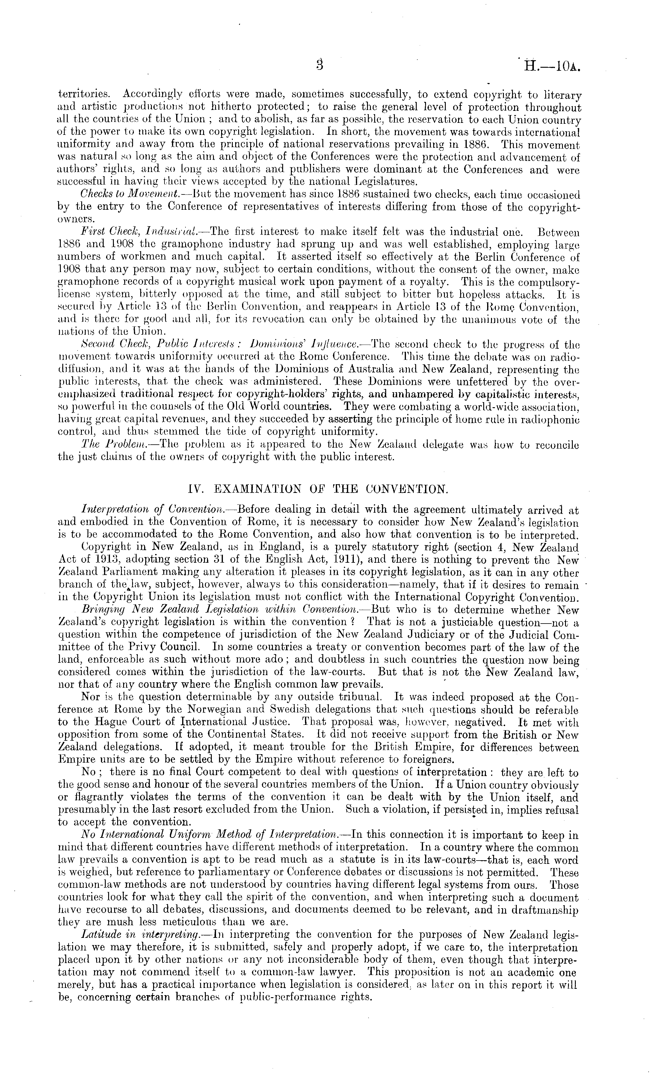 territories. Accordingly efforts were made, sometimes successfully, to extend copyright to literary and artistic productions not hitherto protected; to raise the general level of protection throughout all the countries of the Union ; and to abolish, as far as possible, the reservation to each Union country of the power to make its' own copyright legislation. In short, the movement was towards international uniformity and away from the principle of national reservations prevailing in 1886. This movement was natural so long as the aim and object of the Conferences were the protection and advancement of authors' rights, and so long as authors and publishers were dominant at the Conferences and were successful in having their views accepted by the national Legislatures. Checks to Movement.-—But the movement has since 1886 sustained two checks, each time occasioned by the entry to the Conference of representatives of interests differing from those of the copyrightowners. First Chech, Industrial. —The first interest to make itself felt was the industrial one. Between 1886 and 1908 the gramophone industry had sprung up and was well established, employing large numbers of workmen and much capital. It asserted itself so effectively at the Berlin Conference of 1908 that any person may now, subject to certain conditions, without the consent of the owner, make gramophone records of a copyright musical work upon payment of a royalty. This is the compulsorylicense system, bitterly opposed at the time, and still subject to bitter but hopeless attacks. It is secured by Article 13 of the Berlin Convention, and reappears in Article 13 of the Rome Convention, and is there for good and all, for its revocation can only be obtained by the unanimous vote of the nations of the Union. Second Check, Public Interests: Dominions' Influence. —The second check to the progress of the movement towards uniformity occurred at the Rome Conference. This time the debate was on radiodiffusion, and it was at the hands of the Dominions of Australia and New Zealand, representing the public interests, that the check was administered. These Dominions were unfettered by the overemphasized traditional respect for copyright-holders' rights, and unhampered by capitalistic interests, so powerful in the counsels of the Old World countries. They were combating a world-wide association, having great capital revenues, and they succeeded by asserting the principle of home rule in radiophonic control, and thus stemmed the tide of copyright uniformity. The Problem.—The problem as it appeared to the New Zealand delegate was how to reconcile the just claims of the owners of copyright with the public interest. IV. EXAMINATION OF THE CONVENTION. Interpretation of Convention. —Before dealing in detail with the agreement ultimately arrived at and embodied in the Convention of Rome, it is necessary to consider how New Zealand's legislation is to be accommodated to the Rome Convention, and also how that convention is to be interpreted. Copyright in New Zealand, as in England, is a purely statutory right (section 4, New Zealand Act of 1913, adopting section 31 of the English Act, 1911), and there is nothing to prevent the New Zealand Parliament making any alteration it pleases in its copyright legislation, as it can in any other branch of the Jaw, subject, however, always to this consideration—namely, that if it desires to remain in the Copyright Union its legislation must not conflict with the International Copyright Convention. Bringing New Zealand Legislation within Convention.—But who is to determine whether New Zealand's copyright legislation is within the convention ? That is not a justiciable question—not a question within the competence of jurisdiction of the New Zealand Judiciary or of the Judicial Committee of the Privy Council. In some countries a treaty or convention becomes part of the law of the land, enforceable as such without more ado; and doubtless in such countries the question now being considered comes within the jurisdiction of the law-courts. But that is not the New Zealand law, nor that of any country where the English common law prevails. Nor is the question determinable by any outside tribunal. It was indeed proposed at the Conference at Rome by the Norwegian and Swedish delegations that such questions should be referable to the Hague Court of International Justice. That proposal was, however, negatived. It met with opposition from some of the Continental States. It did not receive support from the British or New Zealand delegations. If adopted, it meant trouble for the British Empire, for differences between Empire units are to be settled by the Empire without reference to foreigners. No ; there is no final Court competent to deal with questions of interpretation : they are left to the good sense and honour of the several countries members of the Union. If a Union country obviously or flagrantly violates the terms of the convention it can be dealt with by the Union itself, and presumably in the last resort excluded from the Union. Such a violation, if persisted in, implies refusal to accept the convention. No International Uniform Method of Interpretation.—ln this connection it is important to keep in mind that different countries have different methods of interpretation. In a country where the common law prevails a convention is apt to be read much as a statute is in its law-courts—that is, each word is weighed, but reference to parliamentary or Conference debates or discussions is not permitted. These common-law methods are not understood by countries having different legal systems from ours. Those countries look for what they call the spirit of the convention, and when interpreting such a document have recourse to all debates, discussions, and documents deemed to be relevant, and in draftmanship they are mush less meticulous than we are. Latitude in interpreting.—ln interpreting the convention for t