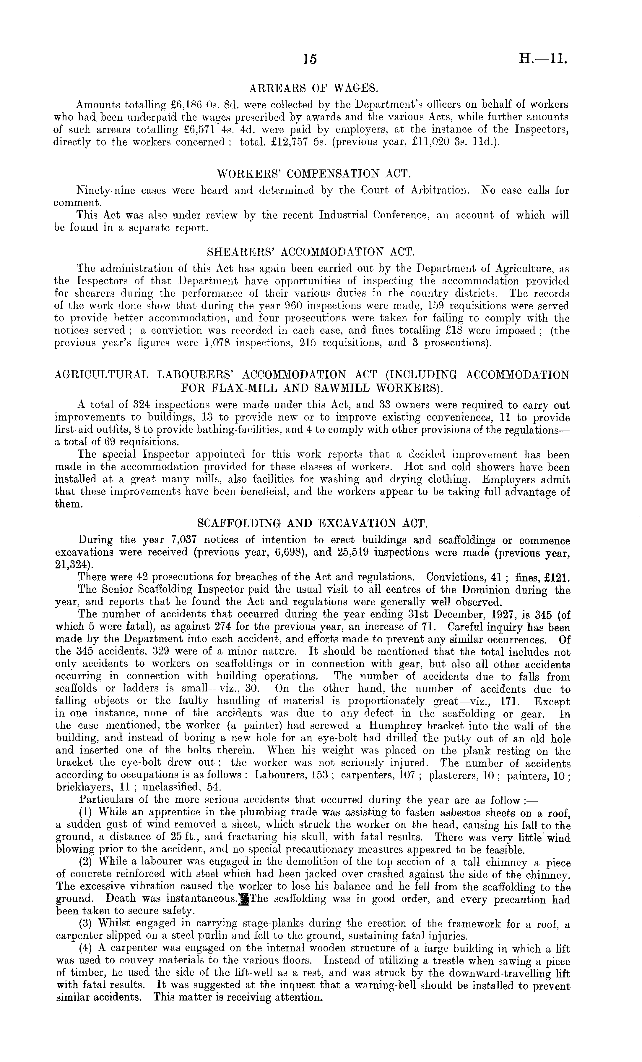 ARREARS OF WAGES. Amounts totalling £6,186 Os. Bd. were collected by the Department's officers on behalf of workers who had been underpaid the wages prescribed by awards and the various Acts, while further amounts of such arrears totalling £6,571 4s. 4d. were paid by employers, at the instance of the Inspectors, directly to the workers concerned : total, £12,757 ss. (previous year, £11,020 3s. lid.). WORKERS' COMPENSATION ACT. Ninety-nine cases were heard and determined by the Court of Arbitration. No case calls for comment. This Act was also under review by the recent Industrial Conference, an account of which will be found in a separate report. SHEARERS' ACCOMMODATION ACT. The administration of this Act has again been carried out by the Department of Agriculture, as the Inspectors of that Department have opportunities of inspecting the accommodation provided for shearers during the performance of their various duties in the country districts. The records of the work done show that during the year 960 inspections were made, 159 requisitions were served to provide better accommodation, and four prosecutions were taken for failing to comply with the notices served ; a conviction was recorded in each case, and fines totalling £18 were imposed ; (the previous year's figures were 1,078 inspections, 215 requisitions, and 3 prosecutions). AGRICULTURAL LABOURERS' ACCOMMODATION ACT (INCLUDING ACCOMMODATION FOR FLAX-MILL AND SAWMILL WORKERS). A total of 324 inspections were made under this Act, and 33 owners were required to carry out improvements to buildings, 13 to provide new or to improve existing conveniences, 11 to provide first-aid outfits, 8 to provide bathing-facilities, and 4 to comply with other provisions of the regulations— a total of 69 requisitions. The special Inspector appointed for this work reports that a decided improvement has been made in the accommodation provided for these classes of workers. Hot and cold showers have been installed at a great many mills, also facilities for washing and drying clothing. Employers admit that these improvements have been beneficial, and the workers appear to be taking full advantage of them. SCAFFOLDING AND EXCAVATION ACT. During the year 7,037 notices of intention to erect buildings and scaffoldings or commence excavations were received (previous year, 6,698), and 25,519 inspections were made (previous year, 21,324). There were 42 prosecutions for breaches of the Act and regulations. Convictions, 41 ; fines, £121. The Senior Scaffolding Inspector paid the usual visit to all centres of the Dominion during the year, and reports that he found the Act and regulations were generally well observed. The number of accidents that occurred during the year ending 31st December, 1927, is 345 (of which 5 were fatal), as against 274 for the previous year, an increase of 71. Careful inquiry has been made by the Department into each accident, and efforts made to prevent any similar occurrences. Of the 345 accidents, 329 were of a minor nature. It should be mentioned that the total includes not only accidents to workers on scaffoldings or in connection with gear, but also all other accidents occurring in connection with building operations. The number of accidents due to falls from scaffolds or ladders is small—viz., 30. On the other hand, the number of accidents due to falling objects or the faulty handling of material is proportionately great—viz., 171. Except in one instance, none of the accidents was due to any defect in the scaffolding or gear. In the case mentioned, the worker (a painter) had screwed a Humphrey bracket into the wall of the building, and instead of boring a new hole for an eye-bolt had drilled the putty out of an old hole and inserted one of the bolts therein. When his weight was placed on the plank resting on the bracket the eye-bolt drew out; the worker was not seriously injured. The number of accidents according to occupations is as follows : Labourers, 153 ; carpenters, 107 ; plasterers, 10 ; painters, 10 ; bricklayers, 11 ; unclassified, 54. Particulars of the more serious accidents that occurred during the year are as follow (1) While an apprentice in the plumbing trade was assisting to fasten asbestos sheets on a roof, a sudden gust of wind removed a sheet, which struck the worker on the head, causing his fall to the ground, a distance of 25 ft., and fracturing his skull, with fatal results. There was verv little wind blowing prior to the accident, and no special precautionary measures appeared to be feasible. (2) While a labourer was engaged in the demolition of the top section of a tall chimney a piece of concrete reinforced with steel which had been jacked over crashed against the side of the chimney. The excessive vibration caused the worker to lose his balance and he fell from the scaffolding to the ground. Death was instantaneous.J£The scaffolding was in good order, and every precaution had been taken to secure safety. (3) Whilst engaged in carrying stage-planks during the erection of the framework for a roof, a carpenter slipped on a steel purlin and fell to the ground, sustaining fatal injuries. (4) A carpenter was engaged on the internal wooden structure of a large building in which a lift was used to convey materials to the various floors. Instead of utilizing a trestle when sawing a piece of timber, he used the side of the lift-well as a rest, and was struck by the downward-travelling lift with fatal results. It was suggested at the inquest that a warning-bell should be installed to prevent similar accidents. This matter is receiving attention.