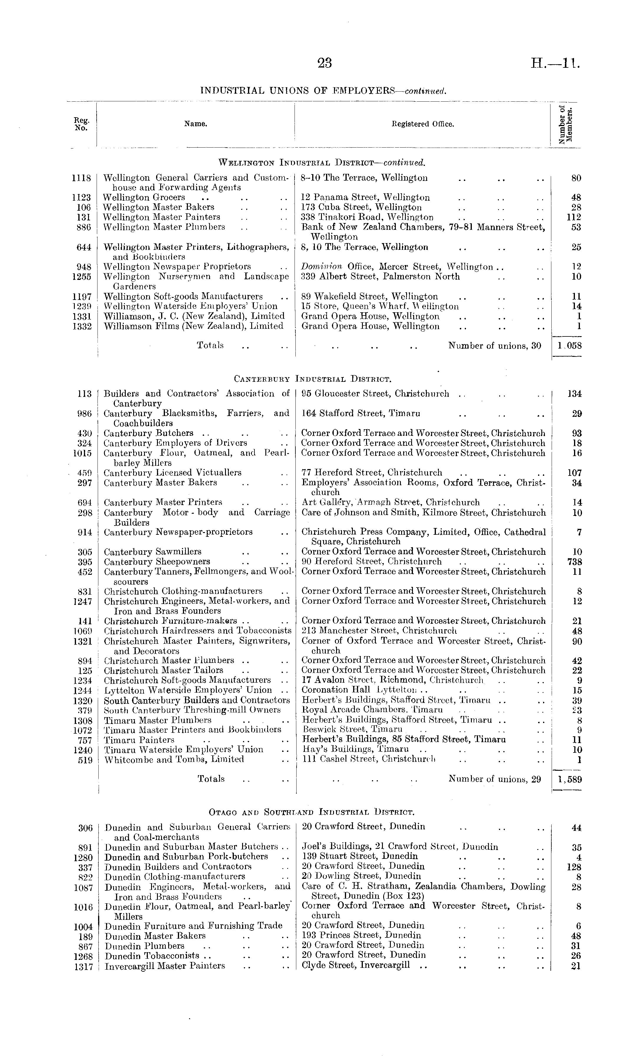 I . 2g Name. Kegistered Office. ,§•§ is | 85" Wellington Industrial District—continued. 1118 Wellington General Carriers and Custom- 8-10 The Terrace, Wellington .. .. .. 80 house and Forwarding Agents 1123 Wellington Grocers .. .. .. 12 Panama Street, Wellington .. .. .. 48 106 Wellington Master Bakers . .■ . . 173 Cuba Street, Wellington .. . . .. 28 131 Wellington Master Painters .. .. 338 Tinakori Road, Wellington .. .. .. 112 886 Wellington Master Plumbers .. .. Bank of New Zealand Chambers, 79-81 Manners Street, 53 Wellington 644 Wellington Master Printers, Lithographers, 8, 10 The Terrace, Wellington .. ,. .. 25 and Bookbinders 948 Wellington Newspaper Proprietors .. Dominion Office, Mercer Street, Wellington .. .. 12 1255 Wellington Nurserymen and Landscape 339 Albert Street, Palmerston North .. . . 10 Gardeners 1197 Wellington Soft-goods Manufacturers .. 89 Wakefield Street, Wellington .. .. .. 11 1239 Wellington Waterside Employers' Union 15 Store, Queen's Wharf, Wellington .. 14 1331 Williamson, J. C. (New Zeala,nd), Limited Grand Opera House, Wellington .. .. .. 1 1332 Williamson Films (New Zealand), Limited Grand Opera House, Wellington .. .. .. 1 Totals .. . . .. .. .. Number of unions, 30 1 058 Canterbury Industrial District. 113 Builders and Contractors' Association of 95 Gloucester Street, Christchurch .. .. .. 134 Canterbury 986 Canterbury Blacksmiths, Farriers, and 164 Stafford Street, Timaru .. .. .. 29 Coachbuilders 430 Canterbury Butchers .. .. .. Corner Oxford Terrace and Worcester Street, Christchurch 93 324 Canterbury Employers of Drivers .. Corner Oxford Terrace and Worcester Street, Christchurch 18 1015 Canterbury Flour, Oatmeal, and Pearl- Corner Oxford Terrace and Worcester Street, Christchurch 16 barley Millers 459 Canterbury Licensed Victuallers . . 77 Hereford Street, Christchurch .. .. .. 107 297 Canterbury Master Bakers .. . . Employers' Association Rooms, Oxford Terrace, Christ- 34 church 694 Canterbury Master Printers .. .. Art Gallery, Armagh Street, Christchurch .. .. 14 298 Canterbury Motor - body and Carriage Care of Johnson and Smith, Kilmore Street, Christchurch 10 Builders 914 Canterbury Newspaper-proprietors .. Christchurch Press Company, Limited, Office, Cathedral 7 Square, Christchurch 305 Canterbury Sawmillers .. .. Corner Oxford Terrace and Worcester Street, Christchurch 10 395 Canterbury Sheepowners .. 90 Hereford Street, Christchurch . . .. .. 738 452 Canterbury Tanners, Fellmongers, and Wool- Corner Oxford Terrace and Worcester Street, Christchurch 11 scourers 831 Christchurch Clothing-manufacturers .. Corner Oxford Terrace and Worcester Street, Christchurch 8 1247 Christchurch Engineers, Metal-workers, and Corner Oxford Terrace and Worcester Street, Christchurch 12 Iron and Brass Founders 141 Christchurch Furniture-makers .. .. Corner Oxford Terrace and Worcester Street, Christchurch 21 1069 Christchurch Hairdressers and Tobacconists 213 Manchester Street, Christchurch . . . . 48 1321 Christchurch Master Painters, Signwriters, Corner of Oxford Terrace and Worcester Street, Christ- 90 and Decorators church 894 Christchurch Master Plumbers .. .. Corner Oxford Terrace and Worcester Street, Christchurch 42 125 Christchurch Master Tailors .. .. Corner Oxford Terrace and Worcester Street, Christchurch 22 1234 Christchurch Soft-goods Manufacturers . . 17 Avalon Street. Richmond, Christchurch .. .. 9 1244 Lyttelton Waterside Employers' Union .. Coronation Hall Lytteltori .. .. 15 1320 South Canterbury Builders and Contractors Herbert's Buildings, Stafford Street, Timaru .. .. j 39 379 South Canterbury Threshing-mill Owners Royal Arcade Chambers. Timaru .. . . ,. j 23 1308 Timaru Master Plumbers .. .. Herbert's Buildings, Stafford Street, Timaru .. .. 8 1072 Timaru Master Printers and Bookbinders Beswick Street, Timaru . . . . .. . . 9 757 Timaru Painters .. ... .. Herbert's Buildings, 85 Stafford Street, Timaru .. 11 1240 Timaru Waterside Employers' Union .. Hay's Buildings, Timaru .. .. .. .. 10 519 Whitcombe and Tombs, Limited .. Ill Cashel Street, Christchurch .. .. .. 1 Totals .. .. .. .. .. Number of unions, 29 1,589 | Otaqo and Southland Industrial District. 306 Dunedin and Suburban General Carriers 20 Crawford Street, Dunedin .. .. .. 44 and Coal-merchants 891 Dunedin and Suburban Master Butchers .. Joel's Buildings, 21 Crawford Street, Dunedin .. 35 1280 Dunedin and Suburban Pork-butchers .. 139 Stuart Street, Dunedin ,. .. .. 4 337 Dunedin Builders and Contractors . . 20 Crawford Street, Dunedin .. .. . . 128 822 Dunedin Clothing-manufacturers . . 20 Dowling Street, Dunedin .. . . .. 8 1087 Dunedin Engineers, Metal-workers, and Care of C. H. Stratham, Zealandia Chambers, Dowling 28 Iron and Brass Founders .. . Street, Dunedin (Box 123) 1016 Dunedin Flour, Oatmeal, and Pearl-barley Corner Oxford Terrace and Worcester Street, Christ- 8 Millers church 1004 Dunedin Furniture and Furnishing Trade 20 Crawford Street, Dunedin . . . . .. 6 189 Dunedin Master Bakers .. 193 Princes Street, Dunedin . . . . 48 867 Dunedin Plumbers .. .. 20 Crawford Street, Dunedin .. . . .. 31 1268 Dunedin Tobacconists .. .. 20 Crawford Street, Dunedin .. .. .. 26 1317 Invercargill Master Painters .. .. Clyde Street, Invereargill .. .. .. .. 21