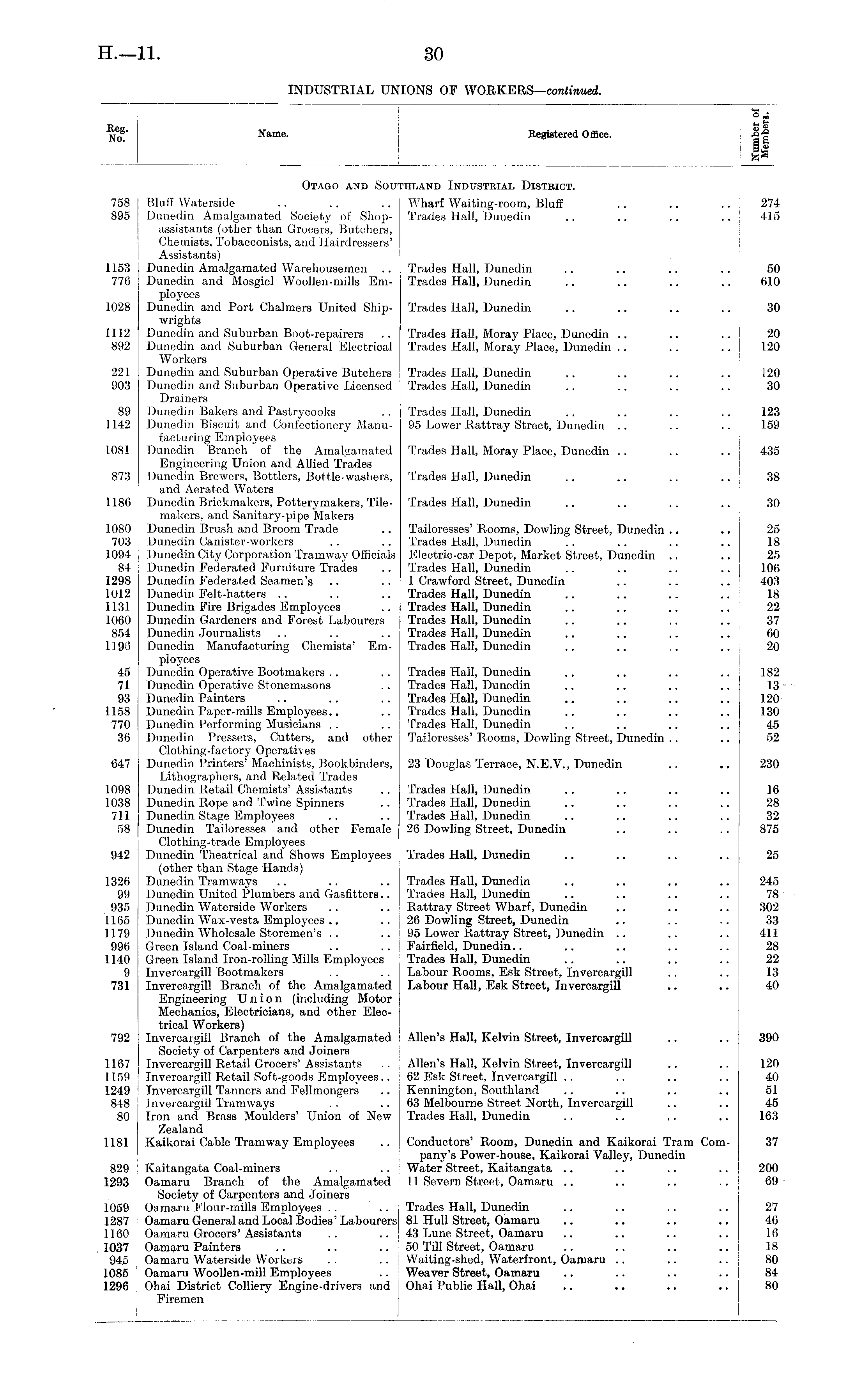 °2 Name. Registered Office. is 6 5 ® |a Otago and Southland Industrial District. 758 Bluff Waterside .. .. .. Wharf Waiting-room, Bluff .. .. .. 274 895 Dunedin Amalgamated Society of Shop- Trades Hall, Dunedin .. .. .. .. 415 assistants (other than Grocers, Butchers, Chemists, Tobacconists, and Hairdressers' Assistants) 1153 Dunedin Amalgamated Warehousemen .. Trades Hall, Dunedin .. .. .. .. 50 776 Dunedin and Mosgiel Woollen-mills Em- Trades Hall, Dunedin .. .. .. .. 610 ployees 1028 Dunedin and Port Chalmers United Ship- Trades Hall, Dunedin .. .. .. .. 30 wrights 1112 Dunedin and Suburban Boot-repairers .. Trades Hall, Moray Place, Dunedin .. .. .. 20 892 Dunedin and Suburban General Electrical Trades Hall, Moray Place, Dunedin .. .. .. 120 Workers 221 Dunedin and Suburban Operative Butchers Trades Hall, Dunedin .. .. .. .. 120 903 Dunedin and Suburban Operative Licensed Trades Hall, Dunedin .. .. .. .. 30 Drainers 89 Dunedin Bakers and Pastrycooks .. Trades Hall, Dunedin .. .. .. .. 123 1142 Dunedin Biscuit and Confectionery Manu- 95 Lower Rattray Street, Dunedin .. .. .. 159 facturing Employees 1081 Dunedin Branch of the Amalgamated Trades Hall, Moray Place, Dunedin .. .. .. 435 Engineering Union and Allied Trades 873 Dunedin Brewers, Bottlers, Bottle-washers, Trades Hall, Dunedin .. .. .. .. 38 and Aerated Waters 1186 Dunedin Brickmakers, Potterymakers, Tile- Trades Hall, Dunedin .. .. .. .. 30 makers, and Sanitary-pipe Makers 1080 Dunedin Brush and Broom Trade .. Tailoresses' Rooms, Dowling Street, Dunedin .. .. 25 703 Dunedin Canister-workers .. .. Trades Hall, Dunedin .. .. .. .. 18 1094 Dunedin City Corporation Tramway Officials Electric-car Depot, Market Street, Dunedin .. .. 25 84 Dunedin Federated Furniture Trades .. Trades Hall, Dunedin .. .. .. .. 106 1298 Dunedin Federated Seamen's .. 1 Crawford Street, Dunedin .. .. .. 403 1012 Dunedin Felt-hatters .. .. .. Trades Hall, Dunedin .. ,. .. .. 18 1131 Dunedin Fire Brigades Employees .. Trades Hall, Dunedin .. .. .. .. 22 1060 Dunedin Gardeners and Forest Labourers Trades Hall, Dunedin .. .. .. .. 37 854 Dunedin Journalists .. .. .. Trades Hall, Dunedin .. .. ,. .. 60 119li Dunedin Manufacturing Chemists' Em- Trades Hall, Dunedin .. .. .. .. 20 ployees 45 Dunedin Operative Bootmakers .. .. Trades Hall, Dunedin .. .. .. .. 182 71 Dunedin Operative Stonemasons .. Trades Hall, Dunedin .. .. .. .. 13 93 Dunedin Painters .. .. .. Trades Hall, Dunedin .. .. .. .. 120 1158 Dunedin Paper-mills Employees.. .. Trades Hall, Dunedin .. .. .. .. 130 770 Dunedin Performing Musicians .. .. Trades Hall, Dunedin .. .. .. .. 45 36 Dunedin Pressers, Cutters, and other Tailoresses' Rooms, Dowling Street, Dunedin .. .. 52 Clothing-factory Operatives 647 Dunedin Printers' Machinists, Bookbinders, 23 Douglas Terrace, N.E.V., Dunedin .. .. 230 Lithographers, and Related Trades 1098 Dunedin Retail Chemists'Assistants .. Trades Hall, Dunedin .. .. .. .. 16 1038 Dunedin Rope and Twine Spinners .. Trades Hall, Dunedin .. .. .. .. 28 711 Dunedin Stage Employees .. .. Trades Hall, Dunedin .. .. .. .. 32 58 Dunedin Tailoresses and other Female 26 Dowling Street, Dunedin .. .. .. 875 Clothing-trade Employees 942 Dunedin Theatrical and Shows Employees j Trades Hall, Dunedin .. .. .. .. 25 (other than Stage Hands) 1326 Dunedin Tramways .. .. .. Trades Hall, Dunedin .. .. .. .. 245 99 Dunedin United Plumbers and Gasfitters.. Trades Hall, Dunedin .. .. .. .. 78 935 Dunedin Waterside Workers .. .. Rattray Street Wharf, Dunedin .. .. .. 302 1165 Dunedin Wax-vesta Employees .. .. 26 Dowling Street, Dunedin .. .. .. 33 1179 Dunedin Wholesale Storemen's .. .. 95 Lower Rattray Street, Dunedin .. .. .. 411 996 Green Island Coal-miners .. .. Fairfield, Dunedin.. .. .. .. .. 28 1140 Green Island Iron-rolling Mills Employees Trades Hall, Dunedin .. .. .. .. 22 9 Invercargill Bootmakers .. .. Labour Rooms, Esk Street, Invercargill .. .. 13 731 Invercargill Branch of the Amalgamated j Labour Hall, Esk Street, Invercargill .. .. 40 Engineering Union (including Motor Mechanics, Electricians, and other Electrical Workers) 792 Invercargill Branch of the Amalgamated ! Allen's Hall, Kelvin Street, Invercargill .. .. 390 Society of Carpenters and Joiners 1167 Invercargill Retail Grocers'Assistants .. ] Allen's Hall, Kelvin Street, Invercargill .. .. 120 1159 Invercargill Retail Soft-goods Employees.. I 62 Esk Street, Invercargill .. .. .. .. 40 1249 Invercargill Tanners and Fellmongers .. Kennington, Southland .. .. .. .. 51 848 Invercargill Tramways .. 63 Melbourne Street North, Invercargill .. .. 45 80 Iron and Brass Moulders' Union of New Trades Hall, Dunedin .. .. ,. .. 163 Zealand 1181 Kaikorai Cable Tramway Employees .. Conductors' Room, Dunedin and Kaikorai Tram Com- 37 pany's Power-house, Kaikorai Valley, Dunedin 829 Kaitangata Coal-miners .. .. Water Street, Kaitangata .. .. .. .. 200 1293 Oamaru Branch of the Amalgamated 11 Severn Street, Oamaru .. .. .. .. 69 Society of Carpenters and Joiners 1059 Oamaru Flour-mills Employees .. .. Trades Hall, Dunedin .. .. .. .. 27 1287 Oamaru General and Local Bodies'Labourers! 81 Hull Street, Oamaru .. .. .. .. 46 1160 Oamaru Grocers'Assistants .. .. 43 Lune Street, Oamaru .. .. .. .. 16 1037 Oamaru Painters .. .. 50 Till Street, Oamaru .. .. .. .. 18 945 Oamaru Waterside Workers .. .. Waiting-shed> Waterfront, Oamaru .. .. .. 80 1085 Oamaru Woollen-mill Employees . . Weaver Street, Oamaru .. .. .. .. 84 1296 Ohai District Colliery Engine-drivers and Ohai Public Hall, Ohai .. .. .. .. 80 Firemen