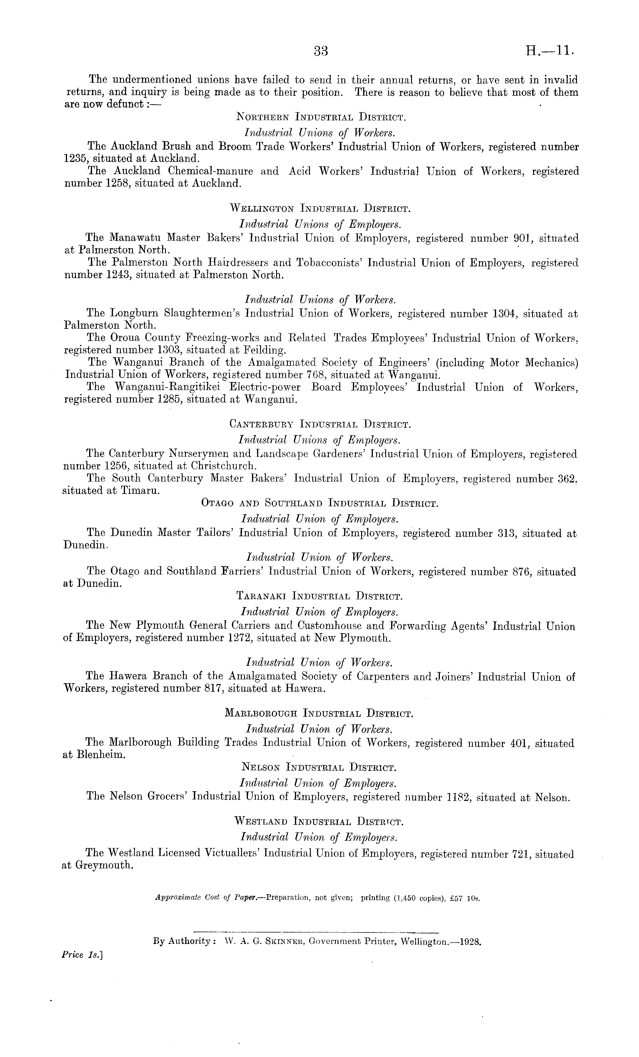 The undermentioned unions have failed to send in their annual returns, or have sent in invalid returns, and inquiry is being made as to their position. There is reason to believe that most of them are now defunct:— Northern Industrial District. Industrial Unions of Workers. The Auckland Brush and Broom Trade Workers' Industrial Union of Workers, registered number 1235, situated at Auckland. The Auckland Chemical-manure and Acid Workers' Industrial Union of Workers, registered number 1258, situated at Auckland. Wellington Industrial District. Industrial Unions of Employers. The Manawatu Master Bakers' Industrial Union of Employers, registered number 901, situated at Palmerston North. The Palmerston North Hairdressers and Tobacconists' Industrial Union of Employers, registered number 1243, situated at Palmerston North. Industrial Unions of Workers. The Longburn Slaughtermen's Industrial Union of Workers, registered number 1304, situated at Palmerston North. The Oroua County Freezing-works and Related Trades Employees' Industrial Union of Workers, registered number 1303, situated at Feilding. The Wanganui Branch of the Amalgamated Society of Engineers' (including Motor Mechanics) Industrial Union of Workers, registered number 768, situated at Wanganui. The Wanganui-Rangitikei Electric-power Board Employees' Industrial Union of Workers, registered number 1285, situated at Wanganui. Canterbury Industrial District. Industrial Unions of Employers. The Canterbury Nurserymen and Landscape Gardeners' Industrial Union of Employers, registered number 1256, situated at Christchurch. The South Canterbury Master Bakers' Industrial Union of Employers, registered number 362, situated at Timaru. Otago and Southland Industrial District. Industrial Union of Employers. The Dunedin Master Tailors' Industrial Union of Employers, registered number 313, situated at Dunedin. Industrial Union of Workers. The Otago and Southland Farriers' Industrial Union of Workers, registered number 876, situated at Dunedin. Taranaki Industrial District. Industrial Union of Employers. The New Plymouth General Carriers and Customhouse and Forwarding Agents' Industrial Union of Employers, registered number 1272, situated at New Plymouth. Industrial Union of Workers. The Hawera Branch of the Amalgamated Society of Carpenters and Joiners' Industrial Union of Workers, registered number 817, situated at Hawera. Marlborough Industrial District. Industrial Union of Workers. The Marlborough Building Trades Industrial Union of Workers, registered number 401, situated at Blenheim. Nelson Industrial District. Industrial Union of Employers. The Nelson Grocers' Industrial Union of Employers, registered number 1182, situated at Nelson. Westland Industrial District. Industrial Union of Employers. The Westland Licensed Victuallers' Industrial Union of Employers, registered number 721, situated at Greymouth.