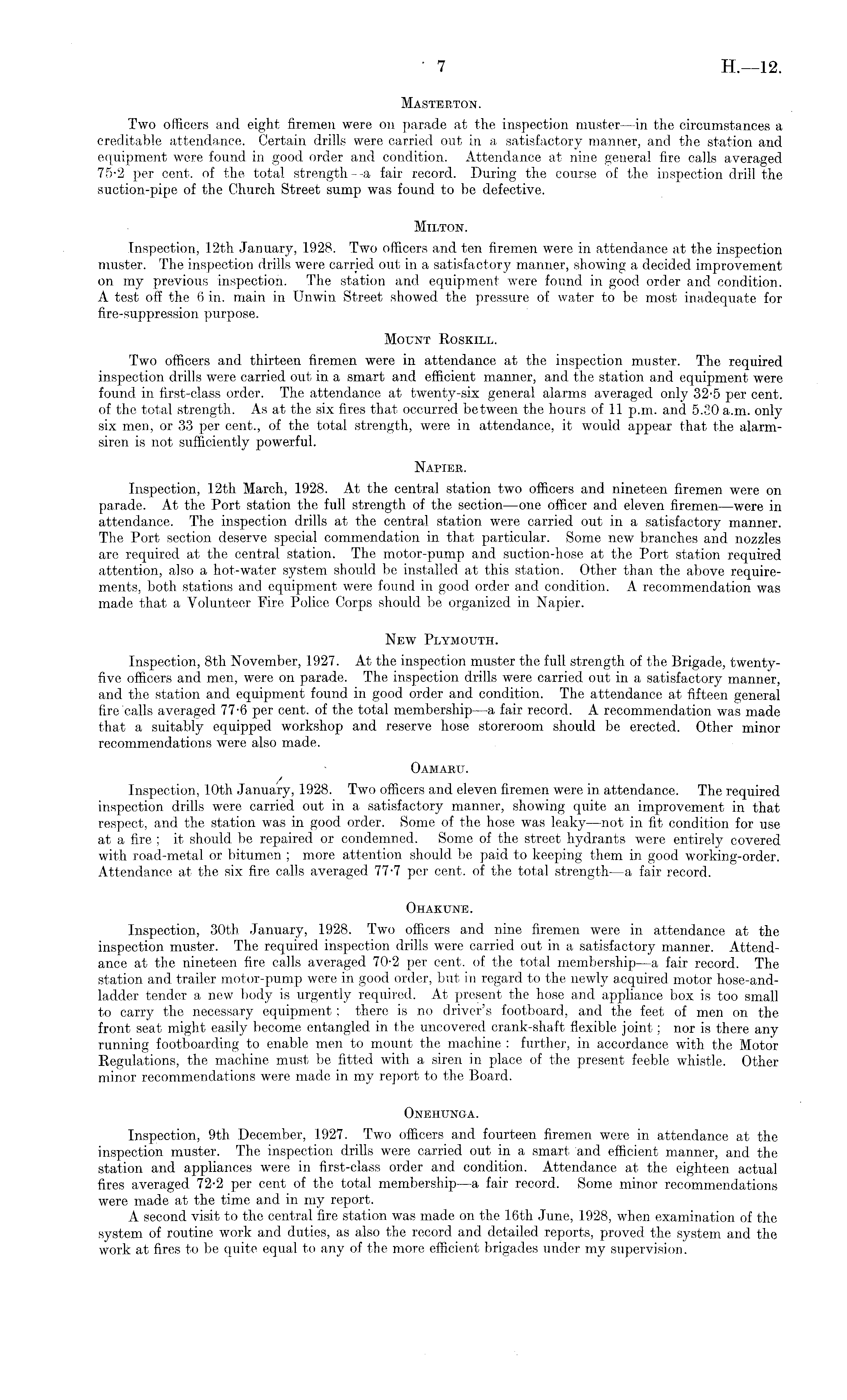 Masterton. Two officers and eight firemen were 011 parade at the inspection muster —in the circumstances a creditable attendance. Certain drills were carried out in a satisfactory manner, and the station and equipment were found in good order and condition. Attendance at nine general fire calls averaged 75-2 per cent, of the total strength—-a fair record. During the course of the inspection drill the suction-pipe of the Church Street sump was found to be defective. Milton. Inspection, 12th January, 1928. Two officers and ten firemen were in attendance at the inspection muster. The inspection drills were carried out in a satisfactory manner, showing a decided improvement on my previous inspection. The station and equipment were found in good order and condition. A test off the 6 in. main in Unwin Street showed the pressure of water to be most inadequate for fire-suppression purpose. Mount Roskill. Two officers and thirteen firemen were in attendance at the inspection muster. The required inspection drills were carried out in a smart and efficient manner, and the station and equipment were found in first-class order. The attendance at twenty-six general alarms averaged only 32-5 per cent, of the total strength. As at the six fires that occurred between the hours of 11 p.m. and 5.30 a.m. only six men, or 33 per cent., of the total strength, were in attendance, it would appear that the alarmsiren is not sufficiently powerful. Napier. Inspection, 12th March, 1928. At the central station two officers and nineteen firemen were on parade. At the Port station the full strength of the section—one officer and eleven firemen—were in attendance. The inspection drills at the central station were carried out in a satisfactory manner. The Port section deserve special commendation in that particular. Some new branches and nozzles are required at the central station. The motor-pump and suction-hose at the Port station required attention, also a hot-water system should be installed at this station. Other than the above requirements, both stations and equipment were found in good order and condition. A recommendation was made that a Volunteer Fire Police Corps should be organized in Napier. New Plymouth. Inspection, Bth November, 1927. At the inspection muster the full strength of the Brigade, twentyfive officers and men, were on parade. The inspection drills were carried out in a satisfactory manner, and the station and equipment found in good order and condition. The attendance at fifteen general fire calls averaged 77-6 per cent, of the total membership—a fair record. A recommendation was made that a suitably equipped workshop and reserve hose storeroom should be erected. Other minor recommendations were also made. OAMABU. / Inspection, 10th January, 1928. Two officers and eleven firemen were in attendance. The required inspection drills were carried out in a satisfactory manner, showing quite an improvement in that respect, and the station was in good order. Some of the hose was leaky —not in fit condition for use at a fire ; it should be repaired or condemned. Some of the street hydrants were entirely covered with road-metal or bitumen ; more attention should be paid to keeping them in good working-order. Attendance at the six fire calls averaged 77-7 per cent, of the total strength—a fair record. Ohakune. Inspection, 30th January, 1928. Two officers and nine firemen were in attendance at the inspection muster. The required inspection drills were carried out in a satisfactory manner. Attendance at the nineteen fire calls averaged 70-2 per cent, of the total membership—a fair record. The station and trailer motor-pump were in good order, but in regard to the newly acquired motor hose-and-ladder tender a new body is urgently required. At present the hose and appliance box is too small to carry the necessary equipment ; there is no driver's footboard, and the feet of men on the front seat might easily become entangled in the uncovered crank-shaft flexible joint; nor is there any running footboarding to enable men to mount the machine : further, in accordance with the Motor Regulations, the machine must be fitted with a siren in place of the present feeble whistle. Other minor recommendations were made in my report to the Board. Onehunga. Inspection, 9th December, 1.927. Two officers and fourteen firemen were in attendance at the inspection muster. The inspection drills were carried out in a smart and efficient manner, and the station and appliances were in first-class order and condition. Attendance at the eighteen actual fires averaged 72-2 per cent of the total membership—a fair record. Some minor recommendations were made at the time and in my report. A second visit to the central fire station was made on the 16th June, 1928, when examination of the system of routine work and duties, as also the record and detailed reports, proved the system and the work at fires to be quite equal to any of the more efficient brigades under my supervision.