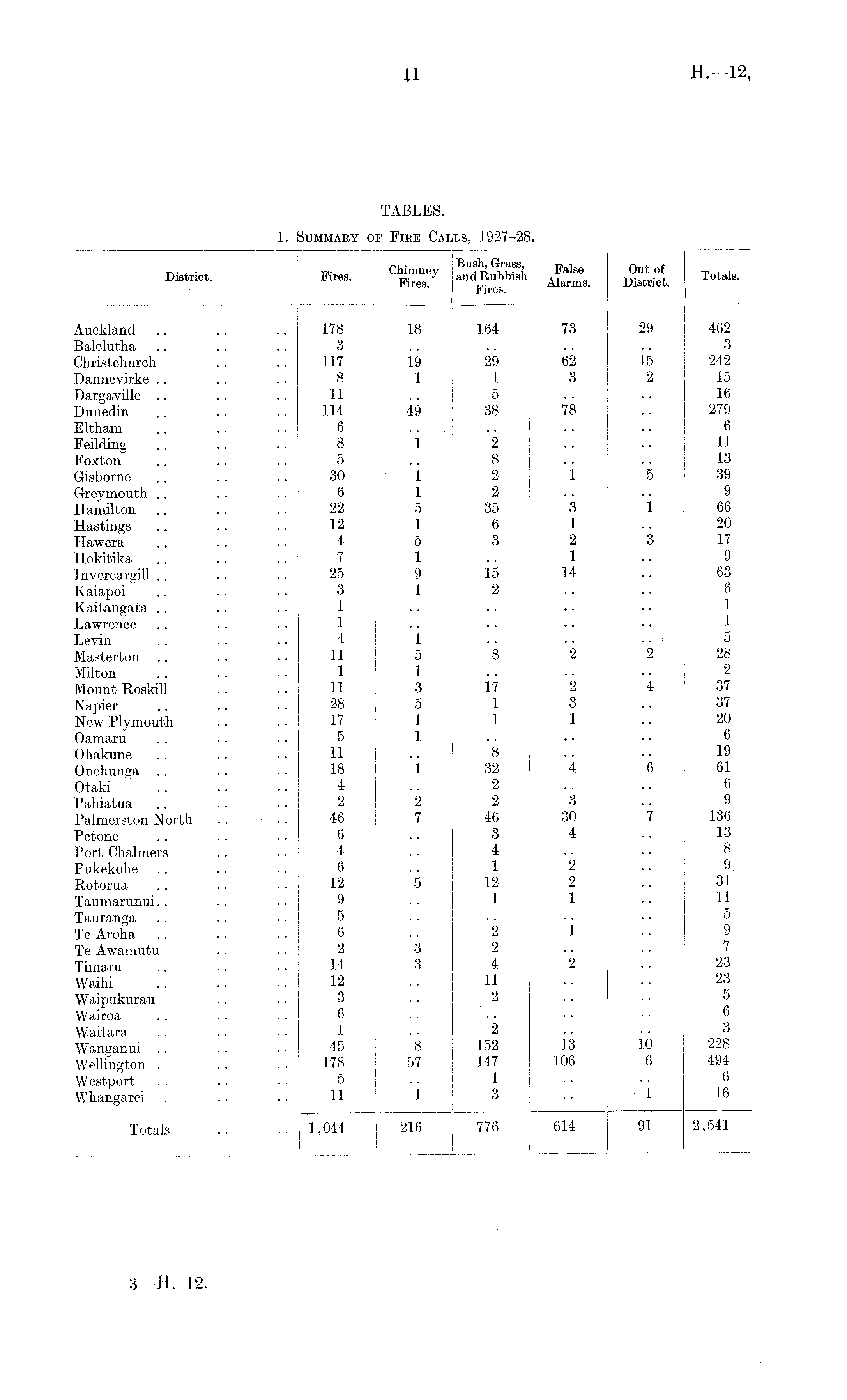 Distriot ' Fires - C Fi?e n s ? y aad F t U e f Att. District. I Totals " i I Auckland .. .. .. 178 18 164 73 29 462 Balclutha . . .. .. 3 .. .. .. .. 3 Christchurch .. ..117 19 29 62 15 242 Dannevirke .. . . .. 8 1 1 3 2 15 Dargaville .. . . .. 11 .. 5 .. .. 16 Dunedin .. .. .. 114 49 38 78 .. 279 Eltham .. . . .. 6 .. .. 6 Feilding .. .. .. 8 1 2 .. .. 11 Foxton .. .. .. 5 .. 8 .. .. 13 Gisborne .. .. 30 1 2 1 5 39 Greymouth .. .. .. 6 1 2 .. .. 9 Hamilton .. . . 22 5 35 3 1 66 Hastings .. .. 12 1 6 1 .. 20 Hawera .. .. .. 4 5 3 2 3 17 Hokitika .. .. .. 7 1 .. 1 .. 9 Invercargill .. . . 25 9 15 14 .. 63 Kaiapoi .. .. .. 3 1 2 .. .. 6 Kaitangata .. .. .. 1 . • ■ • • • • • 1 Lawrence .. .. . . 1 Levin .. .. .. 4 1 .. .. .. • 5 Masterton .. .. .. 115 8 2 2 28 Milton .. . . • • 1 1 I • • • ■ 2 Mount Roskill .. .. . 11 3 17 2 4 37 Napier .. .. .. 28 5 1 3 .. 37 New Plymouth .. . . I 17 1 1 1 .. 20 Oamaru .. .. .. 5 1 .. .. . • 6 Obakune .. .. . . 11 .. 8 .. .. 19 Onehunga .. .. . . 18 ] 1 32 4 6 61 Otaki .. .. .. 4 I 2 .. .. 6 Pahiatua .. . . . . 2:2 2 3 .. 9 Palmerston Nortli .. 46 7 46 30 7 136 Petone .. . . .. 6 .. 3 4 .. 13 Port Chalmers .. .. 4 .. 4 .. .. 8 Pukekohe .. .. ■. 6 ! 1 2 .. 9, Rotorua .. .. 12 5 12 2 .. 31 Taumarunui.. .. 9 ! . . 1 1 11 Tauranga .. .. .. 5 ! . . . • • • 5 Te Aroha .. .. .. 6 2 1 .. 9 Te Awamutu .. .. 2,3 2 .. .. 7 Timaru .. .. .. 14 3 4 2 .. 23 Waihi .. . . . . i 12 . . 11 • • • • 23 Waipukurau .. .. j 3 : 2 .. .. 5 Wairoa .. . . .. 6 .. . . .. • • 6 Waitara, .. .. .. 1 • • 2 .. . . 3 Wanganui .. . . .. 45 8 152 13 10 228 Wellington . . . . . 178 57 147 106 6 494 Westport .. .. ■■ 5 | 1 6 Whangarei .. .. .. 11 1 3 .. 1 16 Totals .. 1,044 j 216 776 614 91 2,541 |