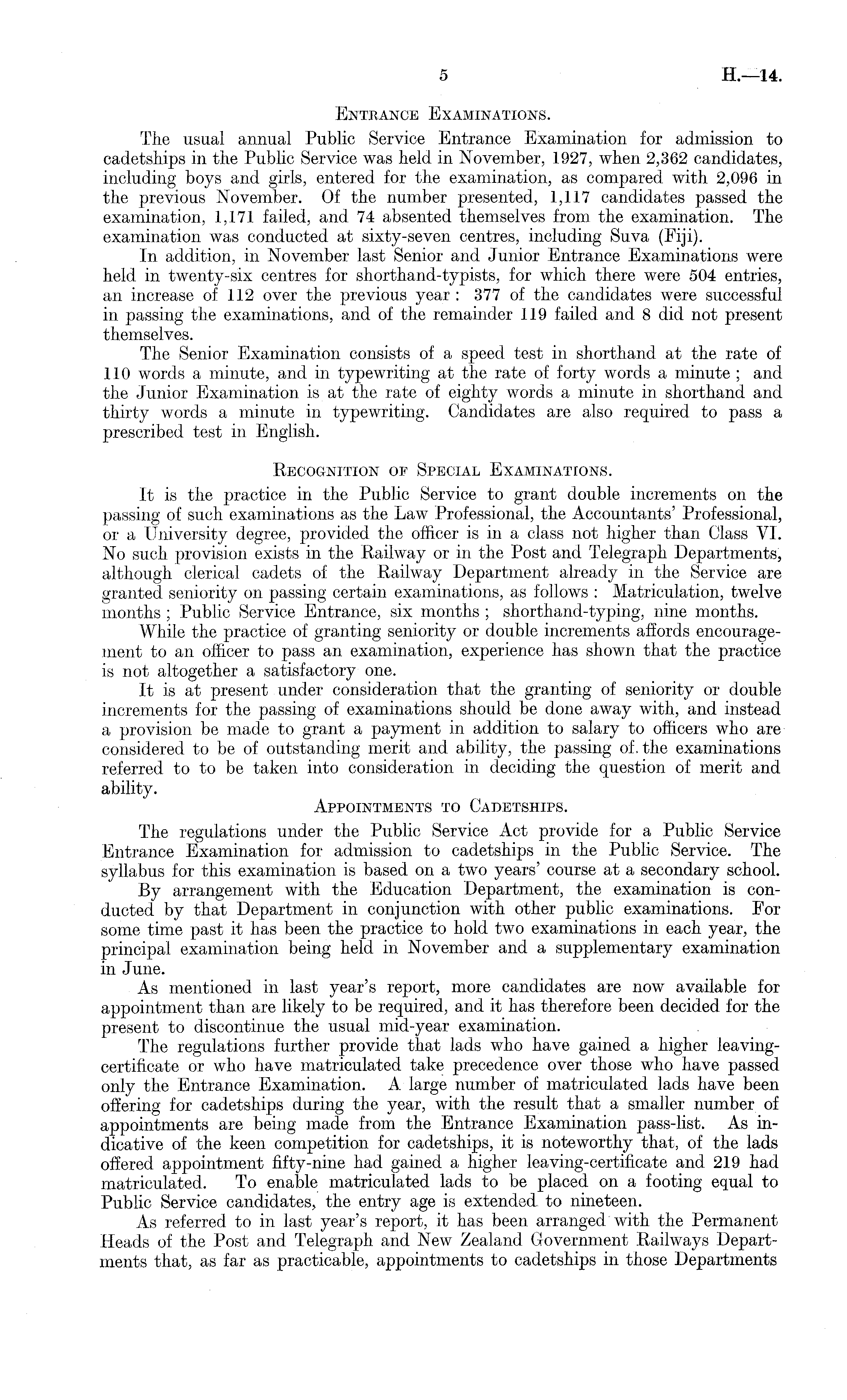 Entrance Examinations. The usual annual Public Service Entrance Examination for admission to cadetships in the Public Service was held in November, 1927, when 2,362 candidates, including boys and girls, entered for the examination, as compared with 2,096 in the previous November. Of the number presented, 1,117 candidates passed the examination, 1,171 failed, and 74 absented themselves from the examination. The examination was conducted at sixty-seven centres, including Suva (Fiji). In addition, in November last Senior and Junior Entrance Examinations were held in twenty-six centres for shorthand-typists, for which there were 504 entries, an increase of 112 over the previous year : 377 of the candidates were successful in passing the examinations, and of the remainder 119 failed and 8 did not present themselves. The Senior Examination consists of a speed test in shorthand at the rate of 110 words a minute, and in typewriting at the rate of forty words a minute ; and the Junior Examination is at the rate of eighty words a minute in shorthand and thirty words a minute in typewriting. Candidates are also required to pass a prescribed test in English. Recognition of Special Examinations. It is the practice in the Public Service to grant double increments on the passing of such examinations as the Law Professional, the Accountants' Professional, or a University degree, provided the officer is in a class not higher than Class VI. No such provision exists in the Railway or in the Post and Telegraph Departments, although clerical cadets of the Railway Department already in the Service are granted seniority on passing certain examinations, as follows : Matriculation, twelve months ; Public Service Entrance, six months ; shorthand-typing, nine months. While the practice of granting seniority or double increments affords encouragement to an officer to pass an examination, experience has shown that the practice is not altogether a satisfactory one. It is at present under consideration that the granting of seniority or double increments for the passing of examinations should be done away with, and instead a provision be made to grant a payment in addition to salary to officers who are considered to be of outstanding merit and ability, the passing of, the examinations referred to to be taken into consideration in deciding the question of merit and ability. Appointments to Cadetships. The regulations under the Public Service Act provide for a Public Service Entrance Examination for admission to cadetships in the Public Service. The syllabus for this examination is based on a two years' course at a secondary school. By arrangement with the Education Department, the examination is conducted by that Department in conjunction with other public examinations. For some time past it has been the practice to hold two examinations in each year, the principal examination being held in November and a supplementary examination in June. As mentioned in last year's report, more candidates are now available for appointment than are likely to be required, and it has therefore been decided for the present to discontinue the usual mid-year examination. The regulations further provide that lads who have gained a higher leavingcertificate or who have matriculated take precedence over those who have passed only the Entrance Examination. A large number of matriculated lads have been offering for cadetships during the year, with the result that a smaller number of appointments are being made from the Entrance Examination pass-list. As indicative of the keen competition for cadetships, it is noteworthy that, of the lads offered appointment fifty-nine had gained a higher leaving-certificate and 219 had matriculated. To enable matriculated lads to be placed on a footing equal to Public Service candidates, the entry age is extended to nineteen. As referred to in last year's report, it has been arranged'with the Permanent Heads of the Post and Telegraph and New Zealand Government Railways Departments that, as far as practicable, appointments to cadetships in those Departments
