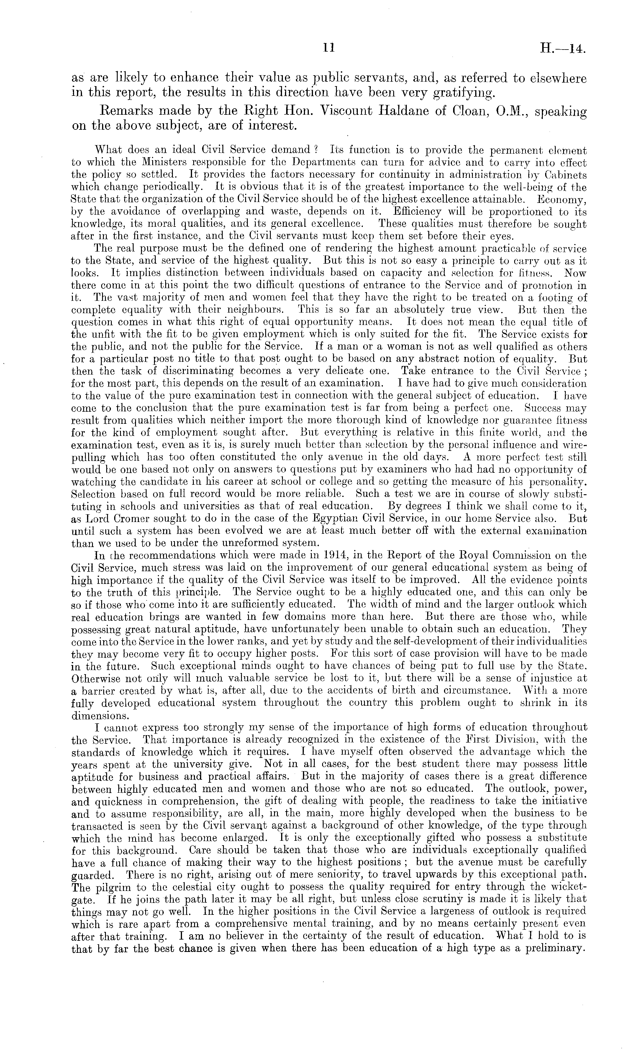 as are likely to enhance their value as public servants, and, as referred to elsewhere in this report, the results in this direction have been very gratifying. Remarks made by the Right Hon. Viscount Ilaldane of Cloan, 0.M., speaking on the above subject, are of interest. What does an ideal Civil Service demand ? Its function is to provide the permanent element to which the Ministers responsible for the Departments can turn for advice and to carry into effect the policy so settled. It provides the factors necessary for continuity in administration by Cabinets which change periodically. It is obvious that it is of the greatest importance to the well-being of the State that the organization of the Civil Service should be of the highest excellence attainable. Economy, by the avoidance of overlapping and waste, depends on it. Efficiency will be proportioned to its knowledge, its moral qualities, and its general excellence. These qualities must therefore be sought after in the first instance, and the Civil servants must keep them set before their eyes. The real purpose must be the defined one of rendering the highest amount practicable of service to the State, and service of the highest quality. But this is not so easy a principle to carry out as it looks. It implies distinction between individuals based on capacity and selection for fitness. Now there come in at this point the two difficult questions of entrance to the Service and of promotion in it. The vast majority of men and women feel that they have the right to be treated on a footing of complete equality with their neighbours. This is so far an absolutely true view. But then the question comes in what this right of equal opportunity means. It does not mean the equal title of the unfit with the fit to be given employment which is only suited for the fit. The Service exists for the public, and not the public for the Service. If a man or a woman is not as well qualified as others for a particular post no title to that post ought to be based on any abstract notion of equality. But then the task of discriminating becomes a very delicate one. Take entrance to the Civil Service ; for the most part, this depends on the result of an examination. I have had to give much consideration to the value of the pure examination test in connection with the general subject of education. I have come to the conclusion that the pure examination test is far from being a perfect one. Success may result from qualities which neither import the more thorough kind of knowledge nor guarantee fitness for the kind of employment sought after. But everything is relative in this finite world, and the examination test, even as it is, is surely much better than selection by the personal influence and wirepulling which has too often constituted the only avenue in the old days. A more perfect test still would be one based not only on answers to questions put by examiners who had had no opportunity of watching the candidate in his career at school or college and so getting the measure of his personality. Selection based on full record would be more reliable. Such a test we are in course of slowly substituting in schools and universities as that of real education. By degrees I think we shall come to it, as Lord Cromer sought to do in the case of the Egyptian Civil Service, in our home Service also. But until such a system has been evolved we are at least much better off with the external examination than we used to be under the unreformed system. In the recommendations which were made in 1914, in the Report of the Royal Commission on the Civil Service, much stress was laid oil the improvement of our general educational system as being of high importance if the quality of the Civil Service was itself to be improved. All the evidence points to the truth of this principle. The Service ought to be a highly educated one, and this can only be so if those who'come into it are sufficiently educated. The width of mind and the larger outlook which real education brings are wanted in few domains more than here. But there are those who, while possessing great natural aptitude, have unfortunately been unable to obtain such an education. They come into the Service in the lower ranks, and yet by study and the self-development of their individualities they may become very fit to occupy higher posts. For this sort of case provision will have to be made in the future. Such exceptional minds ought to have chances of being put to full use by the State. Otherwise not only will much valuable service be lost to it, but there will be a sense of injustice at a barrier created by what is, after all, due to the accidents of birth and circumstance. With a more fully developed educational system throughout the country this problem ought to shrink in its dimensions. I cannot express too strongly my sense of the importance of high forms of education throughout the Service. That importance is already recognized in the existence of the First Division, with the standards of knowledge which it requires. I have myself often observed the advantage which the years spent at the university give. Not in all cases, for the best student there may possess little aptitude for business and practical affairs. But in the majority of cases there is a great difference between highly educated men and women and those who are not so educated. The outlook, power, and quickness in comprehension, the gift of dealing with people, the readiness to take the initiative and to assume responsibility, are all, in the main, more highly developed when the business to be transacted is seen by the Civil servant against a background of other knowledge, of the type through which the mind has become enlarged. It is only the exceptionally gifted who possess a substitute for this background. Care should be taken that tho.se who are individuals exceptionally qualified have a full chance of making their way to the highest positions ; but the avenu