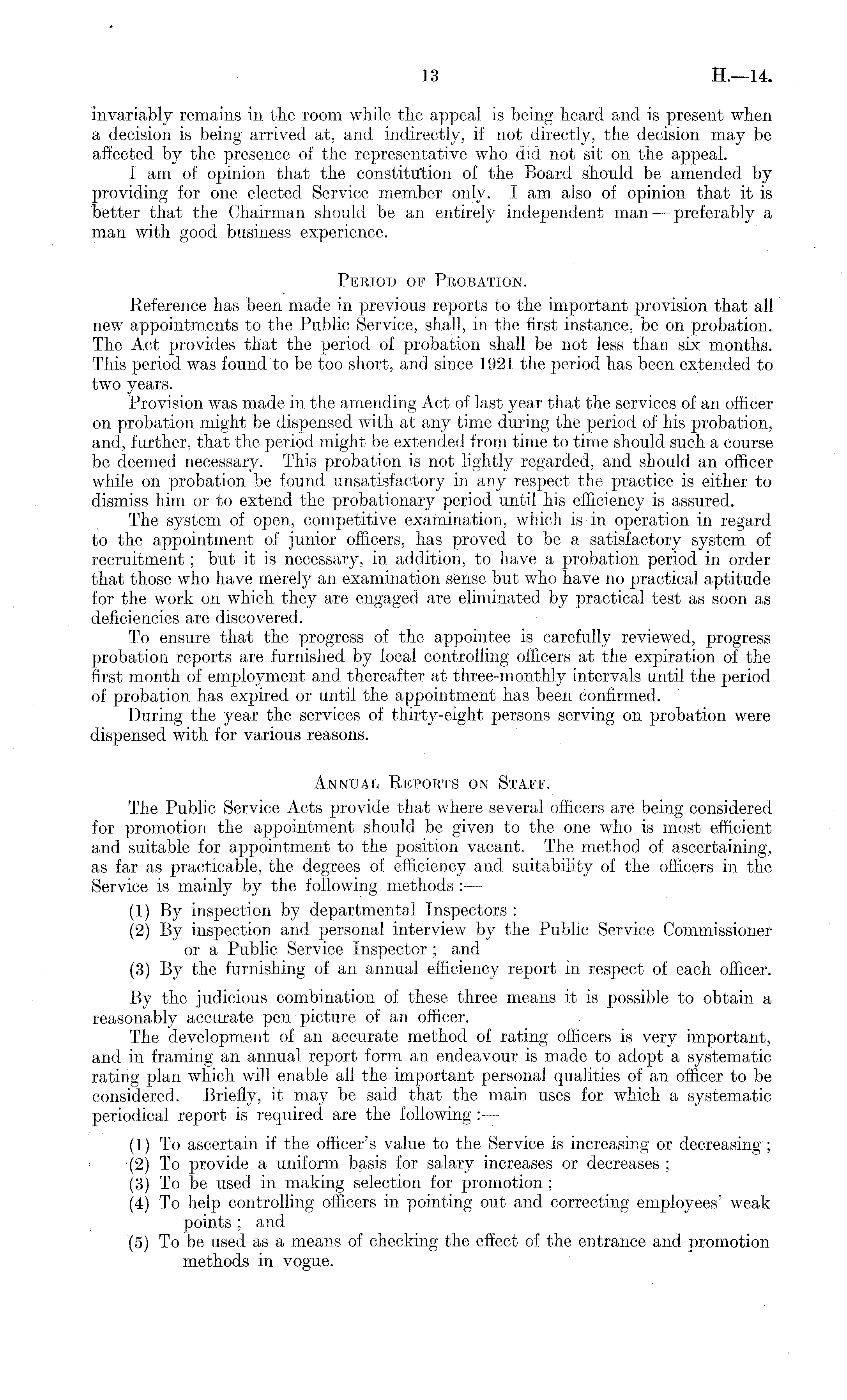 invariably remains in the room while the appeal is being heard and is present when a decision is being arrived at, and indirectly, if not directly, the decision may be affected by the presence of the representative who did not sit on the appeal. I am of opinion that the constitution of the Board should be amended by providing for one elected Service member only. I am also of opinion that it is better that the Chairman should be an entirely independent man — preferably a man with good business experience. Period of Probation. Reference has been made in previous reports to the important provision that all new appointments to the Public Service, shall, in the first instance, be on probation. The Act provides that the period of probation shall be not less than six months. This period was found to be too short, and since 1921 the period has been extended to two years. Provision was made in the amending Act of last year that the services of an officer on probation might be dispensed with at any time during the period of his juobation, and, further, that the period might be extended from time to time should such a course be deemed necessary. This probation is not lightly regarded, and should an officer while on probation be found unsatisfactory in any respect the practice is either to dismiss him or to extend the probationary period until his efficiency is assured. The system of open, competitive examination, which is in operation in regard to the appointment of junior officers, has proved to be a satisfactory system of recruitment; but it is necessary, in addition, to have a probation period in order that those who have merely an examination sense but who have no practical aptitude for the work on which they are engaged are eliminated by practical test as soon as deficiencies are discovered. To ensure that the progress of the appointee is carefully reviewed, progress probation reports are furnished by local controlling officers at the expiration of the first month of employment and thereafter at three-monthly intervals until the period of j)robation has expired or until the appointment has been confirmed. During the year the services of thirty-eight, persons serving on probation were dispensed with for various reasons. Annual Reports on Staff. The Public Service Acts provide that where several officers are being considered for promotion the appointment should be given to the one who is most efficient and suitable for appointment to the position vacant. The method of ascertaining, as far as practicable, the degrees of efficiency and suitability of the officers in the Service is mainly by the following methods : — (1) By inspection by departmental Inspectors : (2) By inspection and personal interview by the Public Service Commissioner or a Public Service Inspector ; and (3) By the furnishing of an annual efficiency report in respect of each officer. By the judicious combination of these three means it is possible to obtain a reasonably accurate pen picture of an officer. The development of an accurate method of rating officers is very important, and in framing an annual report form an endeavour is made to adopt a systematic rating plan which will enable all the important personal qualities of an officer to be considered. Briefly, it may be said that the main uses for which a systematic periodical report is required are the following : — (1) To ascertain if the officer's value to the Service is increasing or decreasing ; (2) To provide a uniform basis for salary increases or decreases ; (3) To be used in making selection for promotion ; (4) To help controlling officers in pointing out and correcting employees' weak points ; and (5) To be used as a means of checking the effect of the entrance and promotion methods in vogue.
