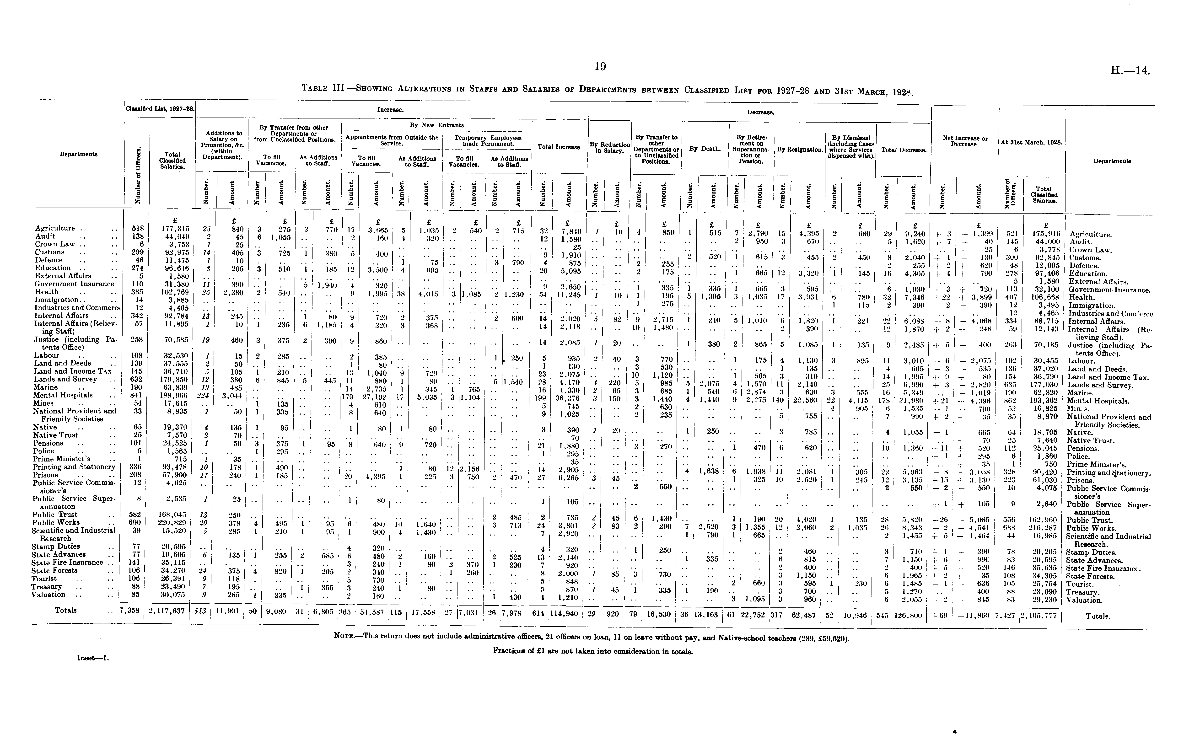 Classified List, 1927-28. Increase. Decrease. Transfer from other By New Entrants. Salaryon° from Uncl^sTfipd' Positions Appointments from Outside the Temporary Employees By Transfer to By Retire- By Dismissal Net Increase or .. c _ . __ u , noo Promotion. &c. Service. made Permanent. T«f.i By Reduction _ other _ _ ment on _ (including Cases Decrease. At 31st March, 1928. g (within e " in Salary. Departments or J>y Death. Superannua- By Resignation, where Services Total Decrease. Departments | Department). To All As Additions To fill As Additions To All As Additions t0 p L 0 " c ' a n =;i fled p"™:™ dispensed with). Benartments ® Salaries. Vacancies. to Staff. Vacancies. to Staff. Vacancies. to Staff. Positions. Pension. Departments 0 _ I * — • 1 I I ! I 1 1 l 1 I! | I; ! 11 § i § I § I i i * $ * i\ i 6 i s i i a' Is Total - I I ligge § si sosgs § aie§ sSsSa §•=§ •§ ! -f § l! classified * * j * j j_Mj j < g| I & I I I ' I g 4 & I g I 1 j I I I I I J I I I |1 | || j Salaries. Agriculture .. .. 518 177,315 25 840 3 275 3 770 17 3,665 5 1,035 2 540 2 7 f 5 32 7?840 1 K) 4 850 1 515 7 2,790 15 4,395 2 680 29 9,240 + 3 - 1 £ .399 521 Agriculture. Crown Law )) )) 1)?53 1 25 . )) )) . 320 )) )) )) )" 12 2 950 3 6 l) 6 20 + 7 - 40 145 44,000 A*udit. Defenetf " " "46 u'475 '[ *10 3 725 * 380 5 400 j •• •• 9 1 > 910 2 520 i ei.5 3 '455 2 '450 8 2) 040 +"l - 130 300 92,' 845 Customs.'"' Education " " 274 96 616 S 205 i 510 "l 18* 19 knn a Ran " " i 875 " •• 2 255 2 255 + 2 + 620 48 12,095 Defence. External Affairs )) "5 1)580 . . " " 2 175 " " 1 665 12 3,320 1 145 16 4 > 305 + 4 + 790 278 97,406 Education. Government Insurance 110 31,380 11 390 .. 5 1 940 4 T?0 a 9 «ka " " "1 'i«. 'J AA,- AA, '"' •• •• •• •• •• ■■ ® 1,580 External Affairs. Health 385 10 9 769 25 2 380 9 540 <1 1 aa* qo .A , A A. 'A . 9 ,7'2*?? " ® 9 ® "■ [• ® 1,930 + 3 + 720 113 32,100 Government Insurance. Immigration)! )) 14 i'885 . " " 11,245 1 10 1 195 5 1,395 3 1,035 17 3,931 6 780 32 7,346 +22 + 3,899 407 106,668 Health. Industries and Commerce 12 4,465 ..... •■••■..... 1 ~7o .. .. .. .. .. .. 1 115 2 390 2 390 12 3,495 Immigration. •* as t *-?„ -i » J j s ! S :: :') « ~ » Jffl .' « i KS ~ • •« )| » g S fi + ~ i: X * 8$ sCl JU te t nt e sOffic5 ding Pa " 258 70,585 19 460 3 375 2 390 9 860 14 2 ' 085 2 20 - •• 1 380 2 865 5 1-085 1 135 9 2,485 + 5 - 400 263 70,185 PaDeeds .') }s9 37)555 2 50 2 " " 1 1 , 250 ? ?30 2 4 ° ? Ion " " 1 3 895 11 3 ' 0I ° ~ 6 " 2 ' 075 102 30 ' 455 LaW. 0^' Land and Income Tax 145 36,710 5 105 1 2io " 13 1 040 9 '720 23 2 07? " " J : i 135 .. . 4 665 - 3 - 535 136 37,020 Land and Deeds. Survey .. 632 179,850 12 380 6 845 5 445 11 '880 j 80 ). .. ' 5 1,540 28 +170 "i 220 5 ' 9 85 5 2,075 4 1,570 11 2,HO )) ) 25 + 3 t 2,820 635 L^TnVs^Te^' Me t lHospita 1 s )) 841 18 8 )966 3,044 ). .. )) )) li ll,l% )) )) I iS I 1 5 S 22 4 M « +21 + Z iSS £Sh^ National Provident and 33 8)835 i "50 1 is )) )' 8 640 9 , 025 " " I 23° : '' _ 4 « 1,535 - 1 _ 790 53 16,825 Mhus Friendly Societies '* *' 1,025 .. .. 2 23o .. .. .. .. o 755 .. .. 7 990 -f- 2 + 35 35 8,870 National Provident and S£w" :: 1 'K I ™ .! 95 •• 1 80 1 80 » «g > » •• •• > » •• » »» •• >,« - . - ~ ™ RBr :: :: "i 1:15 ? g * • , 640 ♦ ~ :: :: » « >« :: » '» :: "> » • « :: :: ■;» + «? •» »:S Prime Minister's .. 1 715 i 35 .. | " " " " " " •• *• •• -• *• •• + ' " 295 6 1,860 Police. Suw ? Is » r 1 « :: i - * - S « : i « , ? '« S IS ! g 1 lis ;i I IS S S:S &*&->■ sioner's " " * " " "" *" " *" " " •" " •• 2 550 — 2 — 550 10 4,075 Public Service CommisPublic Service Super- 8 2,535 1 25 .... .. 1 80 1 lot; , „ , ... _ sioner's annuation •• •• + 1 + 105 9 2,640 Public Service SuperPublic WoTks " 690 2^0'829 20 378 4 495 'i 'k 'isn in " l J o 735 2 45 6 1,430 " •• 1 190 20 4 - 020 1 135 28 5 > 820 ~ 26 -5,085 556 162,960 PuM^TruS. - »:«• 5 S { S i| S ! S '2 i« :: :: ♦ 7,3 f Iffl .f 83 .' .r I '« I '« 12 3 : M0 « 'f 1 88 ?! + " 1:52 6 S V&gi Si,« )) 77 19)605 6 'i 3 5 'i 255 2 585 6 ; 2 'ieo )) )) 2 525 13 2 140 " " 1 'i 335 " " I tfs " " 7 1 150 + 6 + 99C 83 20 StTAd"^' State Fire Insurance .. 141 35,115 .... 3 240 1 80 2 170 l 9Qn 7 Q90 " " , 8 iX T ' 50 6 99C 83 20,595 State Advances. gsf— •• Z Itill % g 4 820 ' * I g •• .. « -i a » •» :: :: :: :: I J8 :: :: I iSJ { g g S;g UK""- :: :: i S« g ; ; i ' « g 'i "» " " J-'i - ... .! - I g ,f 5 i;g = S g l:S • Valuato .. .. 30,075 1 335 . ■ .. 2 160 | .. 1 430 4 1,210 3 l )0 95 3 960 .. .. 6 2,055 - 2 - 845 83 29,230 Valuation. Totals .. 7,358 j 2,117,637 ol3 11,901 | 50 9,080 31 6,805 365 54,587 |ll5 17,558 27 7,031 26 7,978 614 114,940 29 920 j 79 16,530 36 13,163 61 22,752 317 62,487 52 10,946 545 126,800 +69 —11,860 7,427 2,105,777 Total?. Note.—This return does not include administrative officers, 21 officers on loan, 11 on leave without pay, and Native-school teachers (289, £59,820). Fractions of £1 are not taken into consideration in totals.