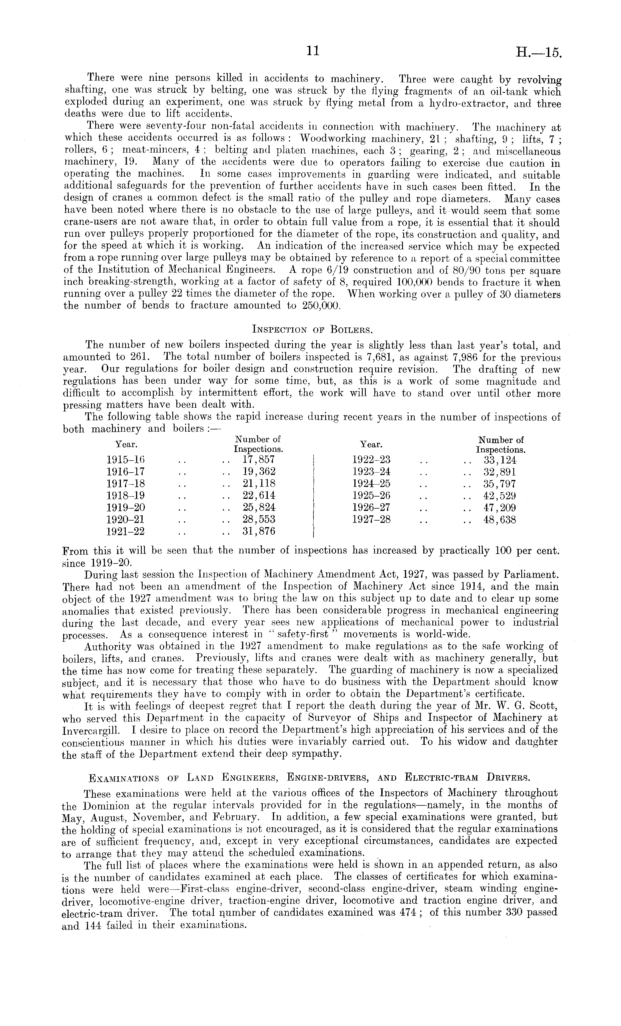 There were nine persons killed in accidents to machinery. Three were caught by revolving shafting, one was struck by belting, one was struck by the flying fragments of an oil-tank which exploded during an experiment, one was struck by flying metal from a hydro-extractor, and three deaths were due to lift accidents. There were seventy-four non-fatal accidents in connection with machinery. The machinery at which these accidents occurred is as follows : Woodworking machinery, 21 ; shafting, 9 ; lifts, 7 ; rollers, 6 ; meat-mincers, 4 ; belting and platen machines, each 3 ; gearing, 2 ; and miscellaneous machinery, 19. Many of the accidents were due to operators failing to exercise due caution in operating the machines. In some cases improvements in guarding were indicated, and suitable additional safeguards for the prevention of further accidents have in such cases been fitted. In the design of cranes a common defect is the small ratio of the pulley and rope diameters. Many cases have been noted where there is no obstacle to the use of large pulleys, and it would seem that some crane-users are not aware that, in order to obtain full value from a rope, it is essential that it should run over pulleys properly proportioned for the diameter of the rope, its construction and quality, and for the speed at which it is working. An indication of the increased service which may be expected from a rope running over large pulleys may be obtained by reference to a report of a special committee of the Institution of Mechanical Engineers. A rope 6/19 construction and of 80/90 tons per square inch breaking-strength, working at a factor of safety of 8, required 100,000 bends to fracture it when running over a pulley 22 times the diameter of the rope. When working over a pulley of 30 diameters the number of bends to fracture amounted to 250,000. Inspection op Boilers. The number of new boilers inspected during the year is slightly less than last year's total, and amounted to 261. The total number of boilers inspected is 7,681, as against 7,986 for the previous year. Our regulations for boiler design and construction require revision. The drafting of new regulations has been under way for some time, but, as this is a work of some magnitude and difficult to accomplish by intermittent effort, the work will have to stand over until other more pressing matters have been dealt with. The following table shows the rapid increase during recent years in the number of inspections of both machinery and boilers : — Year. T Numb f of Year. T Numl > er of inspections. Inspections. 1915-16 .. .. 17,857 1922-23 .. .. 33,124 1916-17 .. .. 19,362 1923-24 .. .. 32,891 1917-18 .. .. 21,118 1924-25 .. .. 35,797 1918-19 .. .. 22,614 1925-26 .. .. 42,529 1919-20 .. .. 25,824 1926-27 .. .. 47,209 1920-21 .. .. 28,553 1927-28 .. .. 48,638 1921-22 .. .. 31,876 From this it will be seen that the number of inspections has increased by practically 100 per cent, since 1919-20. During last session the Inspection of Machinery Amendment Act, 1927, was passed by Parliament. There, had not been an amendment of the Inspection of Machinery Act since 1914, and the main object of the 1927 amendment was to bring the law on this subject up to date and to clear up some anomalies that existed previously. There has been considerable progress in mechanical engineering during the last decade, and every year sees new applications of mechanical power to industrial processes. As a consequence interest in " safety-first " movements is world-wide. Authority was obtained in the 1927 amendment to make regulations as to the safe working of boilers, lifts, and cranes. Previously, lifts and cranes were dealt with, as machinery generally, but the time has now come for treating these separately. The guarding of machinery is now a specialized subject, and it is necessary that those who have to do business with the Department should know what requirements they have to comply with in order to obtain the Department's certificate. It is with feelings of deepest regret that I report the death during the year of Mr. W. G. Scott, who served this Department in the capacity of Surveyor of Ships and Inspector of Machinery at Invercargill. I desire to place on record the Department's high appreciation of his services and of the conscientious manner in which his duties were invariably carried out. To his widow and daughter the staff of the Department extend their deep sympathy. Examinations op Land Engineers, Engine-drivers, and Electric-tram Drivers. These examinations were held at the various offices of the Inspectors of Machinery throughout the Dominion at the regular intervals provided for in the regulations —namely, in the months of May, August, November, and February. In addition, a few special examinations were granted, but the holding of special examinations is not encouraged, as it is considered that the regular examinations are of sufficient frequency, and, except in very exceptional circumstances, candidates are expected to arrange that they may attend the scheduled examinations. The full list of places where the examinations were held is shown in an appended return, as also is the number of candidates examined at each place. The classes of certificates for which examinations were held were —First-class engine-driver, second-class engine-driver, steam winding enginedriver, locomotive-engine driver, traction-engine driver, locomotive and traction engine driver, and electric-tram driver. The total number of candidates examined was 474 ; of this number 330 passed and 144 failed in their examinations.
