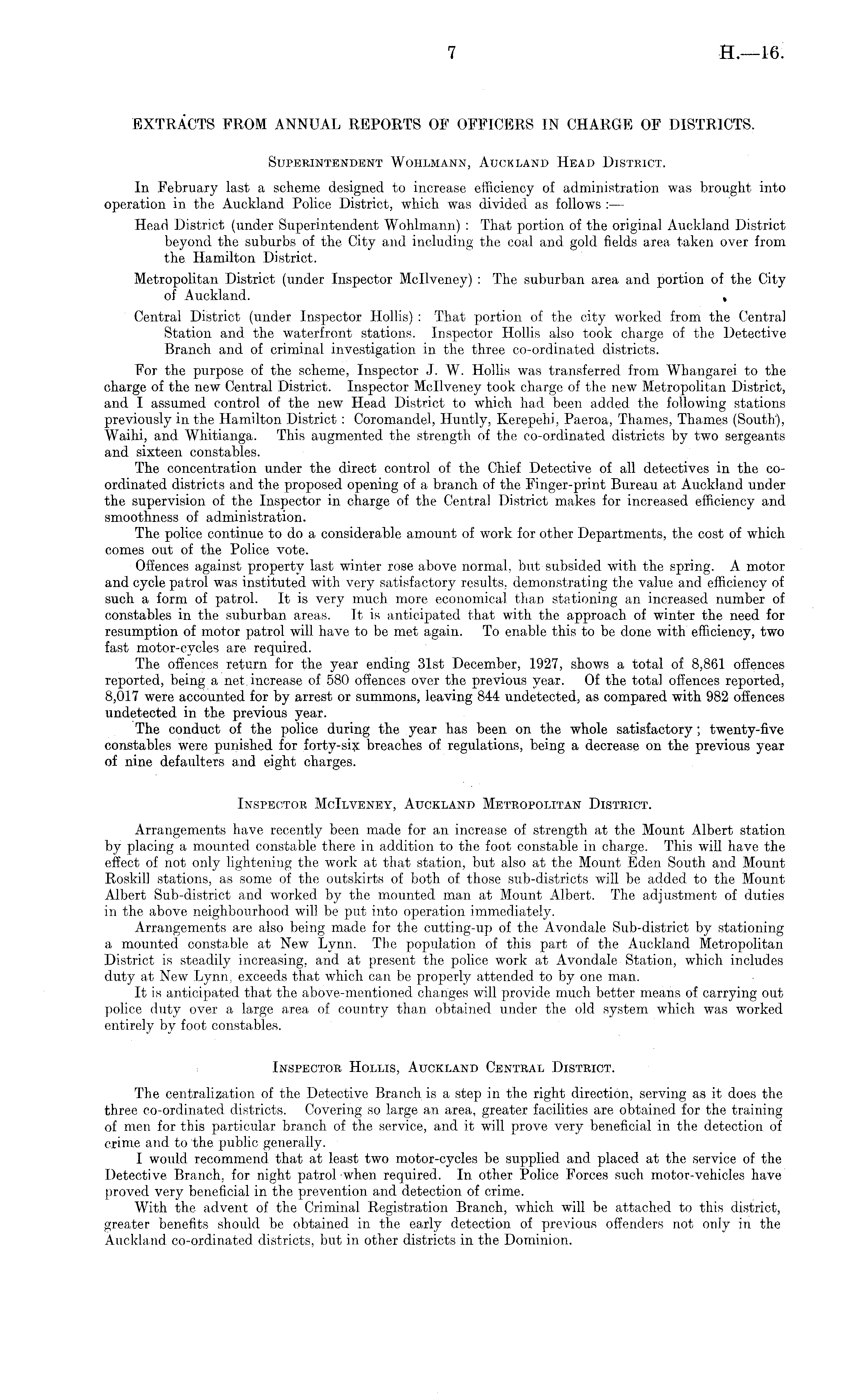 EXTRACTS FROM ANNUAL REPORTS OF OFFICERS IN CHARGE OF DISTRICTS. Superintendent Wohlmann, Auckland Head District. In February last a scheme designed to increase efficiency of administration was brought into operation in the Auckland Police District, which was divided as follows Head District (under Superintendent Wohlmann) : That portion of the original Auckland District beyond the suburbs of the City and including the coal and gold fields area taken over from the Hamilton District. Metropolitan District (under Inspector Mcllveney) : The suburban area and portion of the City of Auckland. , Central District (under Inspector Hollis) : That portion of the city worked from the Central Station and the waterfront stations. Inspector Hollis also took charge of the Detective Branch and of criminal investigation in the three co-ordinated districts. For the purpose of the scheme, Inspector J. W. Hollis was transferred from Whangarei to the charge of the new Central District. Inspector Mcllveney took charge of the new Metropolitan District, and I assumed control of the new Head District to which had been added the following stations previously in the Hamilton District : Coromandel, Huntly, Kerepehi, Paeroa, Thames, Thames (South), Waihi, and Whitianga. This augmented the strength of the co-ordinated districts by two sergeants and sixteen constables. The concentration under the direct control of the Chief Detective of all detectives in the coordinated districts and the proposed opening of a branch of the Finger-print Bureau at Auckland under the supervision of the Inspector in charge of the Central District makes for increased efficiency and smoothness of administration. The police continue to do a considerable amount of work for other Departments, the cost of which comes out of the Police vote. Offences against property last winter rose above normal, but subsided with the spring. A motor and cycle patrol was instituted with very satisfactory results, demonstrating the value and efficiency of such a form of patrol. It is very much more economical than stationing an increased number of constables in the suburban areas. It is anticipated that with the approach of winter the need for resumption of motor patrol will have to be met again. To enable this to be done with efficiency, two fast motor-cycles are required. The offences return for the year ending 31st December, 1927, shows a total of 8,861 offences reported, being a net, increase of 580 offences over the previous year. Of the total offences reported, 8,017 were accounted for by arrest or summons, leaving 844 undetected, as compared with 982 offences undetected in the previous year. The conduct of the police during the year has been on the whole satisfactory ; twenty-five constables were punished for forty-six breaches of regulations, being a decrease on the previous year of nine defaidters and eight charges. Inspector Mcllveney, Auckland Metropolitan District. Arrangements have recently been made for an increase of strength at the Mount Albert station by placing a mounted constable there in addition to the foot constable in charge. This will have the effect of not only lightening.the work at tha,t station, but also at the Mount Eden South and Mount Roskill stations, as some of the outskirts of both of those sub-districts will be added to the Mount Albert Sub-district and worked by the mounted man at Mount Albert. The adjustment of duties in the above neighbourhood will be put into operation immediately. Arrangements are also being made for the cutting-up of the Avondale Sub-district by stationing a mounted constable at New Lynn. The population of this part of the Auckland Metropolitan District is steadily increasing, and at present the police work at Avondale Station, which includes duty at New Lynn, exceeds that which can be properly attended to by one man. It is anticipated that the above-mentioned changes will provide much better means of carrying out police duty over a large area of country than obtained under the old system which was worked entirely by foot constables. Inspector Hollis, Auckland Central District. The centralization of the Detective Branch is a step in the right direction, serving as it does the three co-ordinated districts. Covering so large an area, greater facilities are obtained for the training of men for this particular branch of the service, and it will prove very beneficial in the detection of crime and to the public generally. I would recommend that at least two motor-cycles be supplied and placed at the service of the Detective Branch, for night patrol when required. In other Police Forces such motor-vehicles have proved very beneficial in the prevention and detection of crime. With the advent of the Criminal Registration Branch, which will be attached to this district, greater benefits should be obtained in the early detection of previous offenders not only in the Auckland co-ordinated districts, but in other districts in the Dominion.