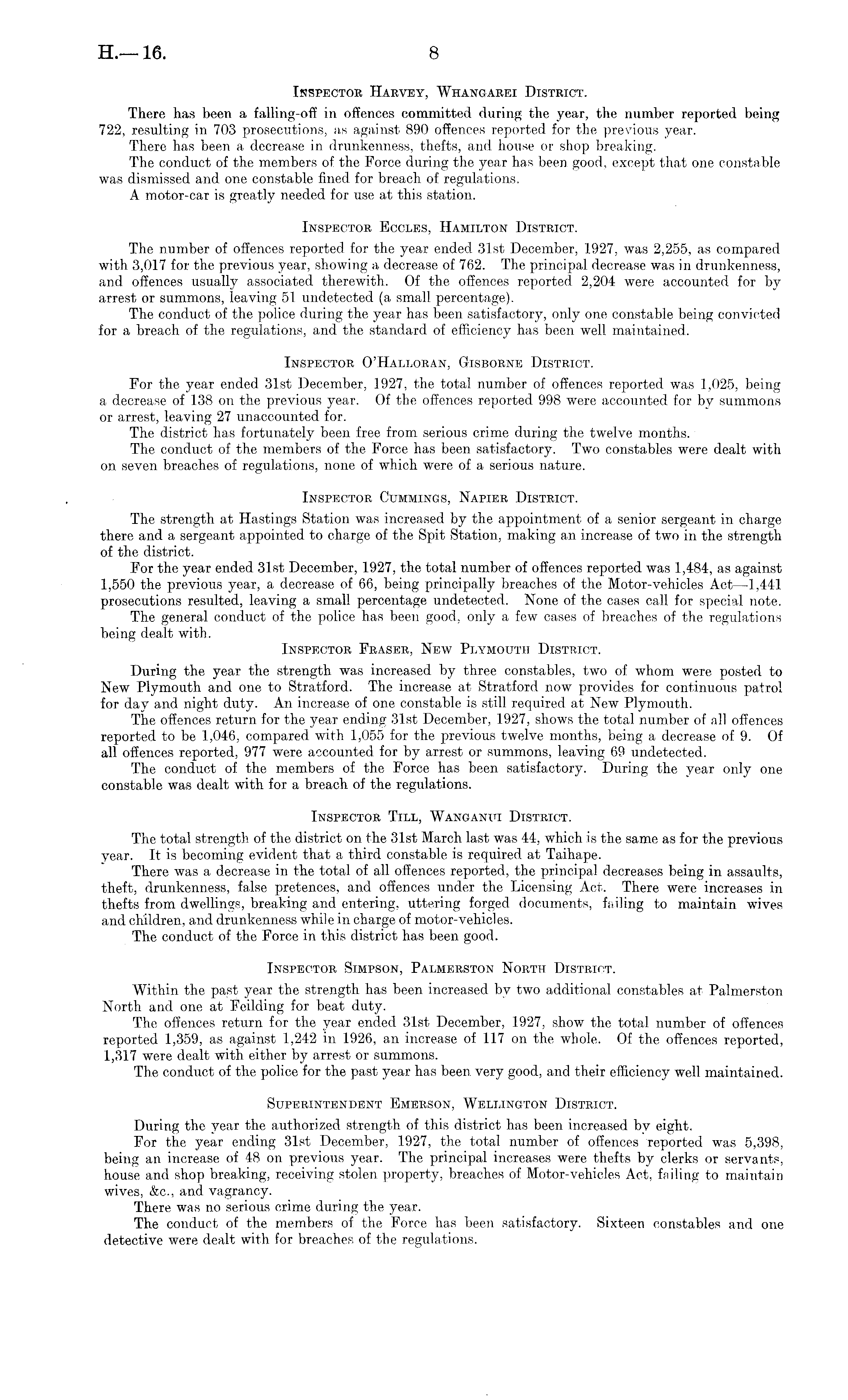 Inspector Harvey, Whangarei District. There lias been a falling-off in offences committed during the year, the number reported being 722, resulting in 703 prosecutions, as against 890 offences reported for the previous year. There has been a decrease in drunkenness, thefts, and house or shop breaking. The conduct of the members of the Force during the year has been good, except that one constable was dismissed and one constable fined for breach of regulations. A motor-car is greatly needed for use at this station. Inspector Eccles, Hamilton District. The number of offences reported for the year ended 31st December, 1927, was 2,255, as compared with 3,017 for the previous year, showing a decrease of 762. The principal decrease was in drunkenness, and offences usually associated therewith. Of the offences reported 2,204 were accounted for by arrest or summons, leaving 51 undetected (a small percentage). The conduct of the police during the year has been satisfactory, only one constable being convicted for a breach of the regulations, and the standard of efficiency has been well maintained. Inspector o'Hallora.n, Gisborne District. For the year ended 31st December, 1927, the total number of offences reported was 1,025, being a decrease of 138 on the previous year. Of the offences reported 998 were accounted for by summons or arrest, leaving 27 unaccounted for. The district has fortunately been free from serious crime during the twelve months. The conduct of the members of the Force has been satisfactory. Two constables were dealt with on seven breaches of regulations, none of which were of a serious nature. Inspector Cummings, Napier District. The strength at Hastings Station was increased by the appointment of a senior sergeant in charge there and a sergeant appointed to charge of the Spit Station, making an increase of two in the strength of the district. For the year ended 31st December, 1927, the total number of offences reported was 1,484, as against 1,550 the previous year, a decrease of 66, being principally breaches of the Motor-vehicles Act—l,44l prosecutions resulted, leaving a small percentage undetected. None of the cases call for special note. The general conduct of the police has been good, only a few cases of breaches of the regulations being dealt with. Inspector Fraser, New Plymouth District. During the year the strength was increased by three constables, two of whom were posted to New Plymouth and one to Stratford. The increase at Stratford now provides for continuous patrol for day and night duty. An increase of one constable is still required at New Plymouth. The offences return for the year ending 31st December, 1927, shows the total number of all offences reported to be 1,046, compared with 1,055 for the previous twelve months, being a decrease of 9. Of all offences reported, 977 were accounted for by arrest or summons, leaving 69 undetected. The conduct of the members of the Force has been satisfactory. During the year only one constable was dealt with for a breach of the regulations. Inspector Till, Wanganui District. The total strength of the district on the 31st March last was 44, which is the same as for the previous year. It is becoming evident that a third constable is required at Taihape. There was a decrease in the total of all offences reported, the principal decreases being in assaults, theft, drunkenness, false pretences, and offences under the Licensing Act. There were increases in thefts from dwellings, breaking and entering, uttering forged documents, failing to maintain wives and children, and drunkenness while in charge of motor-vehicles. The conduct of the Force in this district has been good. Inspector Simpson, Palmerston North District. Within the past year the strength has been increased by two additional constables at Palmerston North and one at Feilding for beat duty. The offences return for the year ended 31st December, 1927, show the total number of offences reported 1,359, as against 1,242 in 1926, an increase of 117 on the whole. Of the offences reported, 1,317 were dealt with either by arrest or summons. The conduct of the police for the past year has been very good, and their efficiency well maintained. Superintendent Emerson, Wellington District. During the year the authorized strength of this district has been increased bv eight. For the year ending 31st December, 1927, the total number of offences reported was 5,398, being an increase of 48 on previous year. The principal increases were thefts by clerks or servants, house and shop breaking, receiving stolen property, breaches of Motor-vehicles Act, failing to maintain wives, &c., and vagrancy. There was no serious crime during the year. The conduct of the members of the Force has been satisfactory. Sixteen constables and one detective were dealt with for breaches of the regulations.