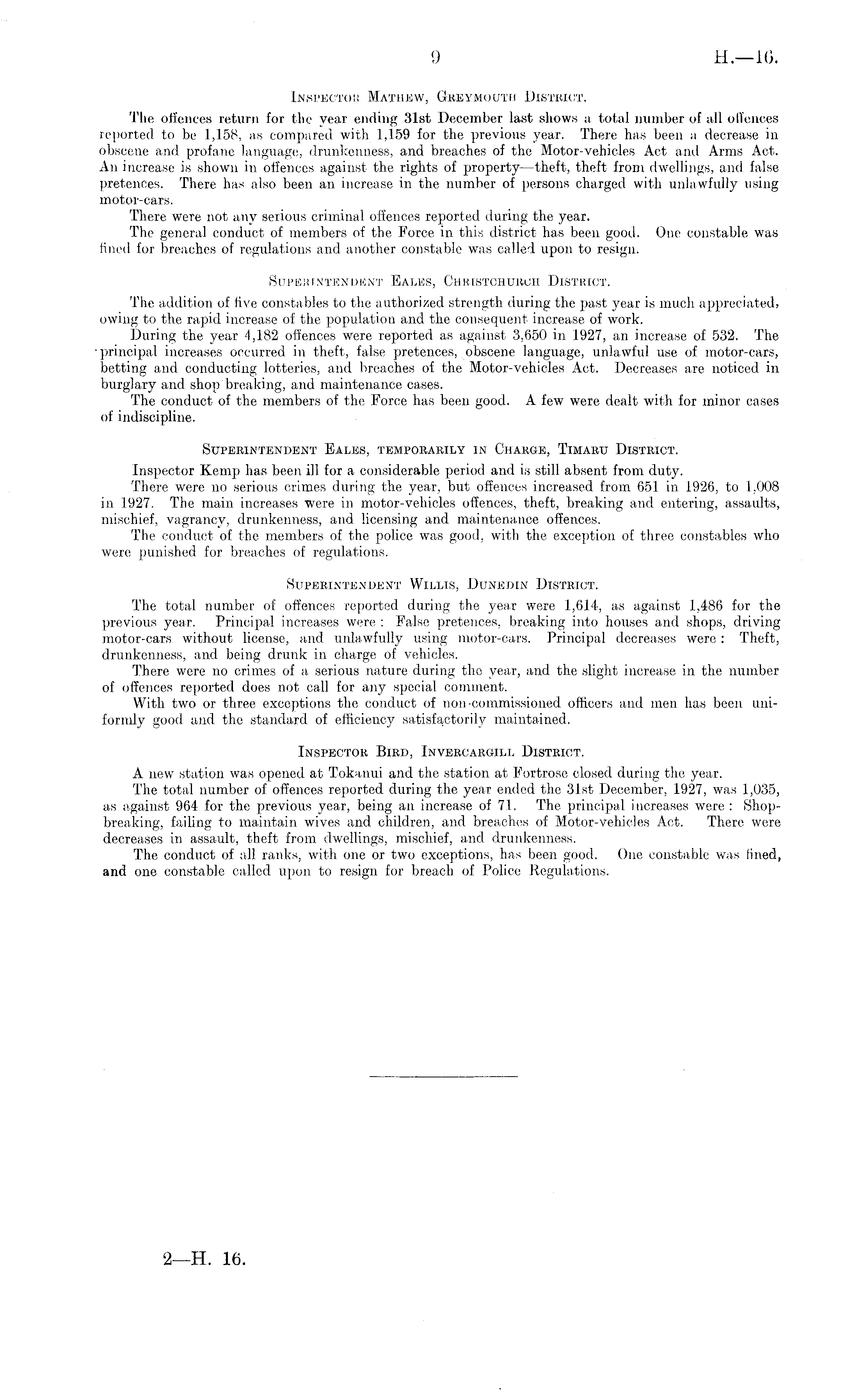 Inspector Mathew, Greymoutw District. The offences return for the year ending 31st December last shows a total number of all offences reported to be 1,158, as compared with 1,159 for the previous year. There has been a decrease in obscene and profane language, drunkenness, and breaches of the Motor-vehicles Act and Arms Act. An increase is shown in offences against the rights of property —theft, theft from dwellings, and false pretences. There has also been an increase in the number of persons charged with unlawfully using motor-cars. There were not any serious criminal offences reported during the year. The general conduct of members of the Force in this district has been good. One constable was fined for breaches of regulations and another constable was called upon to resign. Superintendent Eales, Christchuroh District. The addition of five constables to the authorized strength during the past year is much appreciated, owing to the rapid increase of the population and the consequent increase of work. During the year 4,182 offences were reported as against 3,650 in 1927, an increase of 532. The principal increases occurred in theft, false pretences, obscene language, unlawful use of motor-cars, betting and conducting lotteries, and breaches of the Motor-vehicles Act. Decreases are noticed in burglary and shop breaking, and maintenance cases. The conduct of the members of the Force has been good. A few were dealt with for minor cases of indiscipline. Superintendent Eales, temporarily in Charge, Timaru District. Inspector Kemp lias been ill for a considerable period and is still absent from duty. There were no serious crimes during the year, but offences increased from 651 in 1926, to 1,008 in 1927. The main increases were in motor-vehicles offences, theft, breaking and entering, assaults, mischief, vagrancy, drunkenness, and licensing and maintenance offences. The conduct of the members of the police was good, with the exception of three constables who were punished for breaches of regulations. Superintendent Willis, Dunedin District. The total number of offences reported during the year were 1,614, as against 1,486 for the previous year. Principal increases were : False pretences, breaking into houses and shops, driving motor-cars without license, and unlawfully using motor-cars. Principal decreases were : Theft, drunkenness, and being drunk in charge of vehicles. There were no crimes of a serious nature during the year, and the slight increase in the number of offences reported does not call for any special comment. With two or three exceptions the conduct of non-commissioned officers and men has been uniformly good and the standard of efficiency satisfactorily maintained. Inspector Bird, Invercargill District. A new station was opened at Tokanui and the station at Fortrose closed duritig the year. The total number of offences reported during the year ended the 31st December. 1927, was 1,035, as against 964 for the previous year, being an increase of 71. The principal increases were : Shopbreaking, failing to maintain wives and children, and breaches of Motor-vehicles Act. There were decreases in assault, theft from dwellings, mischief, and drunkenness. The conduct of all ranks, with one or two exceptions, has been good. One constable was lined, and one constable called upon to resign for breach of Police Regulations.