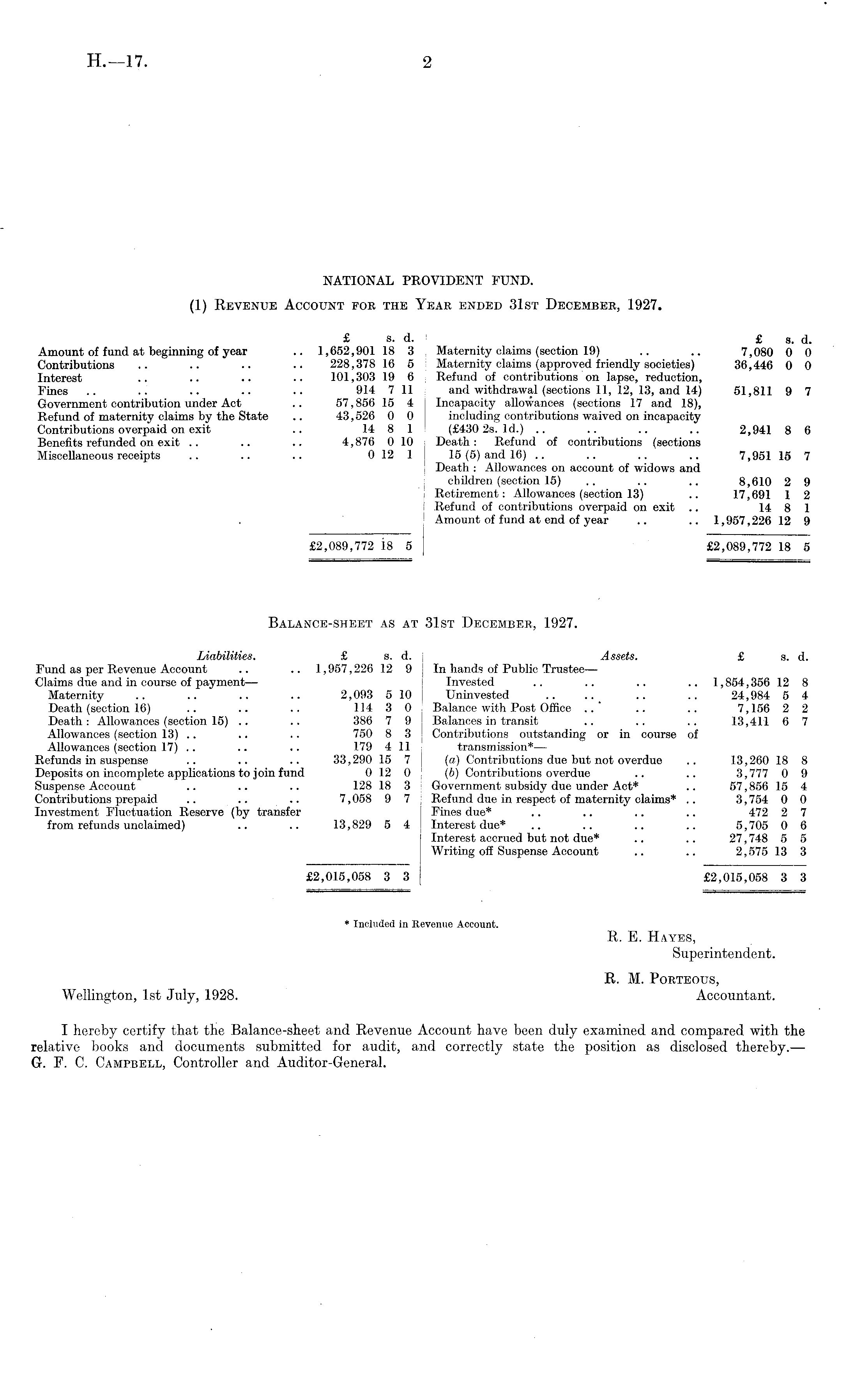 NATIONAL PROVIDENT FUND. (1) Revenue Account foe the Year ended 31st December, 1927. £ s. d. £ s. d. Amount of fund at beginning of year .. 1,652,901 18 3 Maternity claims (section 19) .. .. 7,080 0 0 Contributions .. .. .. .. 228,378 16 5 Maternity claims (approved friendly societies) 36,446 0 0 Interest .. .. .. .. 101,303 19 6 Refund of contributions on lapse, reduction, Fines .. .. .. .. .. 914 711 and withdrawal (sections 11, 12, 13, and 14) 51,811 9 7 Government contribution under Act .. 57, 856 15 4 | Incapacity allowances (sections 17 and 18), Refund of maternity claims by the State .. 43,526 0 0 i including contributions waived on incapacity Contributions overpaid on exit .. 14 8 1 (£430 2s. Id.) .. .. .. .. 2,941 8 6 Benefits refunded on exit .. .. .. 4,876 010 Death: Refund of contributions (sections Miscellaneous receipts .. .. .. 0 12 1 15 (5) and 16) .. .. .. .. 7,951 15 7 Death : Allowances on account of widows and children (section 15) .. .. .. 8,610 2 9 Retirement: Allowances (section 13) .. 17,691 1 2 Refund of contributions overpaid on exit .. 14 8 1 Amount of fund at end of year .. .. 1,957,226 12 9 £2,089,772 18 5 £2,089,772 18 5 Balance-sheet as at 31st December, 1927. Liabilities. £ s. d. Assets. £ s. d. Fund as per Revenue Account .. .. 1,957,226 12 9 ,In hands of Public Trustee — Claims due and in course of payment— Invested .. .. .. .. 1,854,356 12 8 Maternity .. .. .. .. 2,093 510 i Uninvested .. .. .. .. 24,984 5 4 Death (section 16) .. .. .. 114 3 0 Balance with Post Office .. .. .. 7,156 2 2 Death: Allowances (section 15) .. .. 386 7 9 Balances in transit .. .. .. 13,411 6 7 Allowances (section 13).. .. .. 750 83 Contributions outstanding or in course of Allowances (section 17) .. .. .. 179 4 11 transmission*— Refunds in suspense .. .. .. 33,290 15 7 j (a) Contributions due but not overdue .. 13,260 18 8 Deposits on incomplete applications to join fund 0 12 0 (b) Contributions overdue .. .. 3,777 0 9 Suspense Account .. .. .. 128 18 3 Government subsidy due under Act* .. 57,856 15 4 Contributions prepaid .. .. .. 7,058 9 7 Refund due in respect of maternity claims* .. 3,754 0 0 Investment Fluctuation Reserve (by transfer Fines due* .. .. .. .. 472 2 7 from refunds unclaimed) .. .. 13,829 5 4 Interest due* .. .. .. .. 5,705 0 6 Interest accrued but not due* .. .. 27,748 5 5 Writing off Suspense Account .. .. 2,575 13 3 £2,015,058 3 3 £2,015,058 3 3 * Included in Revenue Account. R. E. Hayes, Superintendent. R. M. Porteous, Wellington, Ist July, 1928. Accountant. I hereby certify that the Balance-sheet and Revenue Account have been duly examined and compared with the relative books and documents submitted for audit, and correctly state the position as disclosed thereby.— G-. F. C. Campbell, Controller and Auditor-General.