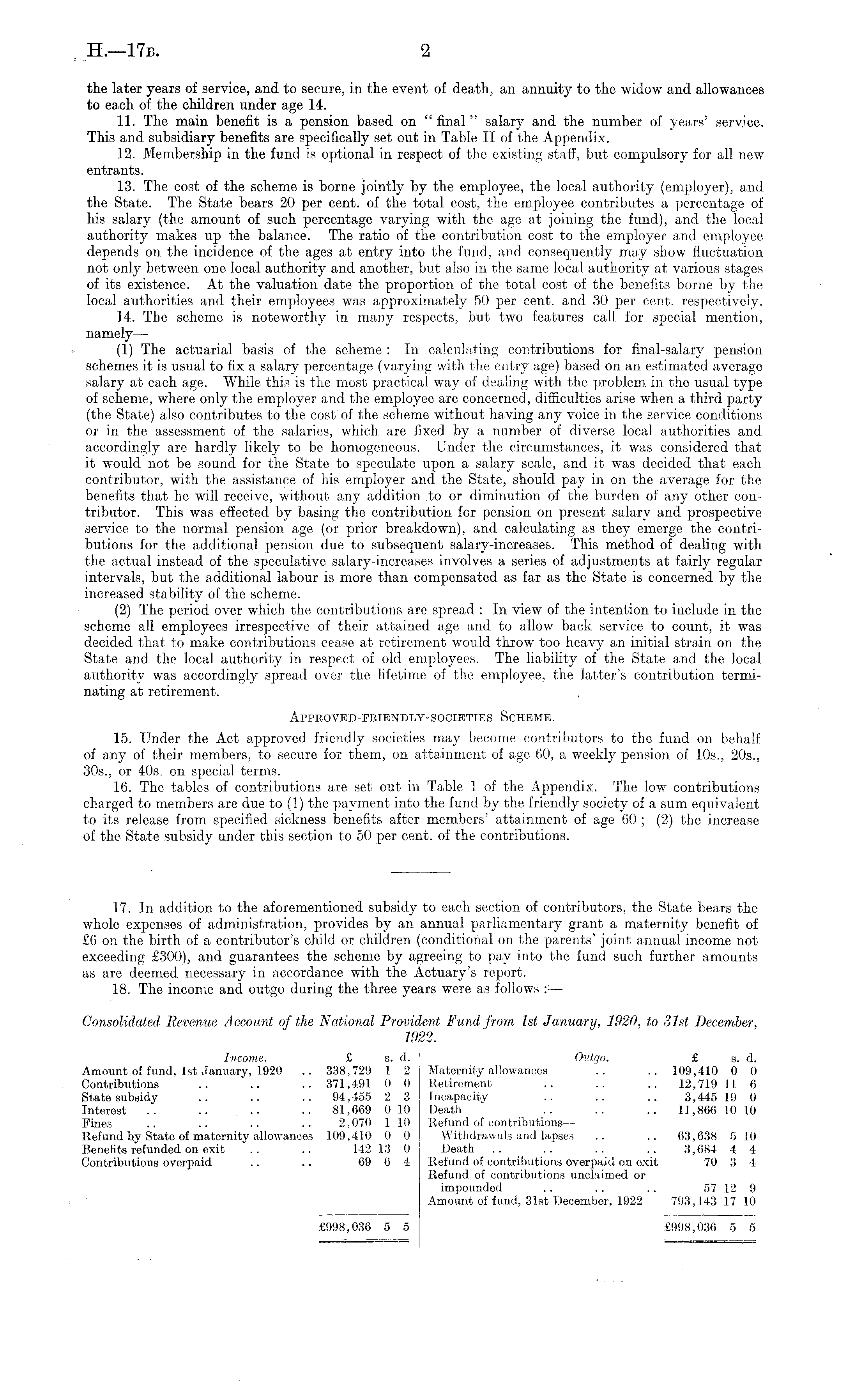 the later years of service, and to secure, in the event of death, an annuity to the widow and allowances to each of the children under age 14. 11. The main benefit is a pension based on "final" salary and the number of years' service. This and subsidiary benefits are specifically set out in Table II of the Appendix. 12. Membership in the fund is optional in respect of the existing staff, but compulsory for all new entrants. 13. The cost of the scheme is borne jointly by the employee, the local authority (employer), and the State. The State bears 20 per cent, of the total cost, the employee contributes a percentage of his salary (the amount of such percentage varying with the age at joining the fund), and the local authority makes up the balance. The ratio of the contribution cost to the employer and employee depends on the incidence of the ages at entry into the fund, and consequently may show fluctuation not only between one local authority and another, but also in the same local authority at various stages of its existence. At the valuation date the proportion of the total cost of the benefits borne by the local authorities and their employees was approximately 50 per cent, and 30 per cent, respectively. 14. The scheme is noteworthy in many respects, but two features call for special mention, namely— (1) The actuarial basis of the scheme : In calculating contributions for final-salary pension schemes it is usual to fix a salary percentage (varying with the entry age) based on an estimated average salary at each age. While this is the most practical way of dealing with the problem in the usual type of scheme, where only the employer and the employee are concerned, difficulties arise when a third party (the State) also contributes to the cost' of the scheme without having any voice in the service conditions or in the assessment of the salaries, which are fixed by a number of diverse local authorities and accordingly are hardly likely to be homogeneous. Under the circumstances, it was considered that it would not be sound for the State to speculate upon a salary scale, and it was decided that each contributor, with the assistance of his employer and the State, should pay in on the average for the benefits that he will receive, without any addition to or diminution of the burden of any other contributor. This was effected by basing the contribution for pension on present salary and prospective service to the normal pension age (or prior breakdown), and calculating as they emerge the contributions for the additional pension due to subsequent salary-increases. This method of dealing with the actual instead of the speculative salary-increases involves a series of adjustments at fairly regular intervals, but the additional labour is more than compensated as far as the State is concerned by the increased stability of the scheme. (2) The period over which the contributions are spread : In view of the intention to include in the scheme all employees irrespective of their attained age and to allow back service to count, it was decided that to make contributions cease at retirement would throw too heavy an initial strain on the State and the local authority in respect of old employees. The liability of the State and the local authority was accordingly spread over the lifetime of the employee, the latter's contribution terminating at retirement. Approved-friendly-societies Scheme. 15. Under the Act approved friendly societies may become contributors to the fund on behalf of any of their members, to secure for them, on attainment of age 60, a weekly pension of 10s., 205., 305., or 40s. on special terms. 16. The tables of contributions are set out. in Table lof the Appendix. The low contributions charged to members are due to (1) the payment into the fund by the friendly society of a sum equivalent to its release from specified sickness benefits after members' attainment of age 60 ; (2) the increase of the State subsidy under this section to 50 per cent, of the contributions. 17. In addition to the aforementioned subsidy to each section of contributors, the State bears the whole expenses of administration, provides by an annual parliamentary grant a maternity benefit of £6 on the birth of a contributor's child or children (conditional on the parents' joint annual income not exceeding £300), and guarantees the scheme by agreeing to pay into the fund such further amounts as are deemed necessary in accordance with the Actuary's report. 18. The income and outgo during the three years were as follows : : — Consolidated Revenue Account of the National Provident Fund from Ist January, 1920, to 31st December, 1922. Income. £ s. d. Outgo. £ s. d. Amount of fund, Ist January, 1920 .. 338,729 1 2 Maternity allowances .. .. 109,410 0 0 Contributions .. .. .. 371,491 0 0 Retirement .. .. .. 12,719 11 6 State subsidy .. .. .. 94,455 2 3 Incapacity .. .. .. 3,445 19 0 Interest .. .. .. .. 81,669 010 Death .. .. .. 11,866 10 10 Fines .. .. .. .. 2.070 110 Refund of contributions— Refund by State of maternity allowances 109,410 0 0 Withdrawals and lapses .. .. 63,638 510 Benefits refunded on exit .. .. 142 13 0 JDeath .. .. .. .. 3,684 4 4 Contributions overpaid .. .. 69 6 4 Refund of contributions overpaid on exit 70 3 4 Refund of contributions unclaimed or impounded .. .. .. 57 12 9 Amount of fund, 31st December, 1922 793,143 17 10 £998,036 5 5 £998,036 5 5