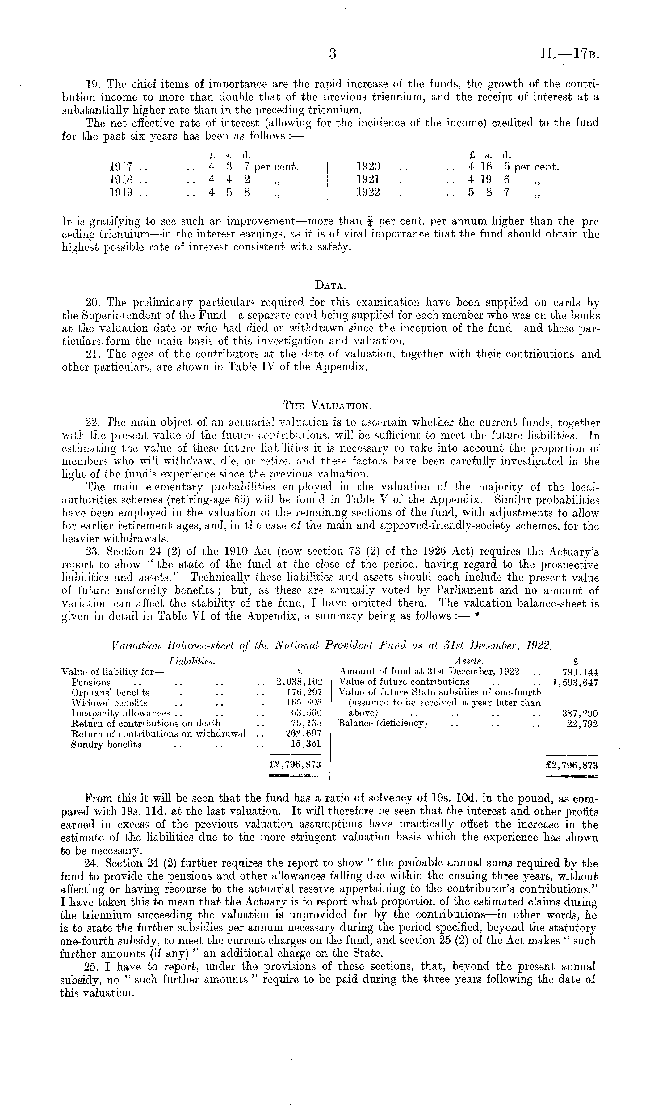 19. The chief items of importance are the. rapid increase of the funds, the growth of the contribution income to more than double that of the previous triennium, and the receipt of interest at a substantially higher rate than in the preceding triennium. The net effective rate of interest (allowing for the incidence of the income) credited to the fund for the past six years has been as follows : —• £ s. d. £ s. d. 1917 .. ..4 3 7 per cent. 1920 .. .. 418 5 per cent. 1918 .. ..4 4 2 „ 1921 .. .. 419 6 1919 .. ..458 „ 1922 .. ..587 It is gratifying to see such an improvement —more than § per cent, per annum higher than the pre ceding triennium—in the interest earnings, as it is of vital importance that the fund should obtain the highest possible rate of interest consistent with safety. Data. 20. The preliminary particulars required for this examination have been supplied on cards by the Superintendent of the Fund—a separate card being supplied for each member who was on the books at the valuation date or who had died or withdrawn since the inception of the fund —and these particulars, form the main basis of this investigation and valuation. 21. The ages of the contributors at the date of valuation, together with their contributions and other particulars, are shown in Table IV of the Appendix. The Valuation. 22. The main object of an actuarial valuation is to ascertain whether the current funds, together with the present value of the future contributions, will be sufficient to meet the future liabilities. In estimating the value of these future liabilities it is necessary to take into account the proportion of members who will withdraw, die, or retire, and these factors have been carefully investigated in the light of the fund's experience since the previous valuation. The main elementary probabilities employed in the valuation of the majority of the localauthorities schemes (retiring-age 65) will be found in Table Vof the Appendix. Similar probabilities have been employed in the valuation of the remaining sections of the fund, with adjustments to allow for earlier retirement ages, and, in the case of the main and approved-friendly-society schemes, for the heavier withdrawals. 23. Section 24 (2) of the 1910 Act (now section 73 (2) of the 1926 Act) requires the Actuary's report to show " the state of the fund at the close of the period, having regard to the prospective liabilities and assets." Technically these liabilities and assets should each include the present value of future maternity benefits ; but, as these are annually voted by Parliament and no amount of variation can affect the stability of the fund, I have omitted them. The valuation balance-sheet is given in detail in Table VI of the Appendix, a summary being as follows : — * Valuation Balance-sheet of the National Provident Fund as at 31st December, 1922. Liabilities. Assets. £ Value of liability for— £ Amount of fund at 31st December, 1922 .. 793,144 Pensions .. .. .. .. 2,038,102 Value of future contributions .. .. 1,593,647 Orphans'benefits .. .. . . 176,297 Value of future State subsidies of one-fourth Widows'benefits .. .. .. 165,805 (assumed to be received a year later than Incapacity allowances .. .. .. 63,566 above) .. .. .. .. 387,290 Return of contributions on death .. 75,135 Balance (deficiency) .. .. .. 22,792 Return of contributions on withdrawal .. 262,607 Sundry benefits .. .. .. 15,361 £2,796,873 £2,796,873 From this it will be seen that the fund has a ratio of solvency of 19s. lOd. in the pound, as compared with 19s. lid. at the last valuation. It will therefore be seen that the interest and other profits earned in excess of the previous valuation assumptions have practically offset the increase in the estimate of the liabilities due to the more stringent valuation basis which the experience has shown to be necessary. 24. Section 24 (2) further requires the report to show " the probable annual sums required by the fund to provide the pensions and other allowances falling due within the ensuing three years, without affecting or having recourse to the actuarial reserve appertaining to the contributor's contributions." I have taken this to mean that the Actuary is to report what proportion of the estimated claims during the triennium succeeding the valuation is unprovided for by the contributions —in other words, he is to state the further subsidies per annum necessary during the period specified, beyond the statutory one-fourth subsidy, to meet the current charges on the fund, and section 25 (2) of the Act makes " such further amounts (if any) " an additional charge on the State. 25. I have to report, under the provisions of these sections, that, beyond the present annual subsidy, no " such further amounts " require to be paid during the three years following the date of this valuation.