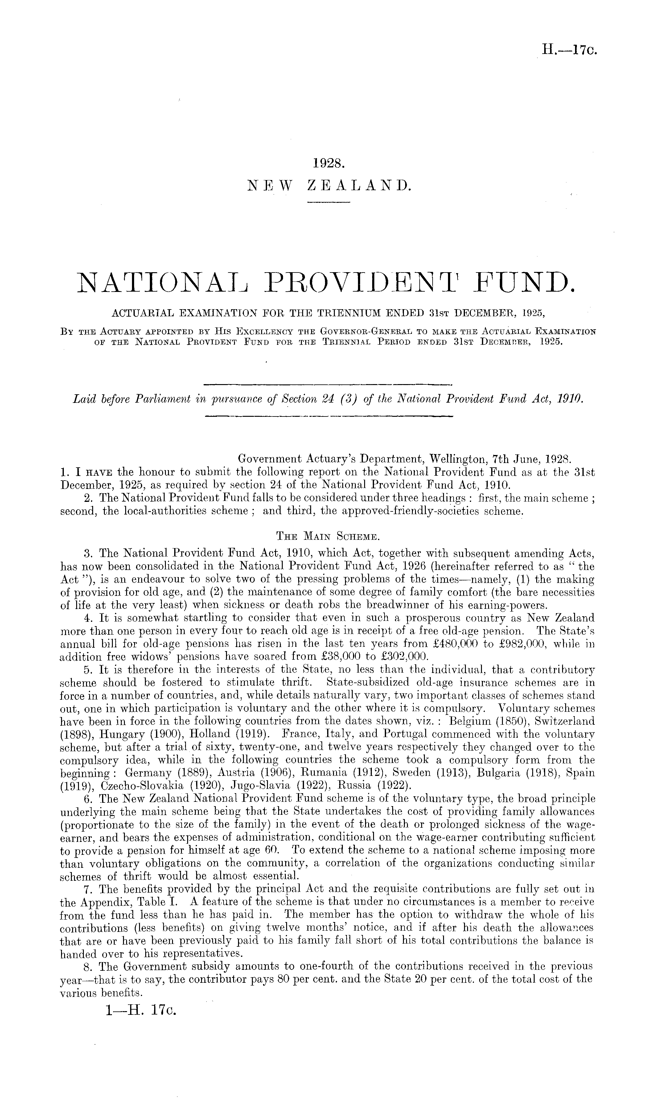 Government Actuary's Department, Wellington, 7th June, 1928. 1. I have the honour to submit the following report on the National Provident Fund as at the 31st December, 1925, as required by section 24 of the National Provident Fund Act, 1910. 2. The National Provident Fund falls to be considered under three headings : first, the main scheme ; second, the local-authorities scheme ; and third, the approved-friendly-societies scheme. The Main Scheme. 3. The National Provident Fund Act, 1910, which Act, together with subsequent amending Acts, has now been consolidated in the National Provident Fund Act, 1926 (hereinafter referred to as " the Act "), is an endeavour to solve two of the pressing problems of the times—namely, (1) the making of provision for old age, and (2) the maintenance of some degree of family comfort (the bare necessities of life at the very least) when sickness or death robs the breadwinner of his earning-powers. 4. It is somewhat startling to consider that even in such a prosperous country as New Zealand more than one person in every four to reach old age is in receipt of a free old-age pension. The State's annual bill for old-age pensions has risen in the last ten years from £480,000 to £982,000, while in addition free widows' pensions have soared from £38,000 to £302,000. 5. It is therefore in the interests of the State, no less than the individual, that a contributory scheme should be fostered to stimulate thrift. State-subsidized old-age insurance schemes are in force in a number of countries, and, while details naturally vary, two important classes of schemes stand out, one in which participation is voluntary and the other where it is compulsory. Voluntary schemes have been in force in the following countries from the dates shown, viz. : Belgium (1850), Switzerland (1898), Hungary (1900), Holland (1919). France, Italy, and Portugal commenced with the voluntary scheme, but after a trial of sixty, twenty-one, and twelve years respectively they changed over to the compulsory idea, while in the following countries the scheme took a compulsory form from the beginning : Germany (1889), Austria (1906), Rumania (1912), Sweden (1913), Bulgaria (1918), Spain (1919), Czecho-Slovakia (1920), Jugo-Slavia (1922), Russia (1922). 6. The New Zealand National Provident Fund scheme is of the voluntary type, the broad principle underlying the main scheme being that the State undertakes the cost of providing family allowances (proportionate to the size of the family) in the event of the death or prolonged sickness of the wageearner, and bears the expenses of administration, conditional on the wage-earner contributing sufficient to provide a pension for himself at age 60. To extend the scheme to a national scheme imposing more than voluntary obligations on the community, a correlation of the organizations conducting similar schemes of thrift would be almost essential. 7. The benefits provided by the principal Act and the requisite contributions are fully set out in the Appendix, Table I. A feature of the scheme is that under no circumstances is a member to receive from the fund less than he has paid in. The member has the option to withdraw the whole of his contributions (less benefits) on giving twelve months' notice, and if after his death the allowances that are or have been previously paid to his family fall short of his total contributions the balance is handed over to his representatives. 8. The Government subsidy amounts to one-fourth of the contributions received in the previous year —that is to say, the contributor pays 80 per cent, and the State 20 per cent, of the total cost of the various benefits.