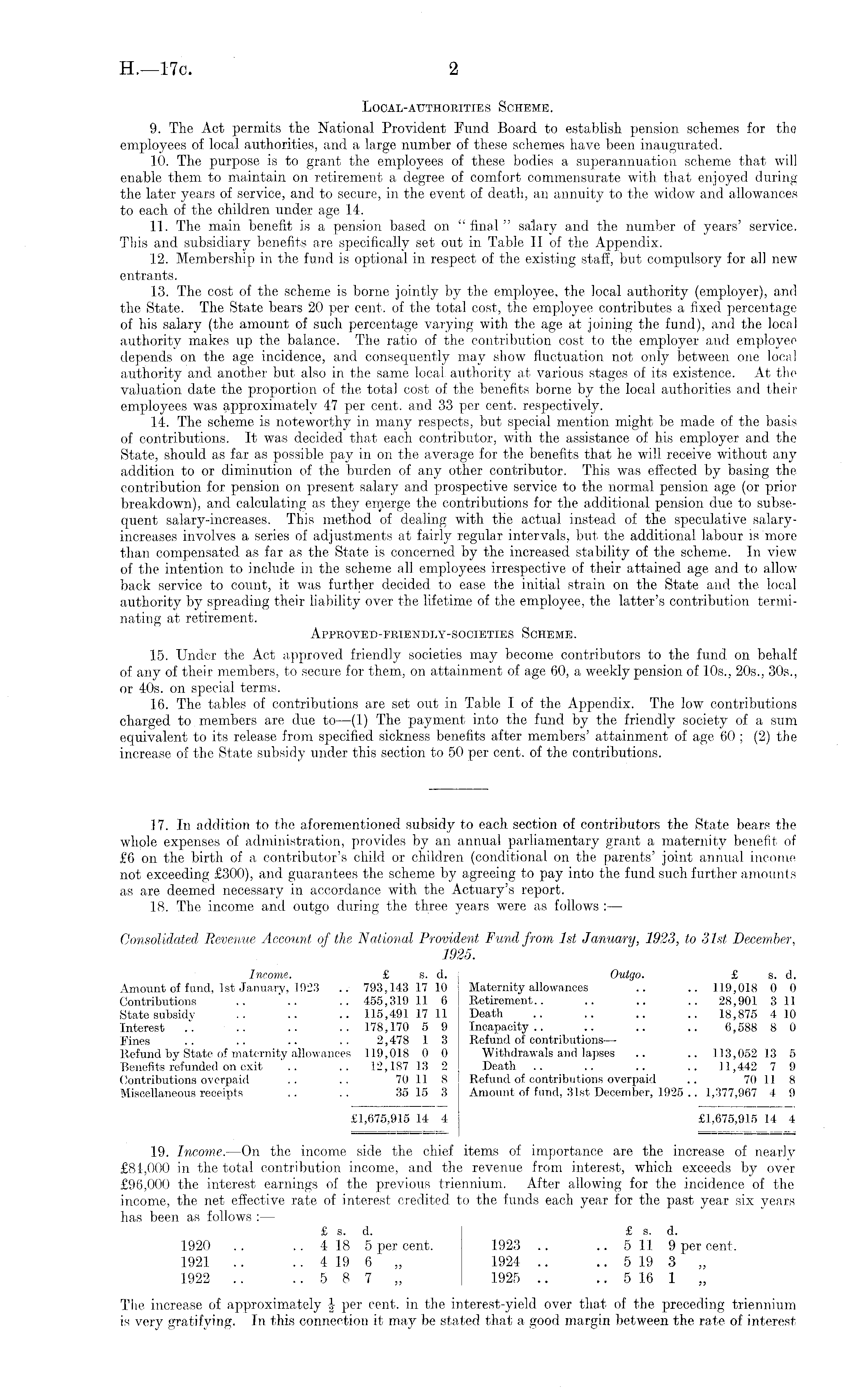 Local-authorities Scheme. 9. The Act permits the National Provident Fund Board to establish pension schemes for the employees of local authorities, and a large number of these schemes have been inaugurated. 10. The purpose is to grant the employees of these bodies a superannuation scheme that will enable them to maintain on retirement a degree of comfort commensurate with that enjoyed during the later years of service, and to secure, in the event of death, an annuity to the widow and allowances to each of the children under age 14. 11. The main benefit is a pension based on "final" salary and the number of years' service. This and subsidiary benefits are specifically set out in Table II of the Appendix. 12. Membership in the fund is optional in respect of the existing staff, but compulsory for all new entrants. 13. The cost of the scheme is borne jointly by the employee, the local authority (employer), and the State. The State bears 20 per cent, of the total cost, the employee contributes a fixed percentage of his salary (the amount of such percentage varying with the age at joining the fund), and the local authority makes up the balance. The ratio of the contribution cost to the employer and employee depends on the age incidence, and consequently may show fluctuation not only between one local authority and another but also in the same local authority at various stages of its existence. At the valuation date the proportion of the total cost of the benefits borne by the local authorities and their employees was approximately 47 per cent, and 33 per cent, respectively. 14. The scheme is noteworthy in many respects, but special mention might be made of the basis of contributions. It was decided that each contributor, with the assistance of his employer and the State, should as far as possible pay in on the average for the benefits that he will receive without any addition to or diminution of the burden of any other contributor. This was effected by basing the contribution for pension on present salary and prospective service to the normal pension age (or prior breakdown), and calculating as they emerge the contributions for the additional pension due to subsequent salary-increases. This method of dealing with the actual instead of the speculative salaryincreases involves a series of adjustments at fairly regular intervals, but the additional labour is more than compensated as far as the State is concerned by the increased stability of the scheme. In view of the intention to include in the scheme all employees irrespective of their attained age and to allow back service to count, it was further decided to ease the initial strain on the State and the local authority by spreading their liability over the lifetime of the employee, the latter's contribution terminating at retirement. Approved-friendly-societies Scheme . 15. Under the Act approved friendly societies may become contributors to the fund on behalf of any of their members, to secure for them, on attainment of age 60, a weekly pension of 10s., 205., 305., or 40s. on special terms. 16. The tables of contributions are set out in Table I of the Appendix. The low contributions charged to members are due to —(1) The payment into the fund by the friendly society of a sum equivalent to its release from specified sickness benefits after members' attainment of age 60 ; (2) the increase of the State subsidy under this section to 50 per cent, of the contributions. 17. In addition to the aforementioned subsidy to each section of contributors the State bears the whole expenses of administration, provides by an annual parliamentary grant a maternity benefit of £6 on the birth of a contributor's child or children (conditional on the parents' joint annual income not exceeding £300), and guarantees the scheme by agreeing to pay into the fund such further amounts as are deemed necessary in accordance with the Actuary's report. 18. The income and outgo during the three years were as follows : — Consolidated Revenue Account of the National Provident Fund from, Ist January, 1923, to 31st, December. 1925. Income. £ s. d. Outgo. £ s. d. Amount of fund, Ist January, 1923 .. 793,143 17 10 Maternity allowances .. .. 119,018 0 0 Contributions .. .. .. 455,319 11 6 Retirement.. .. .. .. 28,901 311 State subsidy .. .. .. 115,491 17 11 Death .. .. .. .. 18,875 410 Interest .. .. .. .. 178,170 5 9 Incapacity.. .. .. .. 6,588 8 0 Fines .. .. .. .. 2,478 1 3 Refund of contributions— Refund by State of maternity allowances 119,018 0 0 Withdrawals and lapses .. .. 113,052 13 5 Benefits refunded on exit .. .. 12,187 13 2 Death .. .. .. .. 11,442 7 9 Contributions overpaid .. .. 70 11 8 Refund of contributions overpaid .. 70 11 8 Miscellaneous receipts .. .. 35 15 3 Amount of fund, 31st December, 1925 .. 1,377,967 4 9 £1,675,915 14 4 £1,675,915 14 4 19. Income. —On the income side the chief items of importance are the increase of nearly £81,000 in the total contribution income, and the revenue from interest, which exceeds by over £96,000 the interest earnings of the previous triennium. After allowing for the incidence of the income, the net effective rate of interest credited to the funds each year for the past year six years has been as follows :— £ s. d. £ s. d. 1920 .. .. 418 5 per cent. 1923 .. ..5 11 9 per cent. 1921 .. .. 419 6 „ 1924 .. .. 519 3 „ 1922 .. ..5 8 7 „ 1925 .. .. 516 1 „ The increase of approximately per cent, in the interest-yield over that of the preceding triennium is very gratifying. In this connection it may be stated that a good margin between the rate of interest
