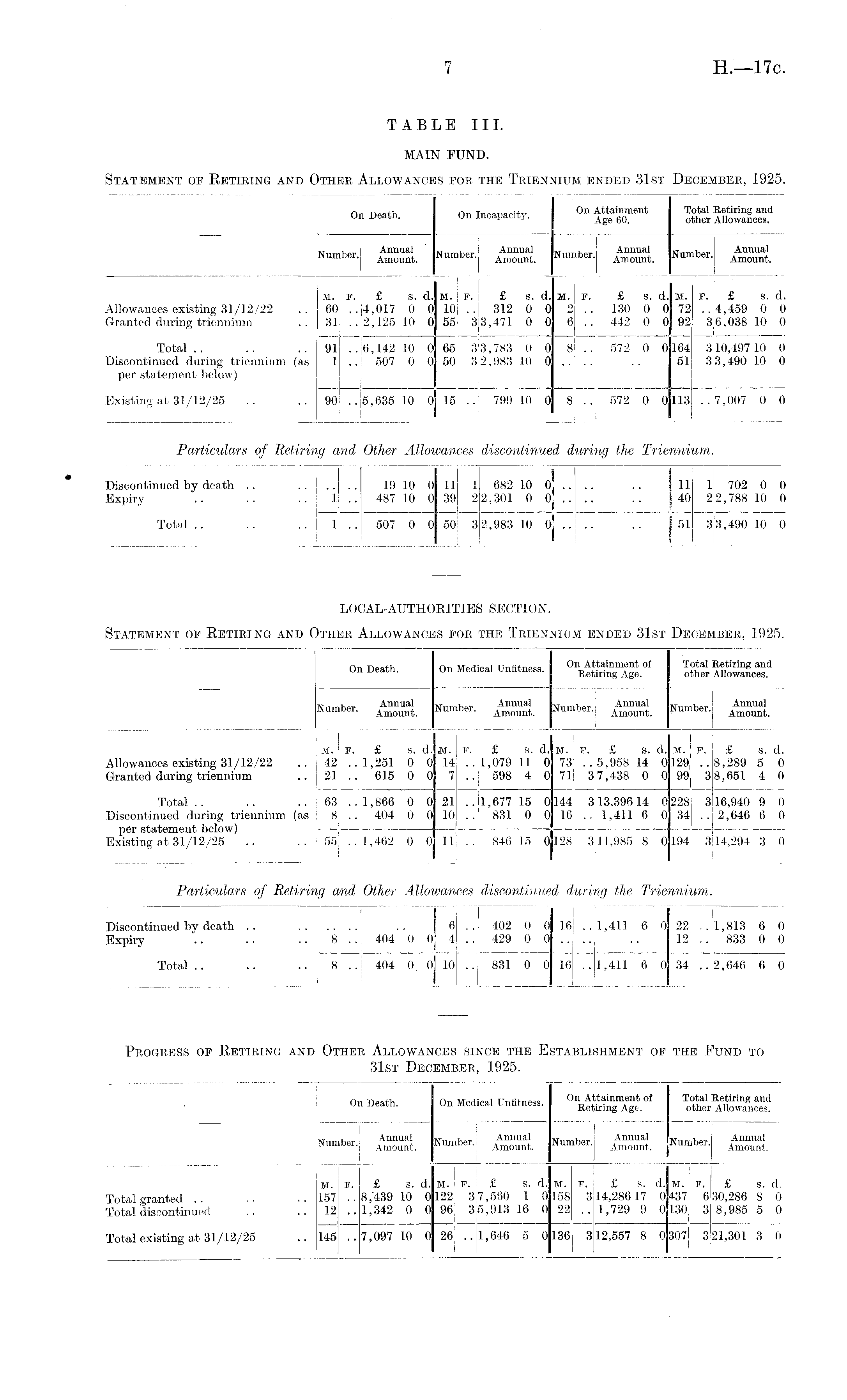 TABLE III. MAIN FUND. Statement of Retiring and Other Allowances for the Triennium ended 31st December, 1925.