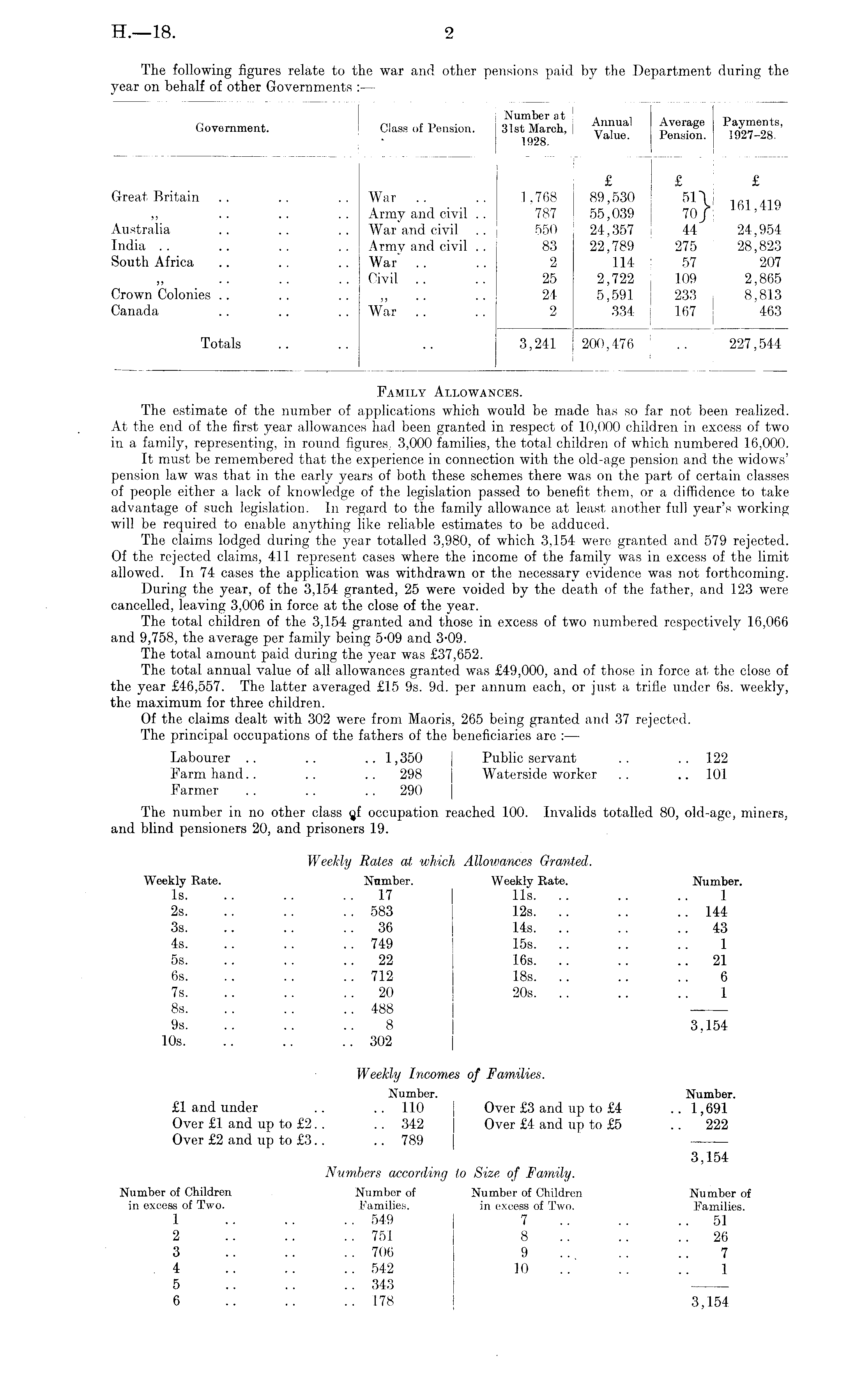 Family Allowances. The estimate of the number of applications which would be made has so far not been realized. At the end of the first year allowances had been granted in respect of 10,000 children in excess of two in a family, representing, in round figures., 3,000 families, the total children of which numbered 16,000. It must be remembered that the experience in connection with the old-age pension and the widows' pension law was that in the early years of both these schemes there was on the part of certain classes of people either a lack of knowledge of the legislation passed to benefit them, or a diffidence to take advantage of such legislation. In regard to the family allowance at least another full year's working will be required to enable anything like reliable estimates to be adduced. The claims lodged during the year totalled 3,980, of which 3,154 were granted and 579 rejected. Of the rejected claims, 411 represent cases where the income of the family was in excess of the limit allowed. In 74 cases the application was withdrawn or the necessary evidence was not forthcoming. During the year, of the 3,154 granted, 25 were voided by the death of the father, and 123 were cancelled, leaving 3,006 in force at the close of the year. The total children of the 3,154 granted and those in excess of two numbered respectively 16,066 and 9,758, the average per family being 5-09 and 3-09. The total amount paid during the year was £37,652. The total annual value of all allowances granted was £49,000, and of those in force at the close of the year £46,557. The latter averaged £15 9s. 9d. per annum each, or just a trifle under 6s. weekly, the maximum for three children. Of the claims dealt with 302 were from Maoris, 265 being granted and 37 rejected. The principal occupations of the fathers of the beneficiaries are :— Labourer .. .. .. 1,350 Public servant .. .. 122 Farmhand.. .. .. 298 Waterside worker .. 101 Farmer . . .. .. 290 The number in no other class occupation reached 100. Invalids totalled 80, old-age, miners, and blind pensioners 20, and prisoners 19. Weekly Rales at which Allowances Granted. Weekly Rate. Number. Weekly Rate. Number. Is. .. .. .. 17 lis. .. .. .. 1 2s. .. .. .. 583 12s. .. .. .. 144 3s. .. .. .. 36 14s. .. .. .. 43 4s. .. .. .. 749 15s. .. .. .. 1 ss. .. .. 22 16s. .. .. 21 6s. .. .. .. 712 18s. .. .. .. 6 7s. .. .. .. 20 20s. .. .. .. 1 Bs. .. .. .. 488 9s. .. .. .. 8 3.154 10s. .. .. .. 302 Weekly Incomes of Families. Number. Number. £1 and under . . . . 110 Over £3 and up to £4- .. 1,691 Over £1 and up to £2.. .. 342 Over £4 and up to £5 .. 222 Over £2 and up to £3.. .. 789 3,154 Numbers according to Size of Family. Number of Children Number of Number of Children Number of in excess of Two. Families. in excess of Two. Families. 1 .. .. .. 54-9 7 .. .. 51 2 .. .. .. 751 8 .. .. 26 3 .. .. .. 706 9 .. 7 .4 .. .. ..542 10 .. ..1 5 .. .. .. 343 6 .. .. .. 178 | 3,154
