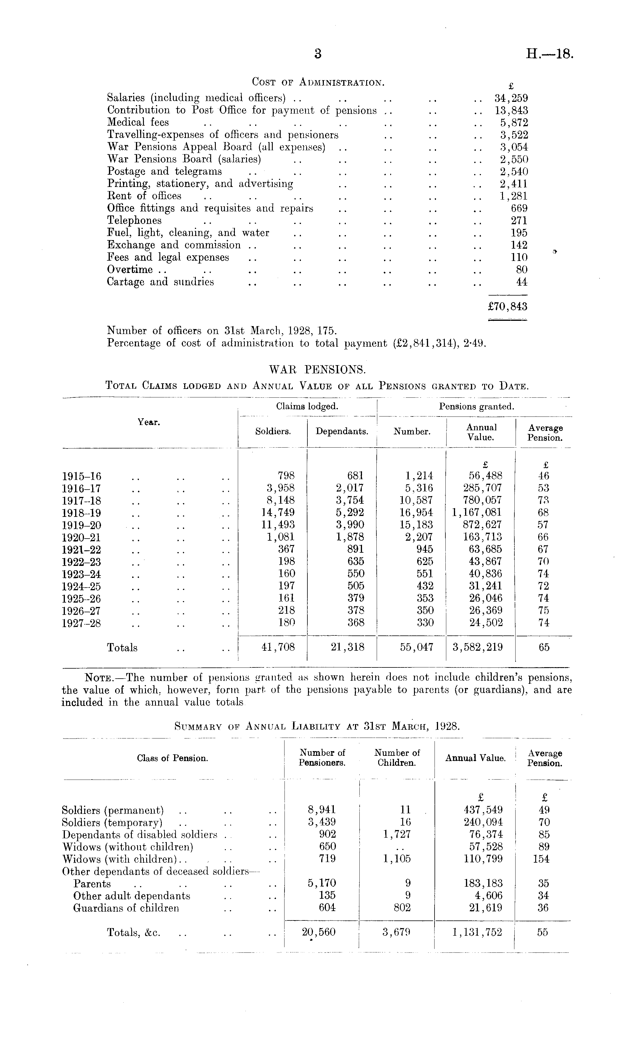 Cost of Administration. £ Salaries (including medical officers) . . .. .. .. 34,259 Contribution to Post Office for payment of pensions .. .. .. 13,843 Medical fees .. .. .. .. .. .. .. 5,872 Travelling-expenses of officers and pensioners .. .. .. 3,522 War Pensions Appeal Board (all expenses) .. .. .. .. 3,054 War Pensions Board (salaries) .. .. .. .. .. 2,550 Postage and telegrams .. .. . . . . .. . . 2,540 Printing, stationery, and advertising .. .. .. . . 2,411 Rent of offices .. . . .. .. .. .. 1,281 Office fittings and requisites and repairs .. .. .. .. 669 Telephones .. . . .. .. .. .. .. 271 Fuel, light, cleaning, and water .. .. .. .. .. 195 Exchange and commission .. .. .. .. . . .. 142 Fees and legal expenses .. .. .. .. .. .. 110 Overtime .. .. .. .. .. .. .. .. 80 Cartage and sundries .. .. .. .. .. .. 44 £70,843 Number of officers on 31st March, 1928, 175. Percentage of cost of administration to total payment (£2,841,314), 2-49. WAR PENSIONS. Total Claims lodged and Annual Value of all Pensions granted to Date.