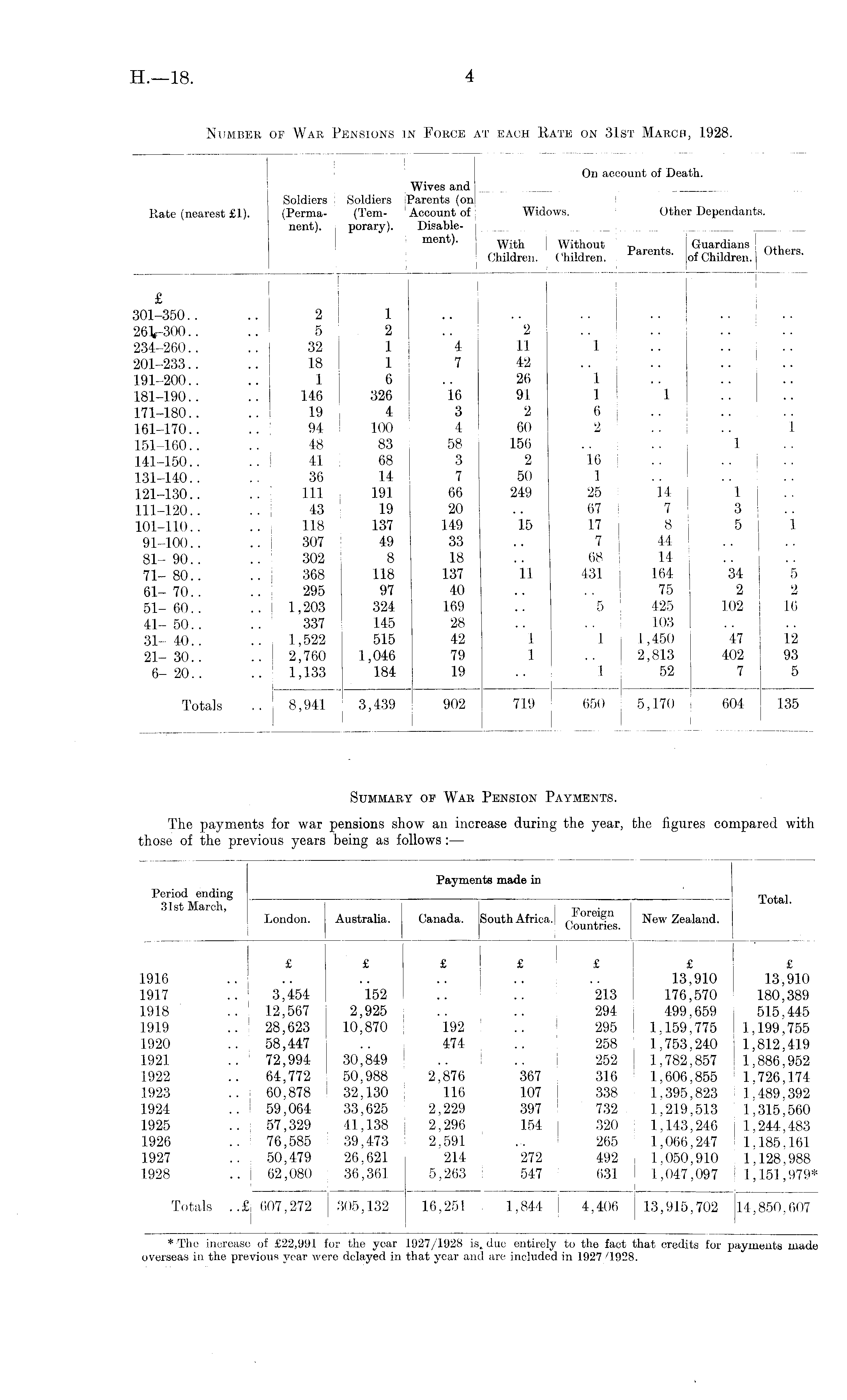 Payments made in Period ending ! Totah 31st March, i p re i n London. Australia. Canada. SouthAfrica. r , or ® 1 8 n New Zealand. Countries. | I i ; ■ ■ * £ £ £ £ £ £ £ 1916 .. .. .. .. 13,910 13,910 1917 .. 3,454 152 .. .. 213 176,570 180,389 1918 .. 12,567 2,925 .. .. 294 499,659 515,445 1919 .. 28,623 10,870 192 .. 295 1,159,775 1,199,755 1920 .. 58,447 .. 474 .. 258 1,753,240 1,812,419 1921 .. 72,994 30,849 .. .. j 252 1,782,857 1,886,952 1922 .. 64,772 50,988 2,876 367 316 1,606.855 1.726,174 1923 .. 60,878 32,130 116 107 I 338 1,395,823 1,489,392 1924 .. : 59,064- 33,625 2,229 397 732 1,219,513 1,315,560 1925 .. 57,329 41,138 2,296 .154 i 320 1,143,246 1,244,483 1926 .. 76,585 39,473 2,591 ... 265 1,066,247 1.185,161 1927 .. 50,479 26.621 214 272 492 1.050,910 1,128,988 1928 .. 62,080 36,361 5,263 : 547 631 1,047,097 1,151,979* Totals 607,272 305,132 16,251 1,844 4,406 13,915,702 14,850,607 * The increase of £22,991 for the year 1927/1928 is. due entirely to the fact that credits for payments made overseas in the previous year were delayed in that year and are included in 1927/1928.