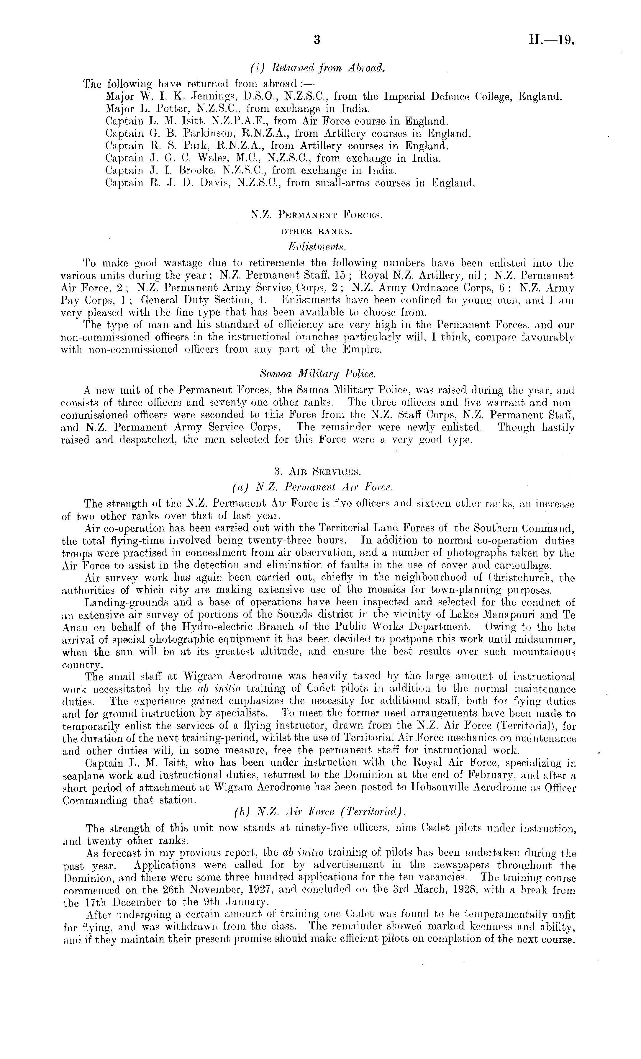 (i) Returned from Abroad. The following have returned from abroad : — Major W. I. K. Jennings, D.5.0., N.Z.S.C., from the Imperial Defence College, England. Major L. Potter, N.Z.S.C., from exchange in India. Captain L. M. Isitt, N.Z.P.A.F., from Air Force course in England. Captain G. B. Parkinson, R.N.Z.A., from Artillery courses in England. Captain R. S. Park, R.N.Z.A., from Artillery courses in England. Captain J. G. C. Wales, M.C., N.Z.S.C., from exchange in India. Captain J. I. Brooke, N.Z.S.C., from exchange in India. Captain R. J. D. Davis, N.Z.S.C., from small-arms courses in England. N.Z. Permanent Forces. OTHER RANKS. Enlistments. To make good wastage due to retirements the following numbers have been enlisted into the various units during the year : N.Z. Permanent Staff, 15 ; Royal N.Z. Artillery, nil; N.Z. Permanent Air Force, 2 ; N.Z. Permanent Army Service Corps, 2 ; N.Z. Army Ordnance Corps, 6 ; N.Z. Army Pay Corps, 1 ; General Duty Section, 4. Enlistments have been confined to young men, and lam very pleased with the fine type that has been available to choose from. The type of man and his standard of efficiency are very high in the Permanent Forces, and our non-commissioned officers in the instructional branches particularly will, 1 think, compare favourably with non-commissioned officers from any part of the Empire. Samoa Military Police. A new unit of the Permanent Forces, the Samoa Military Police, was raised during the year, and consists of three officers and seventy-one other ranks. The three officers and five warrant and non commissioned officers were seconded to this Force from the N.Z. Staff Corps, N.Z. Permanent Staff, and N.Z. Permanent Army Service Corps. The remainder were newly enlisted. Though hastily raised and despatched, the men selected for this Force were a very good type. 3. Air Services. (a) N.Z. Permanent Air Force. The strength of the N.Z. Permanent Air Force is five officers and sixteen other ranks, an increase of two other ranks over that of last year. Air co-operation has been carried out with the Territorial Land Forces of the Southern Command, the total flying-time involved being twenty-three hours. In addition to normal co-operation duties troops were practised in concealment from air observation, and a number of photographs taken by the Air Force to assist in the detection and elimination of faults in the use of cover and camouflage. Air survey work has again, been carried out, chiefly in the neighbourhood of Christchurch, the authorities of which city are making extensive use of the mosaics for town-planning purposes. Landing-grounds and a base of operations have been inspected and selected for the conduct of an extensive air survey of portions of the Sounds district in the vicinity of Lakes Manapouri and Te Anau on behalf of the Hydro-electric Branch of the Public Works Department. Owing to the late arrival of special photographic equipment it has been decided to postpone this work until midsummer, when the sun will be at its greatest altitude, and ensure the best results over such mountainous country. The small staff at Wigrain Aerodrome was heavily taxed by the large amount of instructional work necessitated by the ab initio training of Cadet pilots in addition to the normal maintenance duties. The experience gained emphasizes the necessity for additional staff, both for flying duties and for ground instruction by specialists. To meet the former need arrangements have been made to temporarily enlist the services of a flying instructor, drawn from the N.Z. Air Force (Territorial), for the duration of the next training-period, whilst the use of Territorial Air Force mechanics on maintenance and other duties will, in some measure, free the permanent staff for instructional work. Captain L. M. Isitt, who has been under instruction with the Royal Air Force, specializing in seaplane work and instructional duties, returned to the Dominion at the end of February, and after a short period of attachment at Wigram Aerodrome has been posted to Hobsonville Aerodrome as Officer Commanding that station. (b) N.Z. Air Force (Territorial). The strength of this unit now stands at ninety-five officers, nine Cadet pilots under instruction, and twenty other ranks. As forecast in my previous report, the ab initio training of pilots has been undertaken during the past year. Applications were called for by advertisement in the newspapers throughout the Dominion, and there were some three hundred applications for the ten vacancies. The training course commenced on the 26th November, 1927, and concluded on the 3rd March, 1928, with a break from the 17th December to the 9th January. After undergoing a certain amount of training one Cadet was found to be temperamentally unfit for flying, and was withdrawn from the class. The remainder showed marked keenness and ability, and if they maintain their present promise should make efficient pilots on completion of the next course.