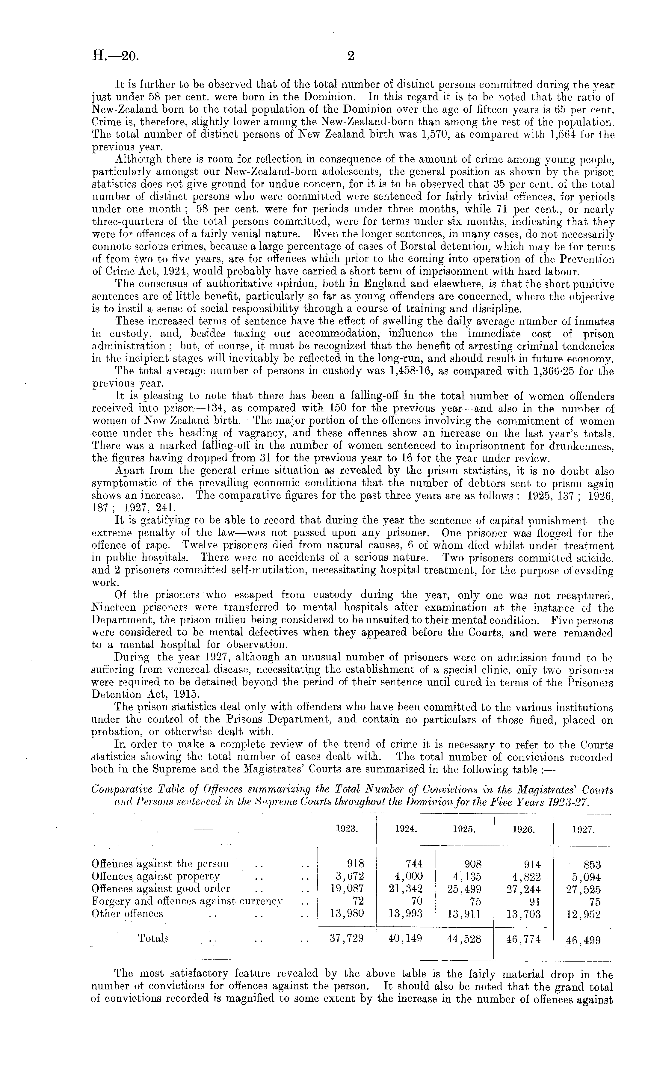 It is further to be observed that of the total number of distinct persons committed during the year just under 58 per cent, were born in the Dominion. In this regard it is to be noted that the ratio of New-Zealand-born to the total population of the Dominion over the age of fifteen years is 65 per cent. Crime is, therefore, slightly lower among the New-Zealand-born than among the rest of the population. The total number of distinct persons of New Zealand birth was 1,570, as compared with 1,564 for the previous year. Although there is room for reflection in consequence of the amount of crime among young people, particularly amongst our New-Zealand-born adolescents, the general position as shown by the prison statistics does not give ground for undue concern, for it is to be observed that 35 per cent, of the total number of distinct persons who were committed were sentenced for fairly trivial offences, for periods under one month ; 58 per cent, were for periods under three months, while 71 per cent., or nearly three-quarters of the total persons committed, were for terms under six months, indicating that they were for offences of a fairly venial nature. Even the longer sentences, in many cases, do not necessarily connote serious crimes, because a large percentage of cases of Borstal detention, which may be for terms of from two to five years, are for offences which prior to the coming into operation of the Prevention of Crime Act, 1924, would probably have carried a short term of imprisonment with hard labour. The consensus of authoritative opinion, both in England and elsewhere, is that the short punitive sentences are of little benefit, particularly so far as young offenders are concerned, where the objective is to instil a sense of social responsibility through a course of training and discipline. These increased terms of sentence have the effect of swelling the daily average number of inmates in custody, and, besides taxing our accommodation, influence the immediate cost of prison administration ; but, of course, it must be recognized that the benefit of arresting criminal tendencies in the incipient stages will inevitably be reflected in the long-run, and should result in future economy. The total average number of persons in custody was 1,458-16, as compared with 1,366-25 for the previous year. It is pleasing to note that there has been a falling-off in the total number of women offenders received into prison—134, as compared with 150 for the previous year —and also in the number of women of New Zealand birth. The major portion of the offences involving the commitment of women come under the heading of vagrancy, and these offences show an increase on the last year's totals. There was a marked falling-off in the number of women sentenced to imprisonment for drunkenness, the figures having dropped from 31 for the previous year to 16 for the year under review. Apart from the general crime situation as revealed by the prison statistics, it is no doubt also symptomatic of the prevailing economic conditions that the number of debtors sent to prison again shows an increase. The comparative figures for the past three years are as follows : 1925, 137 ; 1926, 187 ; 1927, 241. It is gratifying to be able to record that during the year the sentence of capital punishment—the extreme penalty of the law —was not passed upon any prisoner. One prisoner was flogged for the offence of rape. Twelve prisoners died from natural causes, 6of whom died whilst under treatment in public hospitals. There were no accidents of a serious nature. Two prisoners committed suicide, and 2 prisoners committed self-mutilation, necessitating hospital treatment, for the purpose of evading work. Of the prisoners who escaped from custody during the year, only one was not recaptured. Nineteen prisoners were transferred to mental hospitals after examination at the instance of the Department, the prison milieu being considered to be unsuited to their mental condition. Five persons were considered to be mental defectives when they appeared before the Courts, and were remanded to a mental hospital for observation. . During the year 1927, although an unusual number of prisoners were on admission found to be suffering from venereal disease, necessitating the establishment of a special clinic, only two prisoners were required to be detained beyond the period of their sentence until cured in terms of the Prisoners Detention Act, 1915. The prison statistics deal only with offenders who have been committed to the various institutions under the control of the Prisons Department, and contain no particulars of those fined, placed on probation, or otherwise dealt with. In order to make a complete review of the trend of crime it is necessary to refer to the Courts statistics showing the total number of cases dealt with. The total number of convictions recorded both in the Supreme and the Magistrates' Courts are summarized in the following table :—