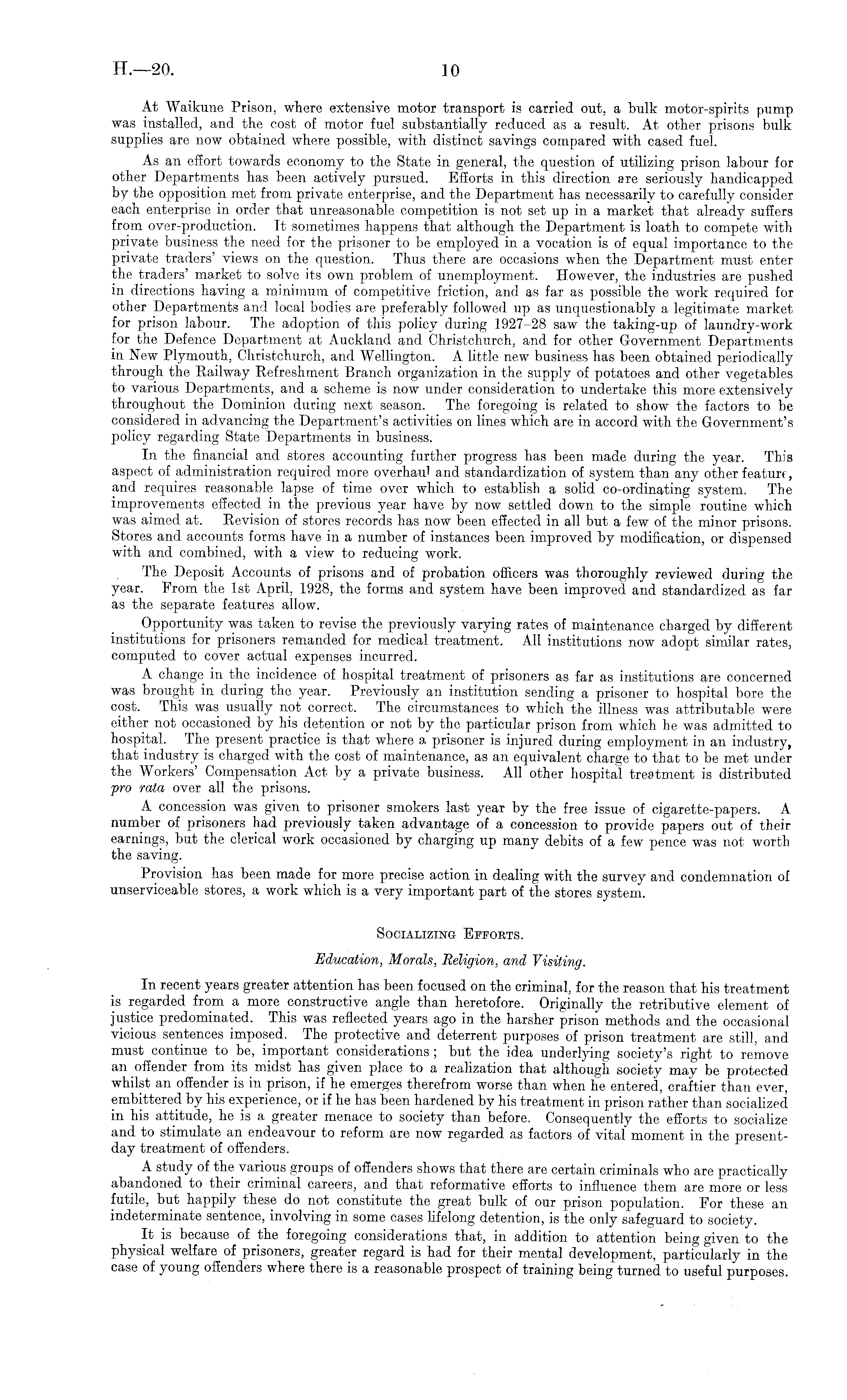 At Waikune Prison, where extensive motor transport is carried out, a bulk motor-spirits pump was installed, and the cost of motor fuel substantially reduced as a result. At other prisons bulk supplies are now obtained where possible, with distinct savings compared with cased fuel. As an effort towards economy to the State in general, the question of utilizing prison labour for other Departments has been actively pursued. Efforts in this direction are seriously handicapped by the opposition met from private enterprise, and the Department has necessarily to carefully consider each enterprise in order that unreasonable competition is not set up in a market that already suffers from over-production. It sometimes happens that although the Department is loath to compete with private business the need for the prisoner to be employed in a vocation is of equal importance to the private traders' views on the question. Thus there are occasions when the Department must enter the traders' market to solve its own problem of unemployment. However, the industries are pushed in directions having a minimum of competitive friction, and as far as possible the work required for other Departments and local bodies are preferably followed up as unquestionably a legitimate market for prison labour. The adoption of this policy during 1927-28 saw the taking-up of laundry-work for the Defence Department at Auckland and Christchurch, and for other Government Departments in New Plymouth, Christchurch, and Wellington. A little new business has been obtained periodically through the Railway Refreshment Branch organization in the supply of potatoes and other vegetables to various Departments, and a scheme is now under consideration to undertake this more extensively throughout the Dominion during next season. The foregoing is related to show the factors to be considered in advancing the Department's activities on lines which are in accord with the Government's policy regarding State Departments in business. In the financial and stores accounting further progress has been made during the year. This aspect of administration required more overhaul and standardization of system than any other feature, and requires reasonable lapse of time over which to establish a solid co-ordinating system. The improvements effected in the previous year have by now settled down to the simple routine which was aimed at. Revision of stores records has now been effected in all but a few of the minor prisons. Stores and accounts forms have in a number of instances been improved by modification, or dispensed with and combined, with a view to reducing work. The Deposit Accounts of prisons and of probation officers was thoroughly reviewed during the year. From the Ist April, 1928, the forms and system have been improved and standardized as far as the separate features allow. Opportunity was taken to revise the previously varying rates of maintenance charged by different institutions for prisoners remanded for medical treatment. All institutions now adopt similar rates, computed to cover actual expenses incurred. A change in the incidence of hospital treatment of prisoners as far as institutions are concerned was brought in during the year. Previously an institution sending a prisoner to hospital bore the cost. This was usually not correct. The circumstances to which the illness was attributable were either not occasioned by his detention or not by the particular prison from which he was admitted to hospital. The present practice is that where a prisoner is injured during employment in an industry, that industry is charged with the cost of maintenance, as an equivalent charge to that to be met under the Workers' Compensation Act by a private business. All other hospital treatment is distributed ■pro rata over all the prisons. A concession was given to prisoner smokers last year by the free issue of cigarette-papers. A number of prisoners had previously taken advantage of a concession to provide papers out of their earnings, but the clerical work occasioned by charging up many debits of a few pence was not worth the saving. Provision has been made for more precise action in dealing with the survey and condemnation of unserviceable stores, a work which is a very important part of the stores system. Socializing Efforts. Education, Morals, Religion, and Visiting. In recent years greater attention has been focused on the criminal, for the reason that his treatment is regarded from a more constructive angle than heretofore. Originally the retributive element of justice predominated. This was reflected years ago in the harsher prison methods and the occasional vicious sentences imposed. The protective and deterrent purposes of prison treatment are still, and must continue to be, important considerations \ but the idea underlying society's right to remove an offender from its midst has given place to a realization that although society may be protected whilst an offender is in prison, if he emerges therefrom worse than when he entered, craftier than ever, embittered by his experience, or if he has been hardened by his treatment in prison rather than socialized in his attitude, he is a greater menace to society than before. Consequently the efforts to socialize and to stimulate an endeavour to reform are now regarded as factors of vital moment in the presentday treatment of offenders. A study of the various groups of offenders shows that there are certain criminals who are practically abandoned to their criminal careers, and that reformative efforts to influence them are more or less futile, but happily these do not constitute the great bulk of our prison population. Eor these an indeterminate sentence, involving in some cases lifelong detention, is the only safeguard to society. It is because of the foregoing considerations that, iu addition to attention being given to the physical welfare of prisoners, greater regard is had for their mental development