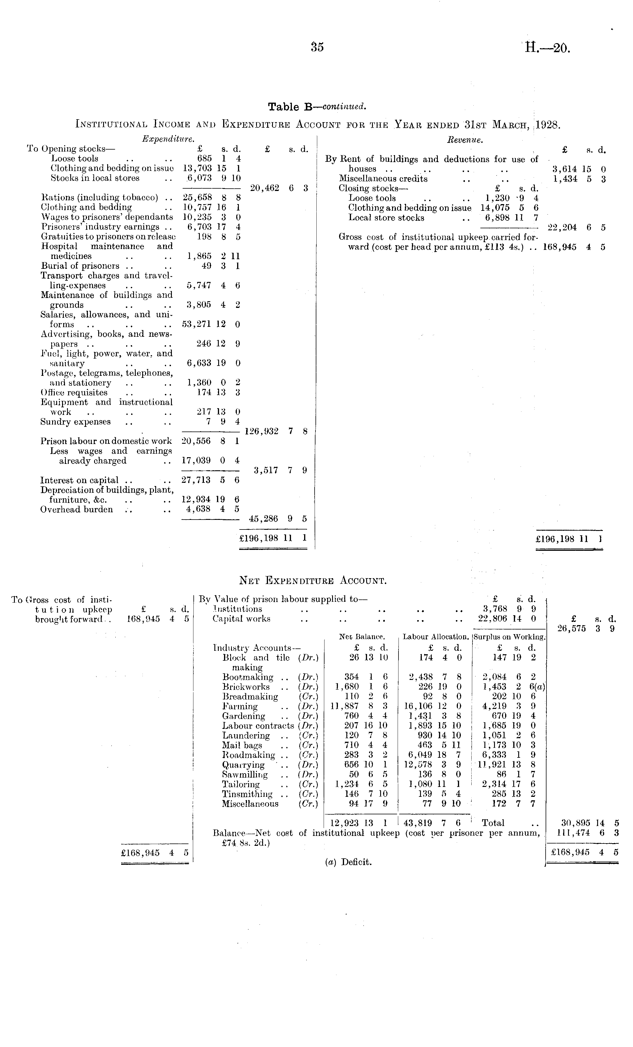 Table B —continued. Institutional Income and Expenditure Account for the Year ended 31st March, 1928. Expenditure. Revenue. To Opening stocks—• £ s. d. £ s. d. £ s. d. Loose tools .. .. 685 1 4 By Rent of buildings and deductions for use of Clothing and bedding on issue 13,703 15 1 houses .. .. .. .. 3,614 15 0 Stocks in local stores .. .6,073 910 j Miscellaneous credits .. .. 1,434 5 3 —-— 20,462 63 j Closing stocks— £ s. d. Rations (including tobacco) .. 25,658 8 8 ! Loose tools , .. .. 1,230 '9 4 Clothing and bedding .. 10,757 16 1 . Clothing.and bedding on issue. 14,075 5 6 Wages to prisoners'dependants 10,235 3 0 Local store stocks .. 6,898 11 7 Prisoners'industry earnings .. 6,703 17 4 —-—-—-— r 22,204 6 5 Gratuities to prisoners on release 198 8 5 Gross cost of institutional upkeep, carried forHospital maintenance and ward (cost per head per annum, £113 45.) . . 168,945 4 5 medicines .. .. 1,865 2 11 Burial of prisoners .. .. 49 3 1 Transport charges and travel-ling-expenses .. .. 5,747 4 6 Maintenance of buildings and grounds .. .. 3,805 4 2 Salaries, allowances, and uniforms .. .. .. 53,271 12 0 Advertising, books, and newspapers .. .. .. 246 12 9 Fuel, light, power, water, and sanitary .. .. 6,633 19 0 Postage, telegrams, telephones, and stationery .. .. 1,360 0 2 Office requisites .. .. 174 13 3 Equipment and instructional work .. .. .. 217 13 0 Sundry expenses .. .. 7 9 4 —— 126,932 7 8 Prison labour on domestic work 20,556 8 1 Less wages and earnings already charged .. 17,039 0 4 ——— 3,517 7 9 Interest on capital .. .. 27,713 5 6 Depreciation of buildings, plant, furniture, &c. .. .. 12,934 19 6 Overhead burden .. .. 4,638 4 5 —— 45,286 9 5 £196,198 11 1 £196,198 11 ] Net Expenditure Account. To Gross cost of insti- Bv Value of prison labour supplied to— £ s. d. tut ion upkeep £ s. d. Institutions .. .. .. .. .. 3,768 9 9 brought forward. . 168,945 4 5 Capital works .. .. .. .. .. 22,806 14 0 £ s. d. — 26,575 3 9 Net Balance. Labour Allocation. Surplus on Working.; Industry Accounts— £ s. d. £ s. d. £ s. d. Block and tile (Dr.) 26 13 10 174 4 0 147 19 2 making Bootmaking .. (Dr.) 354 1 6 2,438 7 8 2,084 6 2 Brickworks .. (Dr.) 1,680 1 6 226 19 0 1,453 2 6(a) Breadmaking (Cr.) 110 2 6 92 8 0 202 10 6 Farming .. (Dr.) 11,887 8 3 16,106 12 0 4,219 3 9 Gardening .. (Dr.) 760 4 4 1,431 3 8 670 19 4 Labour contracts (Dr.) 207 16 10 1,893 15 10 1,685 19 0 Laundering .. (Cr.) 120 7 8 930 14 10 1,051 2 6 Mail bags .. (Or.) 710 4 4 463 5 11 1,173 10 3 Roadmaking .. (Cr.) 283 3 2 6,049 18 7 6,333 1 9 Quarrying '.. (Dr.) 656 10 1 12,578 3 9 11,921 13 8 Sawmilling .. (Dr.) 50 6 5 136 8 0 86 1 7 Tailoring .. (Cr.) 1,234 6 5 1,080 11 1 2,314 17 6 Tinsmithing .. (Cr.) 146 7 10 139 5 4 285 13 2 Miscellaneous (Cr.) 94 17 9 77 9 10 172 7 7 12,923 13 1 I 43,819 76 j Total .. 30,895 14 5 Balance—Net cost of institutional upkeep (cost tier prisoner per annum, 111,474 6 3 £74 Bs. 2d.) * £168,945 4 5 £168,945 4 5 — (a) Deficit.