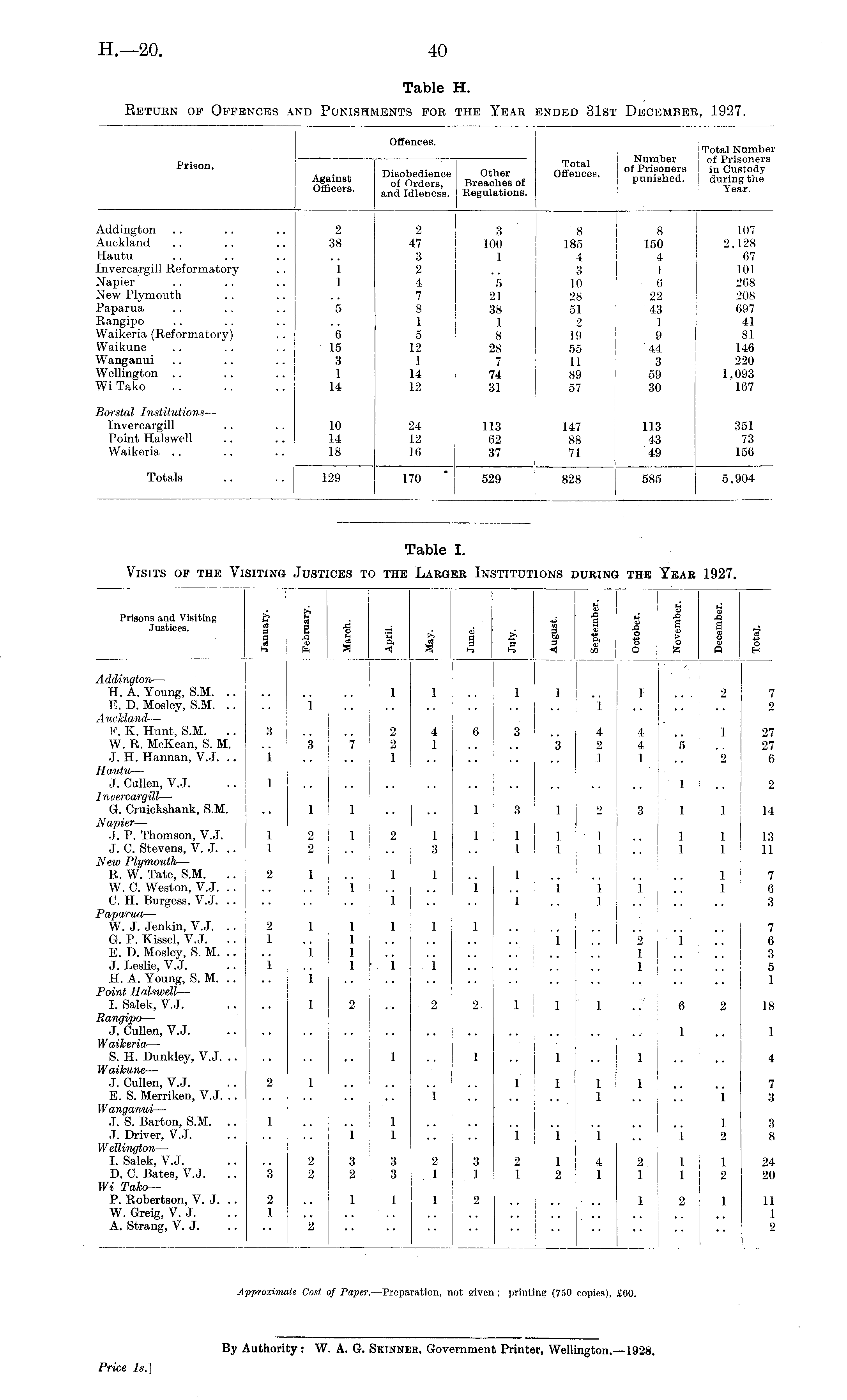 Table H. Return of Offences and Punishments for the Year ended 31st December, 1927.