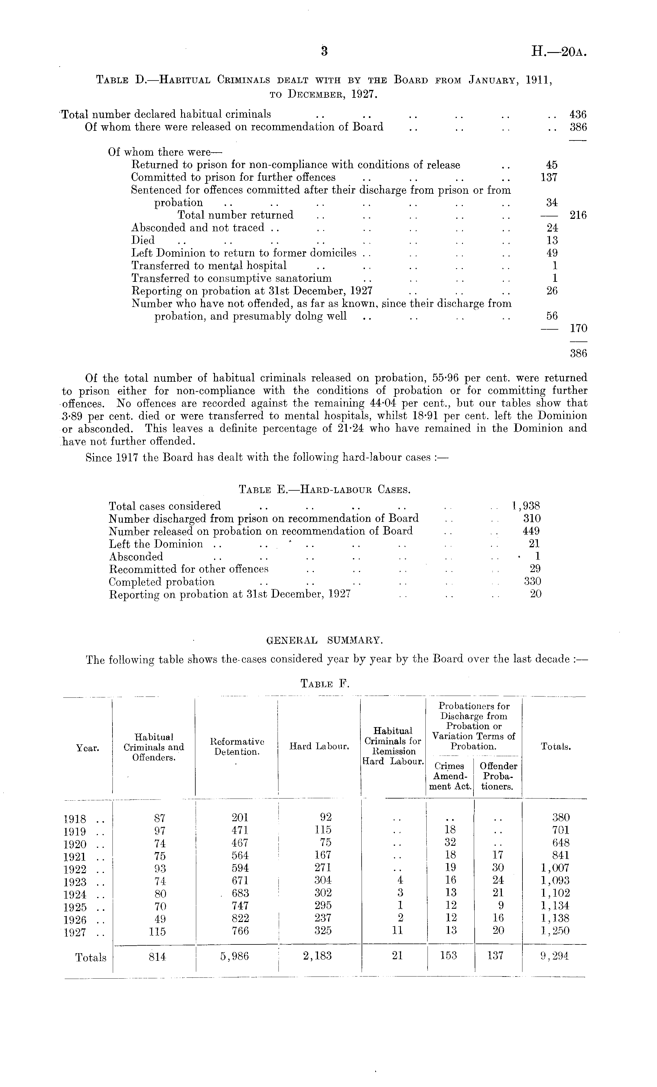 Table D.—Habitual Criminals dealt with by the Board from January, 1911, to December, 1927. Total number declared habitual criminals .. .. .. .. .. .. 436 Of whom there were released on recommendation of Board ... .. . . .. 386 Of whom there were — Returned to prison for non-compliance with conditions of release .. 45 Committed to prison for further offences .. .. .. .. 137 Sentenced for offences committed after their discharge from prison or from probation .. .. . . . . . . . . .. 34 Total number returned .. .. . . . . .. 216 Absconded and not traced .. . . .. . . . . . . 24 Died .. . . . . .. . . . . . . . . 13 Left Dominion to return to former domiciles . . . . . . . . 49 Transferred to mental hospital .. . . .. . . .. 1 Transferred to consumptive sanatorium .. . . 1 Reporting on probation at 31st December, 1927 . . .. .. 26 Number who have not offended, as far as known, since their discharge from probation, and presumably doing well .. . . . . . . 56 170 386 Of the total number of habitual criminals released on probation, 55*96 per cent, were returned to prison either for non-compliance with the conditions of probation or for committing further offences. No offences are recorded against the remaining 44-04 per cent., but our tables show that 3-89 per cent, died or were transferred to mental hospitals, whilst 18-91 per cent, left the Dominion or absconded. This leaves a definite percentage of 21-24 who have remained in the Dominion and have not further offended. Since 1917 the Board has dealt with the following hard-labour cases : — Table E. —Hard-labour Cases. Total cases considered .. .. .. .. . . 1 > 938 Number discharged from prison on recommendation of Board . . 310 Number released on probation on recommendation of Board . . 449 Left the Dominion .. .. * .. . . 21 Absconded . . . . . . .. . . 1 Recommitted for other offences . . . . . . . 29 Completed probation . . .. .. . . . 330 Reporting on probation at 31st December, 1927 . . . . 20