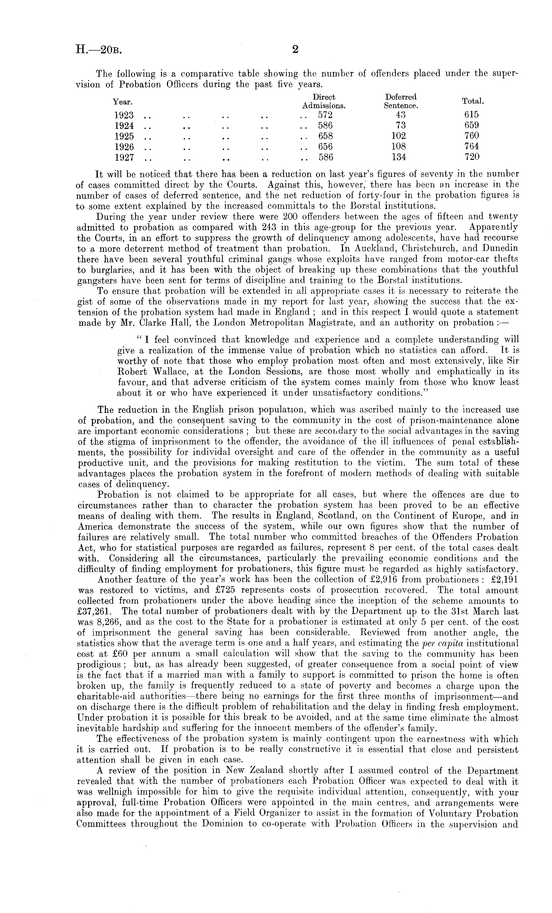 The following is a comparative table showing the nnmber of offenders placed under the supervision of Probation Officers during the past five years. ~ Direct Deferred m„±„i ear ' Admissions. Sentence. 1923 .. .. .. .. .. 572 43 615 1924 .. .. .. .. ..586 73 659 1925 .. .. .. .. .. 658 102 760 1926 .. .. .. .. .. 656 108 764 1927 .. .. .. .. ..586 134- 720 It will be noticed that there has been a reduction on last year's figures of seventy in the number of cases committed direct by the Courts. Against this, however,' there has been an increase in the number of cases of deferred sentence, and the net reduction of forty-four in the probation figures is to some extent explained by the increased committals to the Borstal institutions. During the year under review there were 200 offenders between the ages of fifteen and twenty admitted to probation as compared with 243 in this age-group for the previous year. Apparently the Courts, in an effort to suppress the growth of delinquency among adolescents, have had recourse to a more deterrent method of treatment than probation. In Auckland, Christchurch, and Dunedin there have been several youthful criminal gangs whose exploits have ranged from motor-car thefts to burglaries, and it has been with the object of breaking up these combinations that the youthful gangsters have been sent for terms of discipline and training to the Borstal institutions. To ensure that probation will be extended in all appropriate cases it is necessary to reiterate the gist of some of the observations made in my report for last year, showing the success that the extension of the probation system had made in England ; and in this respect I would quote a statement made by Mr. Clarke Hall, the London Metropolitan Magistrate, and an authority on probation : — " I feel convinced that knowledge and experience and a complete understanding will give a realization of the immense value of probation which no statistics can afford. It is worthy of note that those who employ probation most often and most extensively, like Sir Robert Wallace, at the London Sessions, are those most wholly and emphatically in its favour, and that adverse criticism of the system comes mainly from those who know least about it or who have experienced it under unsatisfactory conditions." The reduction in the English prison population, which was ascribed mainly to the increased use of probation, and the consequent saving to the community in the cost of prison-maintenance alone are important economic considerations ; but these are secondary to the social advantages in the saving of the stigma of imprisonment to the offender, the avoidance of the ill influences of penal establishments, the possibility for individal oversight and care of the offender in the community as a useful productive unit, and the provisions for making restitution to the victim. The sum total of these advantages places the probation system in the forefront of modern methods of dealing with suitable cases of delinquency. Probation is not claimed to be appropriate for all cases, but where the offences are due to circumstances rather than to character the probation system has been proved to be an effective means of dealing with them. The results in England, Scotland, on the Continent of Europe, and in America demonstrate the success of the system, while our own figures show that the number of failures are relatively small. The total number who committed breaches of the Offenders Probation Act, who for statistical purposes are regarded as failures, represent 8 per cent, of the total cases dealt with. Considering all the circumstances, particularly the prevailing economic conditions and the difficulty of finding employment for probationers, this figure must be regarded as highly satisfactory. Another feature of the year's work has been the collection of £2,916 from probationers : £2,191 was restored to victims, and £725 represents costs of prosecution recovered. The total amount collected from probationers under the above heading since the inception of the scheme amounts to £37,261. The total number of probationers dealt with by the Department up to the 31st March last was 8,266, and as the cost to the State for a probationer is estimated at only 5 per cent, of the cost of imprisonment the general saving has been considerable. Reviewed from another angle, the statistics show that the average term is one and a half years, and estimating the per capita institutional cost at £60 per annum a small calculation will show that the saving to the community has been prodigious ; but, as has already been suggested, of greater consequence from a social point of view is the fact that if a married man with a family to support is committed to prison the home is often broken up, the family is frequently reduced to a state of poverty and becomes a charge upon the charitable-aid authorities —there being no earnings for the first three months of imprisonment —and on discharge there is the difficult problem of rehabilitation and the delay in finding fresh employment. Under probation it is possible for this break to be avoided, and at the same time eliminate the almost inevitable hardship and suffering for the innocent members of the offender's family. The effectiveness of the probation system is mainly contingent upon the earnestness with which it is carried out. If probation is to be really constructive it is essential that close and persistent attention shall be given in each case. A review of the position in New Zealand shortly after I assumed control of the Department revealed that with the number of probationers each Probation Officer was expected to deal with it was wellnigh impossible for him to give the requisite individual attention, consequently, with your approval, full-time Probation Officers were appointed in the main centres, and arrangements were also made for the appointment of a Field Organizer to assist in the formation of Volunta
