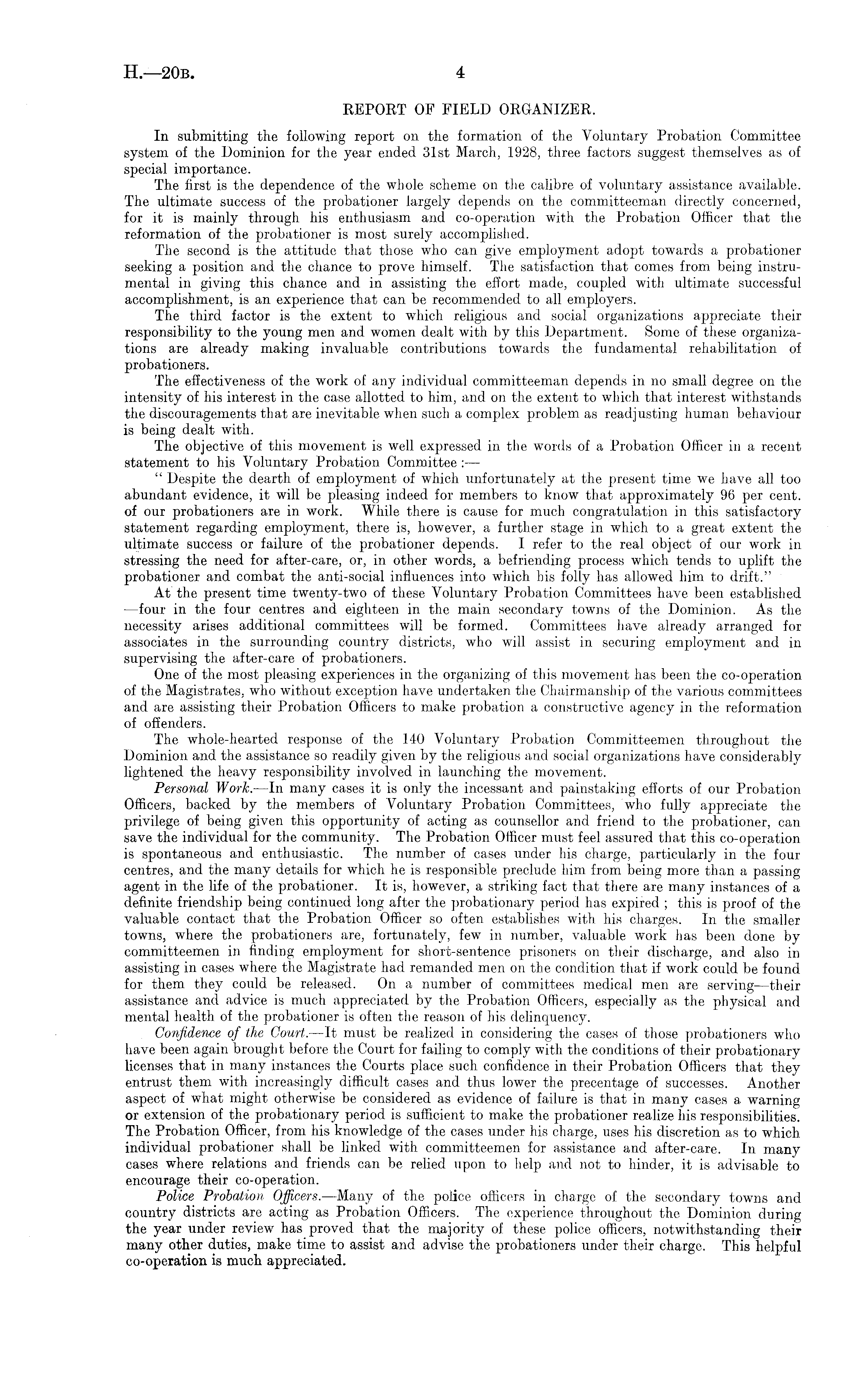REPORT OF FIELD ORGANIZER. In submitting the following report on the formation of the Voluntary Probation Committee system of the Dominion for the year ended 31st March, 1928, three factors suggest themselves as of special importance. The first is the dependence of the whole scheme on the calibre of voluntary assistance available. The ultimate success of the probationer largely depends on the committeeman directly concerned, for it is mainly through his enthusiasm and co-operation with the Probation Officer that the reformation of the probationer is most surely accomplished. The second is the attitude that those who can give employment adopt towards a probationer seeking a position and the chance to prove himself. The satisfaction that comes from being instrumental in giving this chance and in assisting the effort made, coupled with ultimate successful accomplishment, is an experience that can be recommended to all employers. The third factor is the extent to which religious and social organizations appreciate their responsibility to the young men and women dealt with by this Department. Some of these organizations are already making invaluable contributions towards the fundamental rehabilitation of probationers. The effectiveness of the work of any individual committeeman depends in no small degree on the intensity of his interest in the case allotted to him, and on the extent to which that interest withstands the discouragements that are inevitable when such a complex problem as readjusting human behaviour is being dealt with. The objective of this movement is well expressed in the words of a Probation Officer in a recent statement to his Voluntary Probation Committee : — " Despite the dearth of employment of which unfortunately at the present time we have all too abundant evidence, it will be pleasing indeed for members to know that approximately 96 per cent, of our probationers are in work. While there is cause for much congratulation in this satisfactory statement regarding employment, there is, however, a further stage in which to a great extent the ultimate success or failure of the probationer depends. I refer to the real object of our work in stressing the need for after-care, or, in other words, a befriending process which tends to uplift the probationer and combat the anti-social influences into which his folly has allowed him to drift." At the present time twenty-two of these Voluntary Probation Committees have been established —four in the four centres and eighteen in the main secondary towns of the Dominion. As the necessity arises additional committees will be formed. Committees have already arranged for associates in the surrounding country districts, who will assist in securing employment and in supervising the after-care of probationers. One of the most pleasing experiences in the organizing of this movement has been the co-operation of the Magistrates, who without exception have undertaken the Chairmanship of the various committees and are assisting their Probation Officers to make probation a constructive agency in the reformation of offenders. The whole-hearted response of the 140 Voluntary Probation Committeemen throughout the Dominion and the assistance so readily given by the religious and social organizations have considerably lightened the heavy responsibility involved in launching the movement. Personal Work. —In many cases it is only the incessant and painstaking efforts of our Probation Officers, backed by the members of Voluntary Probation Committees, who fully appreciate the privilege of being given this opportunity of acting as counsellor and friend to the probationer, can save the individual for the community. The Probation Officer must feel assured that this co-operation is spontaneous and enthusiastic. The number of cases under his charge, particularly in the four centres, and the many details for which he is responsible preclude him from being more than a passing agent in the life of the probationer. It is, however, a striking fact that there are many instances of a definite friendship being continued long after the probationary period has expired ; this is proof of the valuable contact that the Probation Officer so often establishes with his charges. In the smaller towns, where the probationers are, fortunately, few in number, valuable work has been done by committeemen in finding employment for short-sentence prisoners on their discharge, and also in assisting in cases where the Magistrate had remanded men on the condition that if work could be found for them they could be released. On a number of committees medical men are assistance and advice is much appreciated by the Probation Officers, especially as the physical and mental health of the probationer is often the reason of his delinquency. Gonfidewe of the Court. —It must be realized in considering the cases of those probationers who have been again brought before the Court for failing to comply with the conditions of their probationary licenses that in many instances the Courts place such confidence in their Probation Officers that they entrust them with increasingly difficult cases and thus lower the precentage of successes. Another aspect of what might otherwise be considered as evidence of failure is that in many cases a warning or extension of the probationary period is sufficient to make the probationer realize his responsibilities. The Probation Officer, from his knowledge of the cases under his charge, uses his discretion as to which individual probationer shall be linked with committeemen for assistance and after-care. In many cases where relations and friends can be relied upon to help and not to hinder, it is advisable to encourage their co-operation. Police Probation Officers. —Many of the police officers in charge of the secondary towns and country districts are acting as Probation Officers. The experience throughout the Dominion during the year under review has proved that