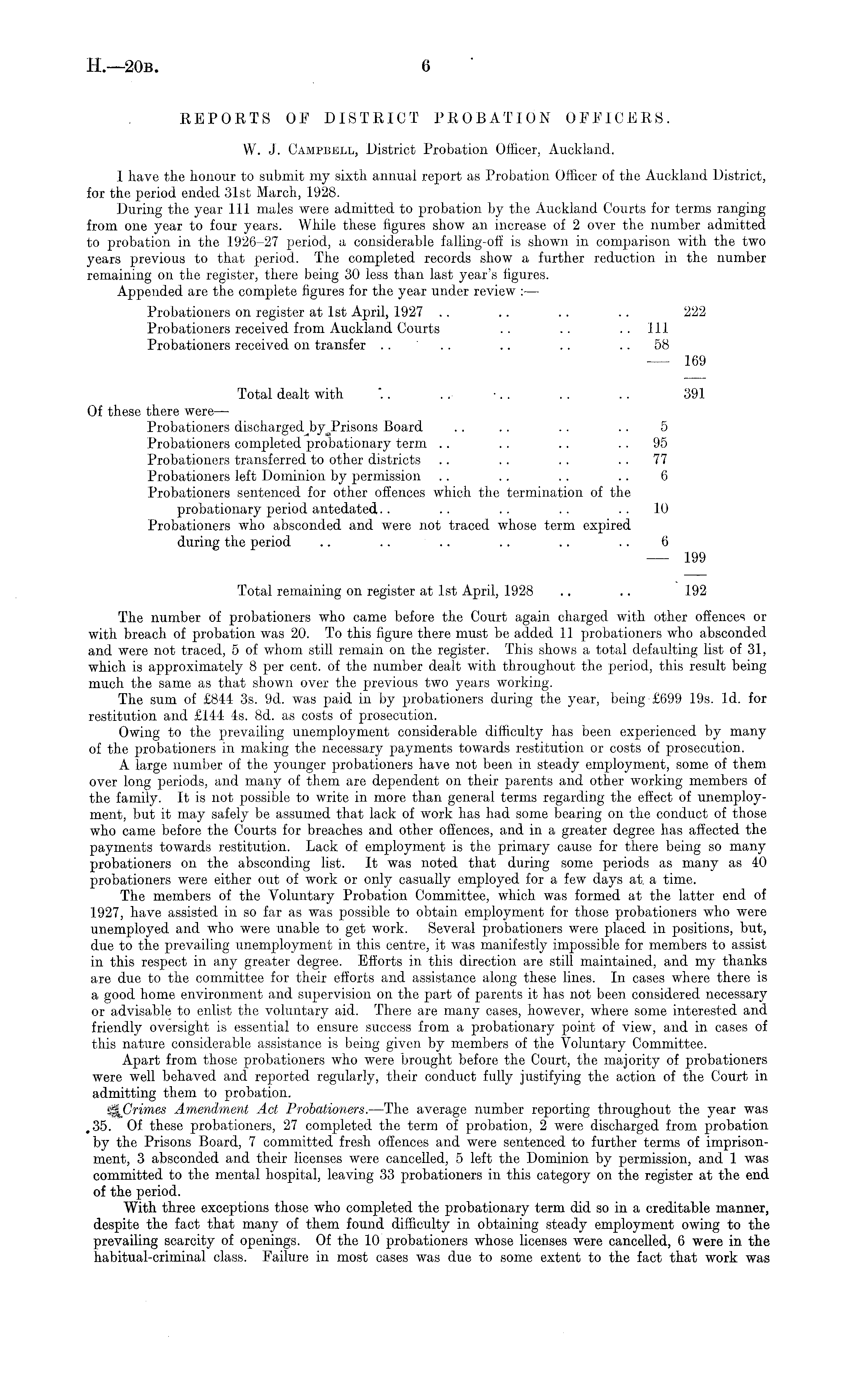 REPORTS OF DISTRICT PROBATION OFFICERS. \Y. J. Campbell, District Probation Officer, Auckland. 1 have the honour to submit my sixth annual report as Probation Officer of the Auckland District, for the period ended 31st March, 1928. During the year 111 males were admitted to probation by the Auckland Courts for terms ranging from one year to four years. While these figures show an increase of 2 over the number admitted to probation in the 1926-27 period, a considerable falling-off is shown in comparison with the two years previous to that period. The completed records show a further reduction in the number remaining on the register, there being 30 less than last year's figures. Appended are the complete figures for the year under review : — Probationers on register at Ist April, 1927 .. .. .. .. 222 Probationers received from Auckland Courts . . .. . . 11l Probationers received on transfer .... .. .. 58 169 Total dealt with '.. .. •.. .. .. 391 Of these there were— Probationers Board .. .. .. .. 5 Probationers completed probationary term .. .. .. 95 Probationers transferred to other districts .. .. .. .. 77 Probationers left Dominion by permission .. .. .. .. 6 Probationers sentenced for other offences which the termination of the probationary period antedated. . .. .. . . 10 Probationers who absconded and were not traced whose term expired during the period .. .. .. .. .. .. 6 199 Total remaining on register at Ist April, 1928 .. .. 192 The number of probationers who came before the Court again charged with other offences or with breach of probation was 20. To this figure there must be added 11 probationers who absconded and were not traced, sof whom still remain on the register. This shows a total defaulting list of 31, which is approximately 8 per cent, of the number dealt with throughout the period, this result being much the same as that shown over the previous two years working. The sum of £844 3s. 9d. was paid in by probationers during the year, being £699 19s. Id. for restitution and £144 4s. Bd. as costs of prosecution. Owing to the prevailing unemployment considerable difficulty has been experienced by many of the probationers in making the necessary payments towards restitution or costs of prosecution. A large number of the younger probationers have not been in steady employment, some of them over long periods, and many of them are dependent on their parents and other working members of the family. It is not possible to write in more than general terms regarding the effect of unemployment, but it may safely be assumed that lack of work has had some bearing on the conduct of those who came before the Courts for breaches and other offences, and in a greater degree has affected the payments towards restitution. Lack of employment is the primary cause for there being so many probationers on the absconding list. It was noted that during some periods as many as 40 probationers were either out of work or only casually employed for a few days at. a time. The members of the Voluntary Probation Committee, which was formed at the latter end of 1927, have assisted in so far as was possible to obtain employment for those probationers who were unemployed and who were unable to get work. Several probationers were placed in positions, but, due to the prevailing unemployment in this centre, it was manifestly impossible for members to assist in this respect in any greater degree. Efforts in this direction are still maintained, and my thanks are due to the committee for their efforts and assistance along these lines. In cases where there is a good home environment and supervision on the part of parents it has not been considered necessary or advisable to enlist the voluntary aid. There are many cases, however, where some interested and friendly oversight is essential to ensure success from a probationary point of view, and in cases of this nature considerable assistance is being given by members of the Voluntary Committee. Apart from those probationers who were brought before the Court, the majority of probationers were well behaved and reported regularly, their conduct fully justifying the action of the Court in admitting them to probation. Crimes Amendment Act Probationers. —The average number reporting throughout the year was ,35. Of these probationers, 27 completed the term of probation, 2 were discharged from probation by the Prisons Board, 7 committed fresh offences and were sentenced to further terms of imprisonment, 3 absconded and their licenses were cancelled, 5 left the Dominion by permission, and 1 was committed to the mental hospital, leaving 33 probationers in this category on the register at the end of the period. With three exceptions those who completed the probationary term did so in a creditable manner, despite the fact that many of them found difficulty in obtaining steady employment owing to the prevailing scarcity of openings. Of the 10 probationers whose licenses were cancelled, 6 were in the habitual-criminal class. Failure in most cases was due to some extent to the fact that work was