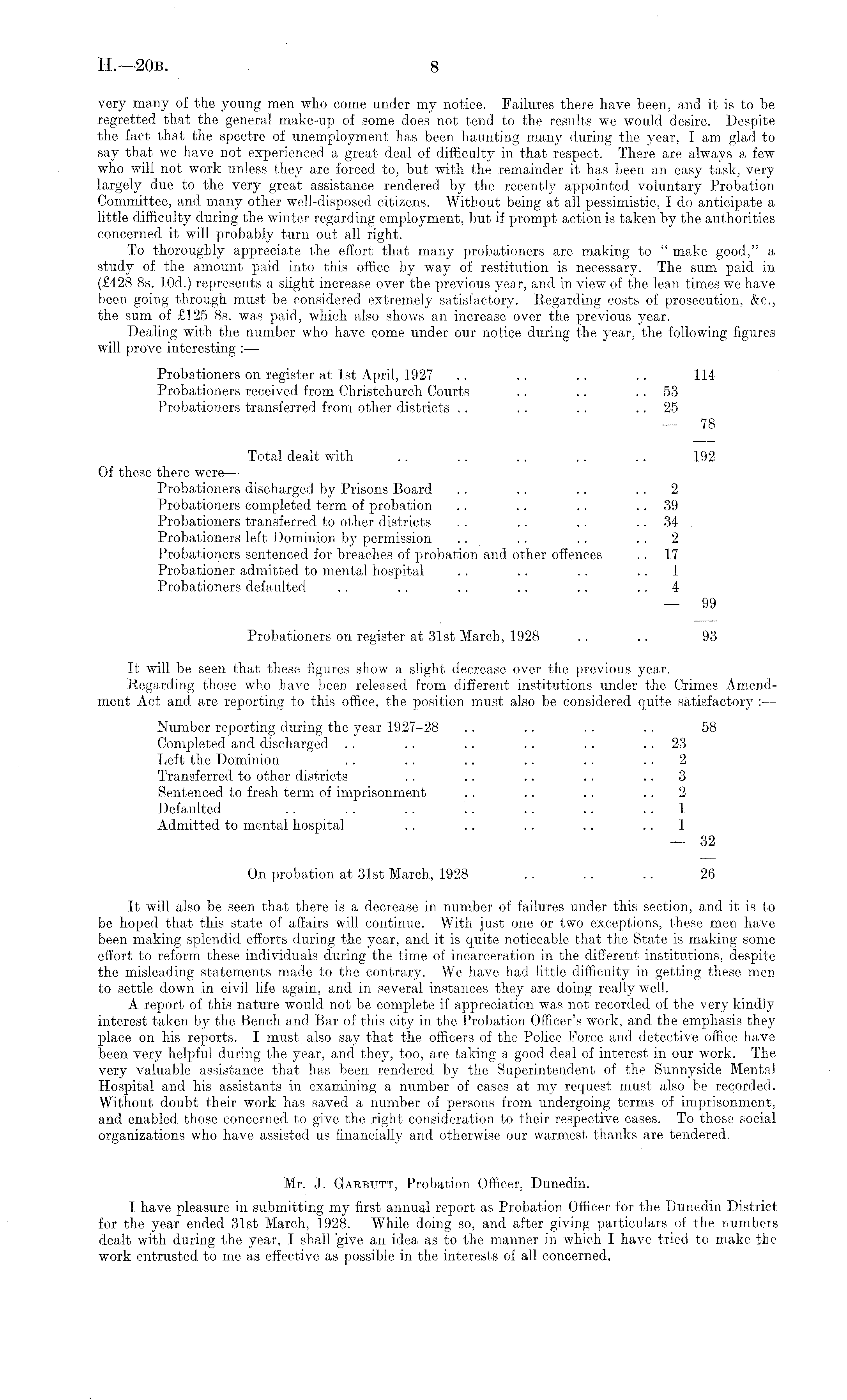 very many of the young men who come under my notice. Failures there have been, and it is to he regretted that the general make-up of some does not tend to the results we would desire. Despite the fact that the spectre of unemployment has been haunting many during the year, I am glad to say that we have not experienced a great deal of difficulty in that respect. There are always a few who will not work unless they are forced to, but with the remainder it has been an easy task, very largely due to the very great assistance rendered by the recently appointed voluntary Probation Committee, and many other well-disposed citizens. Without being at all pessimistic, Ido anticipate a little difficulty during the winter regarding employment, but if prompt action is taken by the authorities concerned it will probably turn out all right. To thoroughly appreciate the effort that many probationers are making to " make good," a study of the amount paid into this office by way of restitution is necessary. The sum paid in (£428 Bs. lOd.) represents a slight increase over the previous year, and in view of the lean times we have been going through must be considered extremely satisfactory. Regarding costs of prosecution, &c., the sum of £125 Bs. was paid, which also shows an increase over the previous year. Dealing with the number who have come under our notice during the year, the following figures will prove interesting : — Probationers on register at Ist April, 1927 .. .. .. .. 114 Probationers received from Christchurch Courts .. .. 53 Probationers transferred from other districts .. .. .. 25 — 78 Total dealt with .. . . .. .. .. 192 Of these there were — Probationers discharged by Prisons Board .. .. .. 2 Probationers completed term of probation .. .. .. 39 Probationers transferred to other districts . . .. . . 34 Probationers left Dominion by permission . . . . .. 2 Probationers sentenced for breaches of probation and other offences .. 17 Probationer admitted to mental hospital . . .. .. 1 Probationers defaulted .. .. .. .. .. 4 — 99 Probationers on register at 31st March, 1928 . . .. 93 It will be seen that these figures show a slight decrease over the previous year. Regarding those who have been released from different institutions under the Crimes Amendment Act and are reporting to this office, the position must also be considered quite satisfactory : — Number reporting during the year 1927-28 .. .. .. . . 58 Completed and discharged . . .. .. .. . . 23 Left the Dominion . . .. .. .. .. 2 Transferred to other districts .. .. .. .. 3 Sentenced to fresh term of imprisonment .. .. .. 2 Defaulted . . . . .. . . .. .. 1 Admitted to mental hospital .. .. .. .. 1 — 32 On probation at 31st March, 1928 .. . . .. 26 It will also be seen that there is a decrease in number of failures under this section, and it is to be hoped that this state of affairs will continue. With just one or two exceptions, these men have been making splendid efforts during the year, and it is quite noticeable that the State is making some effort to reform these individuals during the time of incarceration in the different institutions, despite the misleading statements made to the contrary. We have had little difficulty in getting these men to settle down in civil life again, and in several instances they are doing really well. A report of this nature would not be complete if appreciation was not recorded of the very kindly interest taken by the Bench and Bar of this city in the Probation Officer's work, and the emphasis they place on his reports. I must also say that the officers of the Police Force and detective office have been very helpful during the year, and they, too, are taking a good deal of interest in our work. The very valuable assistance that has been rendered by the Superintendent of the Sunnyside Mental Hospital and his assistants in examining a number of cases at my request must also be recorded. Without doubt their work has saved a number of persons from undergoing terms of imprisonment, and enabled those concerned to give the right consideration to their respective cases. To those social organizations who have assisted us financially and otherwise our warmest thanks are tendered. Mr. J. GtARBUTT, Probation Officer, Dunedin. I have pleasure in submitting my first annual report as Probation Officer for the Dunedin District for the year ended 31st March, 1928. While doing so, and after giving particulars of the numbers dealt with during the year, I shall "give an idea as to the manner in which I have tried to make the work entrusted to me as effective as possible in the interests of all concerned.