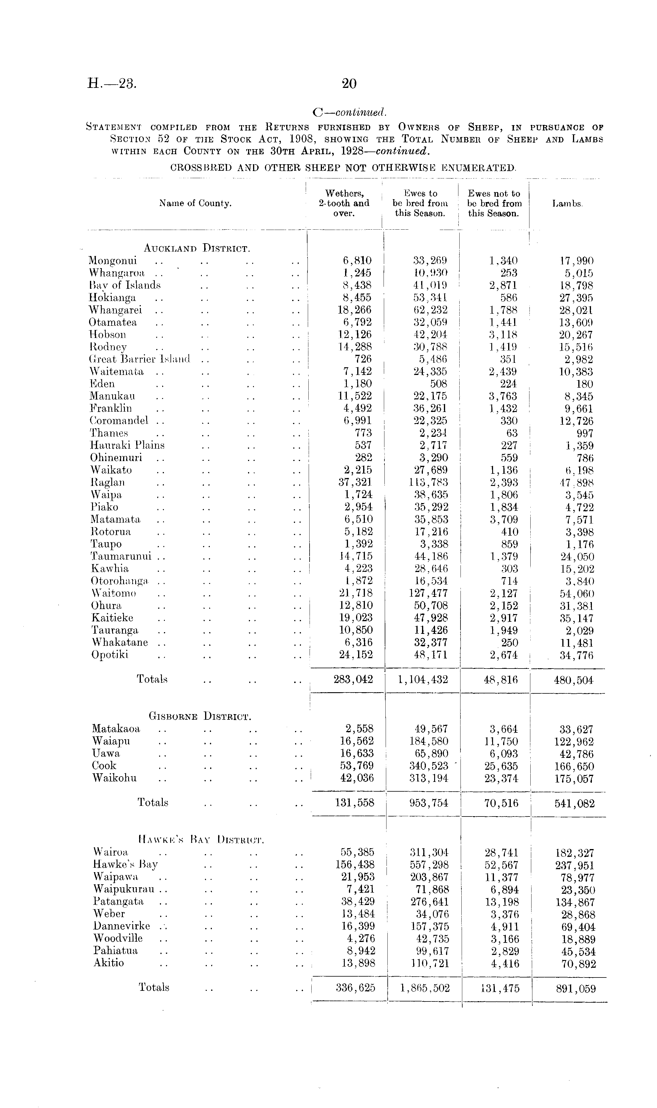 Wethers, Ewes to I Ewes not to Name of County. 2-tooth and be bred from be bred from Lambs. over. this Season. this Season. I ; [ ! : Auckland District. Mongonui .. .. .. .. 6,810 | 33,269 | 1,340 17,990 Whangaroa .. .. .. .. 1,245 10,930 j 253 5,015 Bay of Islands .. .. .. 8,438 41,019 2,871 18,798 Hokianga .. .. .. .. 8,455 53,341 586 27,395 Whangarei .. .. .. .. j 18,266 62,232 i 1,788 ! 28,021 Otamatea .. .. .. .. 6,792 32,059 1,441 13,609 Hobson .. .. .. .. 12.126 42,204 3,118 20,267 Rodney .. .. .. .. 14,288 30,788 , 1,419 15,516 Great Barrier Island .. .. .. 726 5,486 ! 351 j 2,982 Waitemata .. .. . .. 7,142 24,335 2,439 10,383 Eden .. .. .. .. 1,180 508 224 180 Manukau .. .. .. .. 11,522 22,175 ! 3,763 8,345 Franklin .. .. .. .. 4,492 36,261 1,432 9,661 Coromandel .. .. .. .. 6,991 22,325 ' 330 12,726 Thames .. .. .. .. 773 2,234 63 997 Hauraki Plains .. .. .. 537 2,717 227 1,359 Ohinemuri .. .. .. .. 282 3,290 559 786 Waikato .. .. .. .. j 2,215 27,689 I 1,136 6,198 Raglan .. .. .. .. 37,321 113,783 , 2,393 47 898 Waipa .. .. .. .. 1,724 38,635 : 1,806 3,545 Piako .. .. .. .. 2,954 35,292 1,834 4,722 Matamata .. .. .. .. 6,510 35,853 3,709 7,571 Rotorua .. .. .. .. 5,182 17,216 410 3,398 Taupo .. .. .. .. 1,392 3,338 859 1,176 Taumarunui .. .. .. .. 14,715 44,186 1,379 24,050 Kawliia .. .. .. .. | 4,223 28,646 303 15,202 Otorohanga .. .. .. .. 1,872 16,534 714 3,840 Waitomo .. .. .. .. 21,718 127,477 2,127 j 54,060 Ohura .. .. .. ... 12,810 50,708 2,152 31,381 Kaitieke .. .. .. .. 19,023 47,928 2,917 35,147 Tauranga .. .. .. .. 10,850 11,426 1,949 2,029 Whakatane .. .. .. .. 6,316 32,377 250 11,481 Opotiki .. .. .. .. 24,152 48,171 2,674 34,776 Totals .. .. .. 283,042 1,104,432 48,816 480,504 Gtsborne District. Matakaoa .. .. .. .. 2,558 4-9,567 3,664 33,627 Waiapn .. .. .. .. 16,562 184,580 11,750 122,962 Uawa .. .. .. .. 16,633 65,890 6,093 42,786 Cook .. .. .. .. 53,769 340,523' 25,635 166,650 Waikohu .. .. .. .. 42,036 313,194 23,374 175,057 Totals .. .. .. 131,558 953,754 70,516 541,082 Hawke's Bay District. Wairoa .. .. .. .. 55,385 311,304 28,741 182,327 Hawke's Bay .. .. .. 156,438 557,298 52,567 237,951 Waipawa .. .. .. .. 21,953 203,867 11,377 78,977 Waipukurau .. .. .. .. 7,421 71,868 6,894 23,350 Patangata .. .. .. .. 38,429 276,641 13,198 134,867 Weber .. .. .. .. 13,484 34,076 3,376 28,868 Dannevirke .. .. .. .. 16,399 157,375 4,911 69,404 Woodville .. .. .. .. 4,276 42,735 3,166 18,889 Pahiatua .. .. .. .. 8,942 99,617 2,829 45,534 Akitio .. .. .. .. 13,898 110,721 4,416 70,892 Totals .. .. .. 336,625 1,865,502 131,475 891,059