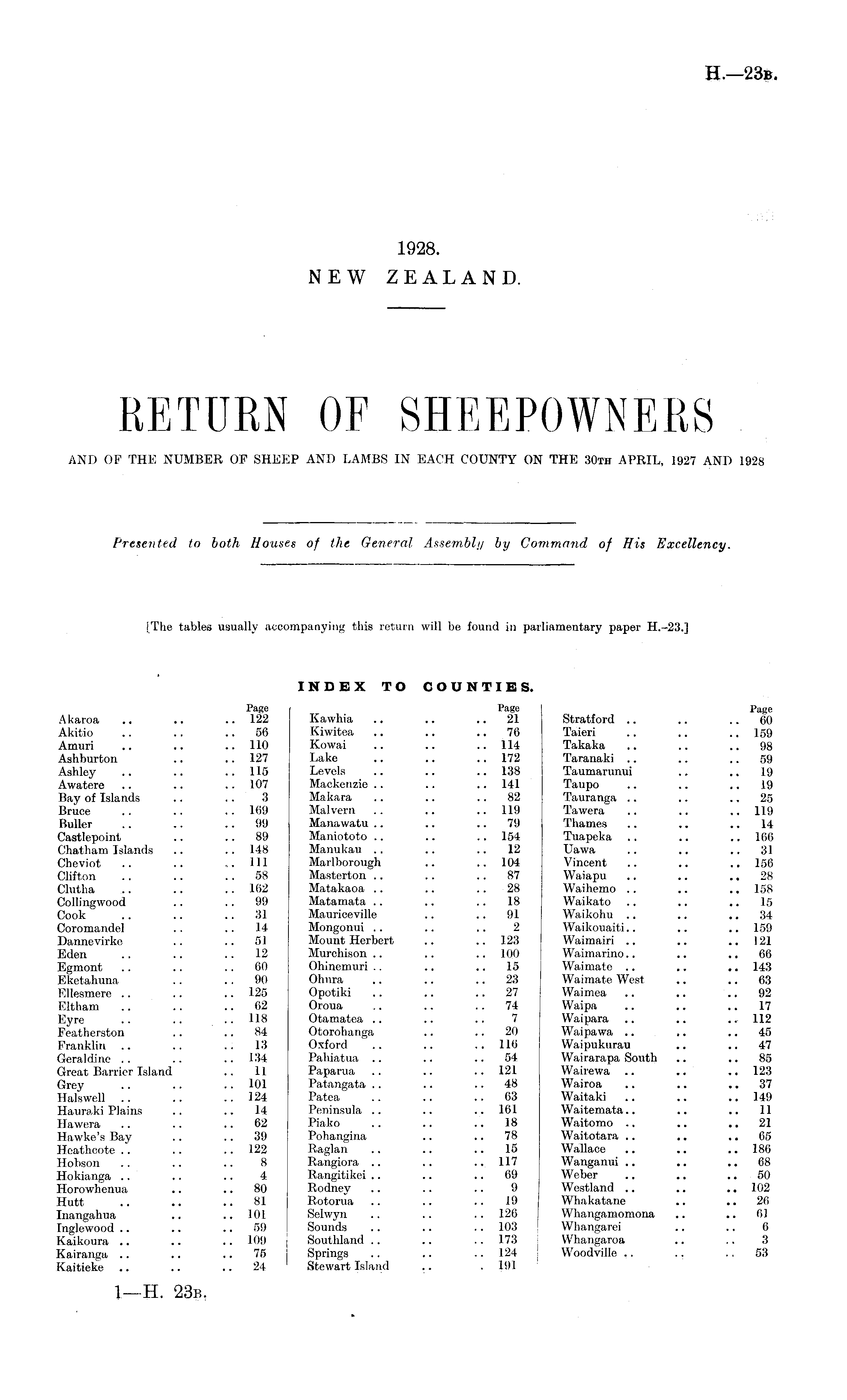 [The tables usually accompanying this return will be found in parliamentary paper H.-23.] INDEX TO COUNTIES. Page Page Page Akaroa .. .. .. 122 Kawhia .. .. .. 21 Stratford .. .. ..60 Akitio .. .. 56 Kiwitea .. .. 76 Taieri .. .. .. 159 Amuri .. .. ..110 Kowai .. .. ..114 Takaka .. .. ..98 Ashburton .. .. 127 Lake .. .. .. 172 Taranaki .. .. .. 59 Ashley .. .. ..115 Levels .. .. .. 138 Taumarunui .. .. 19 Awatere .. .. .. 107 Mackenzie .. .. .. 141 Taupo .. .. .. 19 Bay of Islands .. .. 3 Makara .. .. 82 Tauranga .. .. 25 Bruce .. .. .. 169 Malvern .. .. .. 119 Tawera .. .. .. 119 Buller .. .. 99 Manawatu .. .. .. 79 Thames .. .. .. 14 Castlepoint .. .. 89 Maniototo .. .. .. 154 Tuapeka .. .. .. 166 Chatham Islands .. .. 148 Manukau .. .. .. 12 Uawa .. .. .. 31 Cheviot .. .. ~111 Marlborough .. .. 104 Vincent .. .. .. 156 Clifton .. .. 58 Masterton .. .. 87 Waiapu .. .. 28 Clutha ~ .. .. 162 Matakaoa .. .. 28 Waihemo .. .. .. 158 Collingwood .. .. 99 Matamata .. .. .. 18 Waikato .. .. .. 15 Cook .. .. .. 31 Mauriceville .. 91 Waikohu .. .. .. 34 Coromandel .. .. 14 Mongonui .. .. .. 2 Waikouaiti.. .. .. 159 Dannevirke .. .. 51 Mount Herbert .. .. 123 Waimairi .. .. ..121 Eden .. .. .. 12 Murchison .. .. .. 100 Waimarino.. .. .. 66 Egmont .. .. 60 Ohinemuri .. .. 15 Waimate .. .. .. 143 Eketahuna .. .. 90 Ohnra .. .. 23 Waimate West .. .. 63 Ellesmere .. .. .. 125 Opotiki .. .. 27 Waimea .. .. .. 92 Eltham .. .. 62 Oroua .. .. .. 74 Waipa .. .. .. 17 Eyre .. .. .. 118 Otamatea .. .. .. 7 Waipara .. .. .. 112 Featherston .. .. 84 Otorohanga .. .. 20 Waipawa .. .. .. 45 Franklin .. .. .. 13 Oxford .. .. .. 116 Waipukurau .. .. 47 Geraldine .. .. .. 134 Pahiatua .. .. 54 Wairarapa South .. .. 85 Great Barrier Island .. 11 Paparua .. .. .. 121 Wairewa .. .. .. 123 Grey .. .. .. 101 Patangata .. .. 48 Wairoa .. .. .. 37 Halswell .. .. .. 124 Patea .. .. 63 Waitaki .. .. .. 149 Hauraki Plains .. .. 14 Peninsula .. .. .. 161 Waitemata.. .. .. 11 Hawera .. .. 62 Piako .. .. .. 18 Waitomo .. .. .. 21 Hawke's Bay .. .. 39 Pohangina .. .. 78 Waitotara .. .. 65 Heathcote .. .. .. 122 Raglan .. .. .. 15 Wallace .. .. .. 186 Hobson .. .. .. 8 Rangiora .. .. .. 117 Wanganui .. .. ..68 Hokianga .. .. .. 4 Rangitikei .. .. .. 69 Weber .. .. 50 Horowhenua .. .. 80 Rodney .. .. .. 9 Westland .. .. .. 102 Hutt .. .. .. 81 Rotorua .. .. .. 19 j Whakatane .. .. 26 Inangahua .. .. 101 Selwyn .. .. .. 126 I Whangamomona .. .. 61 Inglewood .. .. 59 Sounds .. .. .. 103 [ Whangarei .. .. 6 Kaikoura .. .. .. 109 Southland .. .. .. 173 Whangaroa .. .. 3 Kairanga .. .. .. 75 Springs .. .. 124 Woodville ~ .. .. 53 Kaitieke .. .. .. 24 Stewart Island .. -191