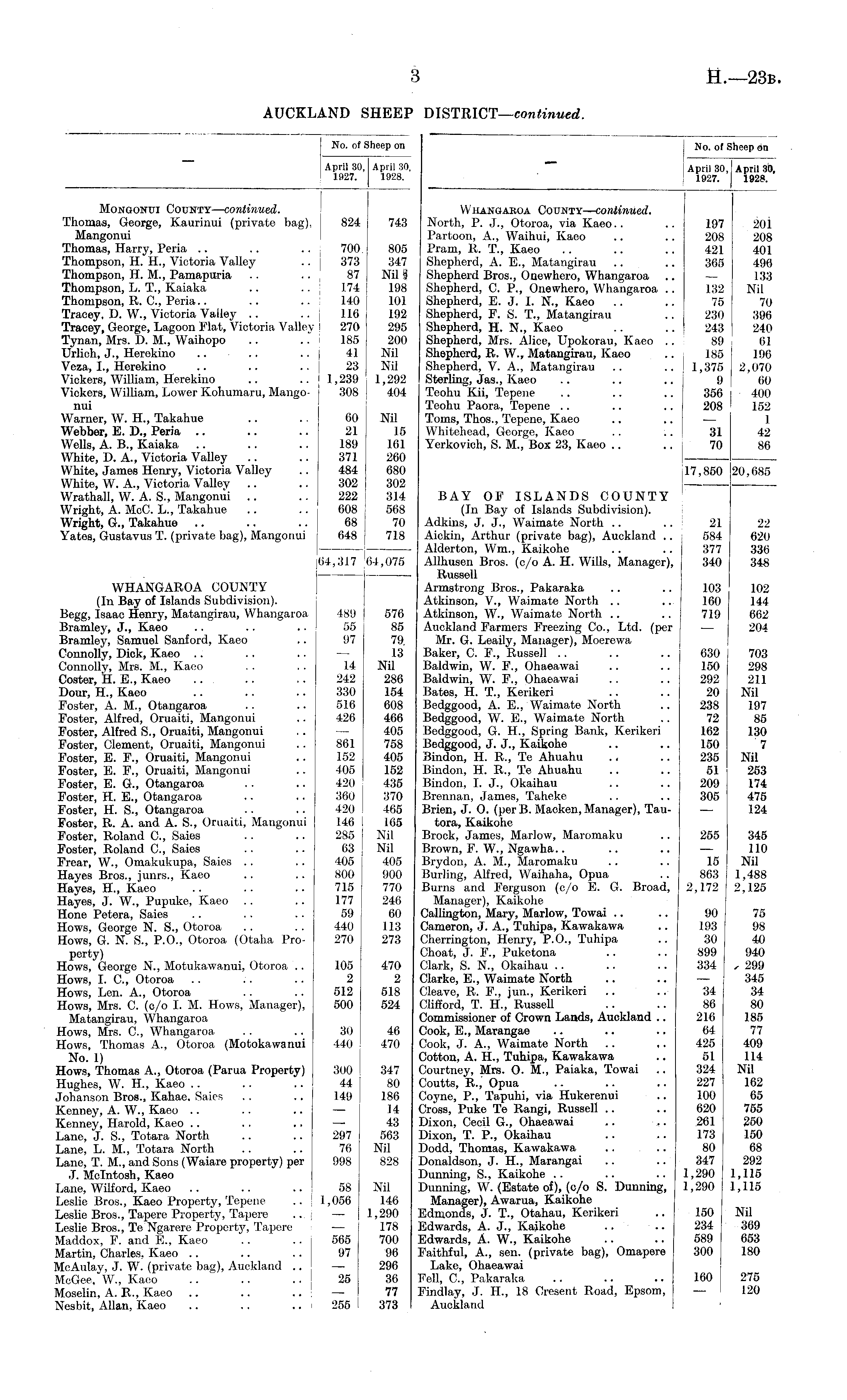 No. of Sheep on April 30, April 3ft, 1927. 1928. Whangaroa County—continued. North, P. J., Otoroa, via Kaeo.. .. 197 20i Partoon, A., Waihui, Kaeo .. .. 208 208 Pram, It. T., Kaeo .. .. .. 421 401 Shepherd, A. E., Matangirau .. .. 365 490 Shepherd Bros., Onewhero, Whangaroa .. — 133 Shepherd, C. P., Onewhero, Whangaroa .. 132 Nil Shepherd, E. J. I. N., Kaeo .. .. 75 70 Shepherd, F. S. T., Matangirau .. 230 396 Shepherd, H. N., Kaeo .. .. 243 240 Shepherd, Mrs. Alice, Upokorau, Kaeo .. 89 61 Shepherd, E. W., Matangirau, Kaeo .. 185 196 Shepherd, V. A., Matangirau .. .. 1,375 2,070 Sterling, Jas., Kaeo .. .. .. 9 60 Teohu Kii, Tepene .. .. .. 356 400 Teohu Paora, Tepene .. .. .. 208 152 Toms, Thos., Tepene, Kaeo .. .. — I Whitehead, George, Kaeo .. .. 31 42 Yerkovich, S. M., Box 23, Kaeo .. .. 70 86 17,850 20,685 BAY OF ISLANDS COUNTY (In Bay of Islands Subdivision). Adkins, J. J., Waimate North .. .. j 21 22 Aickin, Arthur (private bag), Auckland .. 584 620 Alderton, Wm., Kaikohe .. .. 377 336 Allhusen Bros, (e/o A. H. Wills, Manager), 340 348 Russell Armstrong Bros., Pakaraka .. .. 103 102 Atkinson, V., Waimate North .. ... 160 144 Atkinson, W., Waimate North .. .. 719 662 Auckland Farmers Freezing Co., Ltd. (per — 204 Mr. G. Leaily, Manager), Moerewa Baker, C. F., Russell .. .. .. 630 ! 703 Baldwin, W. F., Ohaeawai .. .. 150 298 Baldwin, W. F., Ohaeawai .. .. 292 211 Bates, H. T., Kerikeri .. .. 20 Nil Bedggood, A. E., Waimate North .. 238 197 Bedggood, W. E., Waimate North .. 72 85 Bedggood, G. H., Spring Bank, Kerikeri 162 130 Bedggood, J. J., Kaikohe .. .. 150 7 Bindon, H. R., Te Ahuahu ., .. 235 Nil Bindon, H. R., Te Ahuahu .. .. 51 253 Bindon, I. J., Okaihau .. .. 209 174 Brennan, James, Taheke .. .. 305 475 Brien, J. O. (perB. Macken, Manager), Tau- — 124 tora, Kaikohe Brock, James, Marlow, Maromaku .. 255 345 Brown, F. W., Ngawha.. .. .. — 110 Brydon, A. M., Maromaku .. .. 15 Nil Burling, Alfred, Waihaha, Opua .. 863 1,488 Burns and Ferguson (e/o E. G. Broad, 2,172 2,125 Manager), Kaikohe Callington, Mary, Marlow, Towai .. .. 90 75 Cameron, J. A., Tuhipa, Kawakawa .. 193 98 Cherrington, Henry, P.O., Tuhipa .. 30 40 Choat, J. F., Puketona .. .. 899 940 Clark, S. N., Okaihau .. .. .. 334 ✓ 299 Clarke, E., Waimate North .. .. — 345 Cleave, R. F., jun., Kerikeri .. .. 34 34 Clifford, T. H., Russell .. .. 86 80 Commissioner of Crown Lands, Auckland .. 216 185 Cook, E., Marangae .. .. .. 64 77 Cook, J. A., Waimate North .. 425 409 Cotton, A. H., Tuhipa, Kawakawa .. 51 114 Courtney, Mrs. O. M., Paiaka, Towai .. 324 Nil Coutts, R., Opua .. .. .. 227 162 Coyne, P., Tapuhi, via Hukerenui .. 100 65 Cross, Puke Te Rangi, Russell .. .. 620 755 Dixon, Cecil G., Ohaeawai .. .. 261 250 Dixon, T. P., Okaihau .. .. 173 150 Dodd, Thomas, Kawakawa .. .. 80 68 Donaldson, J. H., Marangai .. .. 347 292 Dunning, S., Kaikohe .. .. .. 1,290 1,115 Dunning, W. (Estate of), (e/o S. Dunning, 1,290 1,115 Manager), Awarua, Kaikohe Edmonds, J. T., Otahau, Kerikeri .. 150 Nil Edwards, A. J., Kaikohe .. .. 234 369 Edwards, A. W., Kaikohe .. .. 589 653 Faithful, A., sen. (private bag), Omapere 300 180 Lake, Ohaeawai Fell, C., Pakaraka .. .. .. 160 275 Findlay, J. H., 18 Cresent Road, Epsom, — 120 Auckland