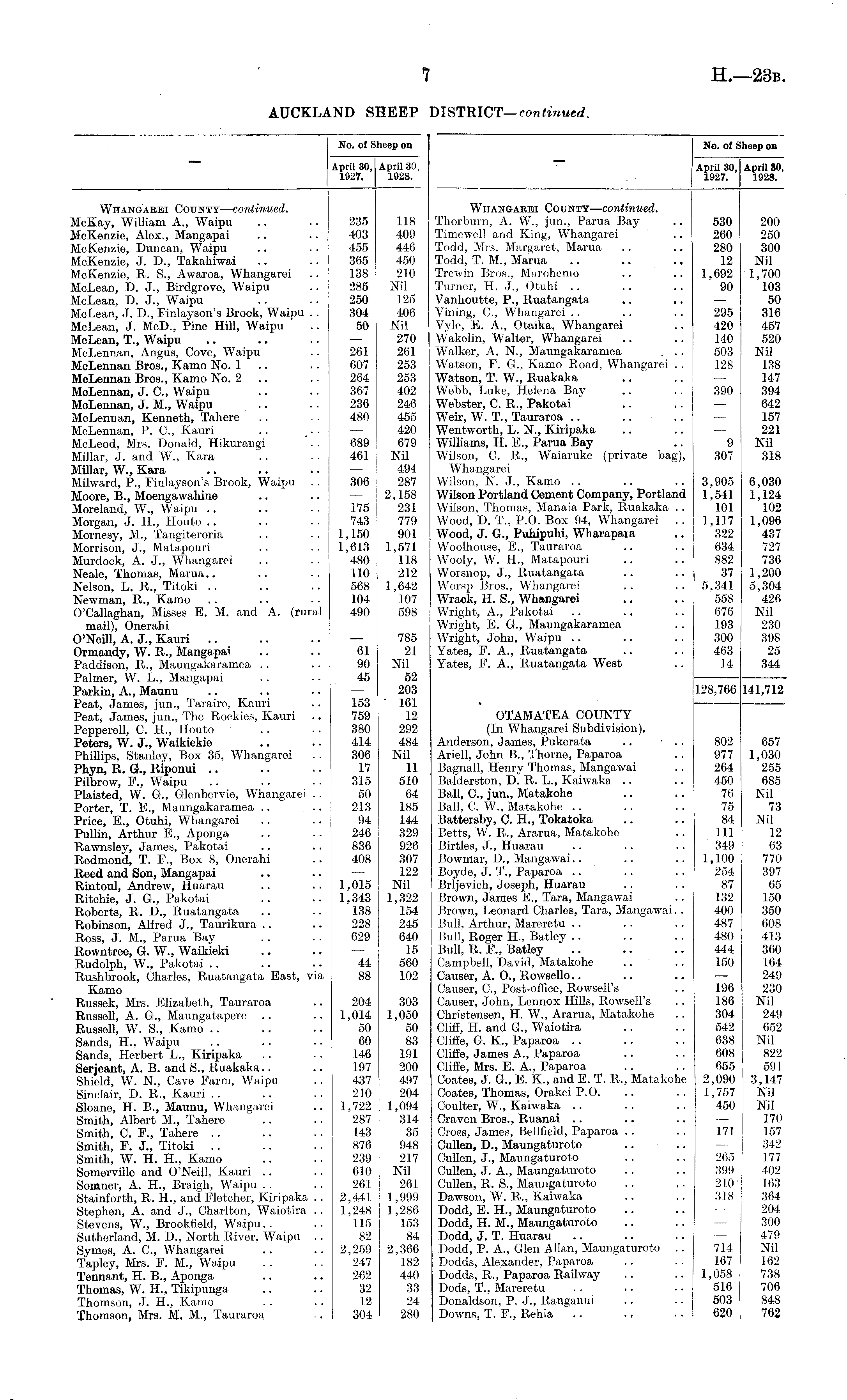 No. of Sheep on April 80, April SO, 1927. 1928. Whangarei County—continued. Thorburn, A. W., jun., Parua Bay .. 530 200 Timewel! and King, Whangarei .. 260 250 Todd, Mrs. Margaret, Mania .. .. 280 300 Todd, T. M., Marua .. .. .. 12 Nil Trewin Bros., Marohemo .. .. 1,692 1,700 Turner, H. J., Otuhi .. .. .. 90 103 Vanhoutte, P., Ruatangata .. .. — 50 Vining, C., Whangarei .. .. .. 295 316 Vyle, E. A., Otaika, Whangarei .. 420 457 Wakelin, Walter, Whangarei .. .. 140 520 Walker, A. N., Maungakaramea . .. 503 Nil Watson, P. G., Kamo Road, Whangarei .. 128 138 Watson, T. W., Ruakaka .. .. — 147 Webb, Luke, Helena Bay .. .. 390 394 Webster, C. R., Pakotai .. .. — 642 Weir, W. T., Tauraroa .. .. .. — 157 Wentworth, L. N., Kiripaka .. .. — 221 Williams, H. E., Parua Bay .. 9 Nil Wilson, C. R., Waiaruke (private bag), 307 318 Whangarei Wilson, N. J., Kamo .. .. .. 3,905 6,030 Wilson Portland Cement Company, Portland 1,541 1,124 Wilson, Thomas, Manaia Park, Ruakaka .. 101 102 Wood, D. T., P.O. Box 94, Whangarei .. 1,117 1,096 Wood, J. G., Puhipuhi, Wharapava .. 322 437 Woolhouse, E., Tauraroa .. .. 634 727 Wooly, W. H., Matapouri .. .. 882 736 Worsnop, J., Ruatangata .. .. 37 1,200 Worsp Bros., Whangarei .. .. 5,341 5,304 Wraek, H. S., Whangarei .. .. 558 426 Wright, A., Pakotai .. .. .. 676 Nil Wright, E. G., Maungakaramea .. 193 230 Wright, John, Waipu .. .. .. 300 398 Yates, E. A., Ruatangata .. .. 463 25 Yates, F. A., Ruatangata West .. 14 344 128,766 141,712 OTAMATEA COUNTY (In Whangarei Subdivision). Anderson, James, Pukerata .. .. 802 657 Ariell, John B., Thorne, Paparoa .. 977 1,030 Bagnall, Henry Thomas, Mangawai .. 264 255 Balderston, D. R. L., Kaiwaka .. .. 450 685 Ball, C., jun., Matakohe .. .. 76 Nil Ball, C. W„ Matakohe .. .. .. 75 73 Battersby, C. H., Tokatoka .. .. 84 Nil Betts, W. R., Ararua, Matakohe .. Ill 12 Birtles, J., Huarau .. .. .. 349 63 Bowmar, D., Mangawai.. .. .. 1,100 770 Boyde, J. T., Paparoa .. .. .. 254 397 Brljevich, Joseph, Huarau .. .. 87 65 Brown, James E., Tara, Mangawai .. 132 150 Brown, Leonard Charles, Tara, Mangawai.. 400 350 Bull, Arthur, Mareretu .. .. .. 487 608 Bull, Roger H., Batley .. .. .. 480 413 Bull, R. E„ Batley ' .. .. .. 444 360 Campbell, David, Matakohe .. .. 150 164 Causer, A. O., Rowsello.. .. .. — 249 Causer, C., Post-office, Rowsell's .. 196 230 Causer, John, Lennox Hills, Rowsell's .. 186 Nil Christensen, H. W., Ararua, Matakohe .. 304 249 Cliff, H. and G., Waiotira .. .. 542 652 Cliffe, G. K„ Paparoa .. .. .. 638 Nil Cliffe, James A., Paparoa .. .. 608 822 Cliffe, Mrs. E. A., Paparoa .. .. 655 591 Coates, J. G., E. K., and E. T. R., Matakohe 2,090 3,147 Coates, Thomas, Orakei P.O. .. .. 1,757 Nil Coulter, W., Kaiwaka .. .. .. 450 Nil Craven Bros., Ruanai .. .. .. — 170 Cross, James, Bellfield, Paparoa .. .. 171 157 Cullen, D., Maungaturoto .. .. — 342 Cullen, J., Maungaturoto .. .. 265 177 Cullen, J. A., Maungaturoto .. .. 399 402 Cullen, R. S., Maungaturoto .. 210 ': 163 Dawson, W. R., Kaiwaka .. .. 318 364 Dodd, E. H., Maungaturoto .. .. — 204 Dodd, H. M., Maungaturoto .. .. — 300 Dodd, J. T. Huarau .. .. .. — 479 Dodd, P. A., Glen Allan, Maungaturoto .. 714 Nil Dodds, Alexander, Paparoa .. .. 167 162 Dodds, R., Paparoa Railway .. .. 1,058 738 Dods, T., Mareretu .. .. .. 516 706 Donaldson, P. J., Ranganui .. .. 503 848 Downs, T. F., Rehia ., ,, • • 620 762