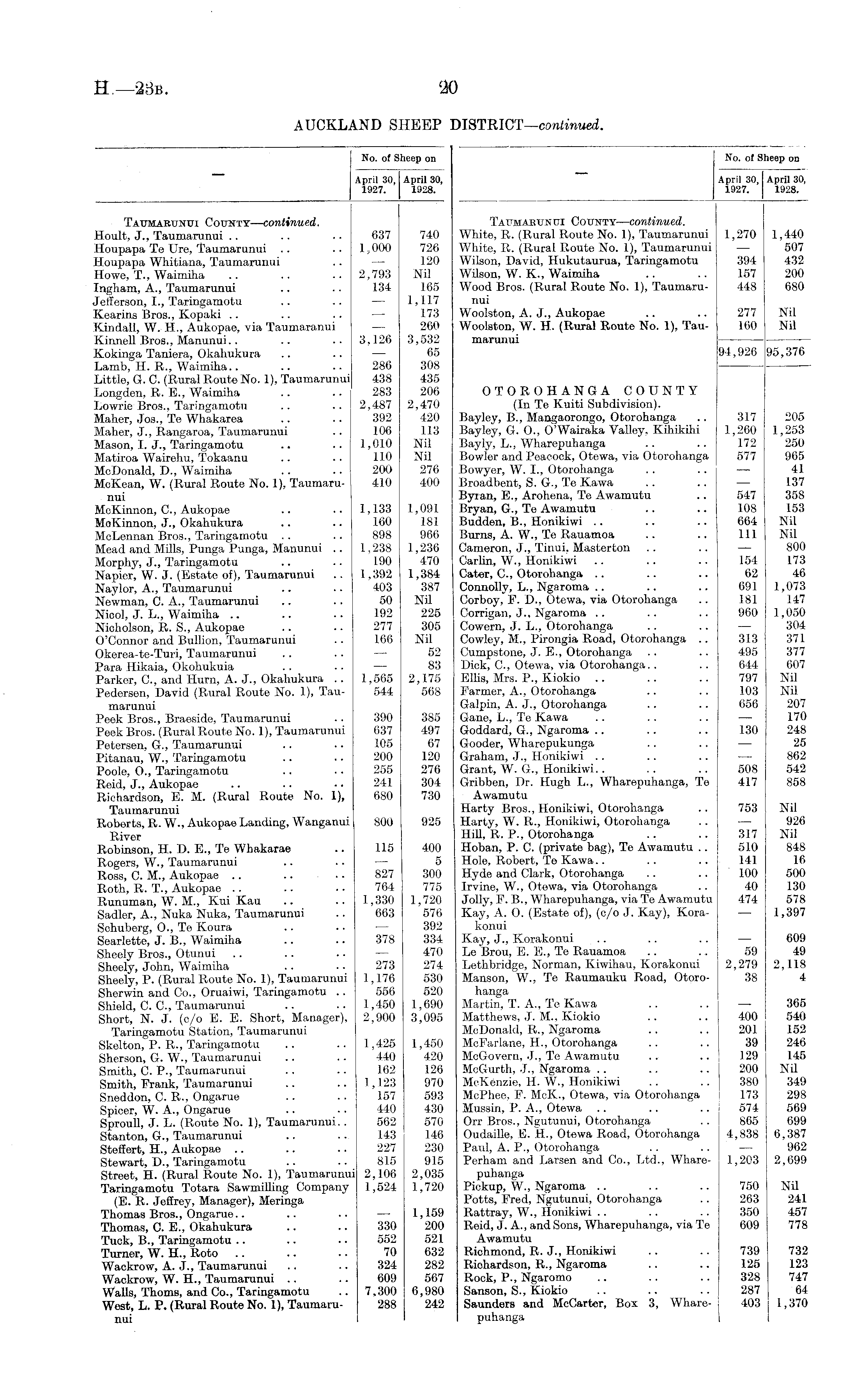 No. of Sheep on April 30, April 30, 1927. 1928. Taitmahuntji County—continued. White, R. (Rural Route No. 1), Taumarumii 1,270 1,440 White, R. (Rural Route No. 1), Taumarunui — 507 Wilson, David, Hukutaurua, Taringamotu 394 432 Wilson, W. K., Waimiha .. .. 157 200 Wood Bros. (Rural Route No. 1), Taumaru- 448 680 nui Woolston, A. J., Aukopae .. .. 277 Nil Woolston, W. H. (Rural Route No. 1), Tau- 160 Nil marunui 94,926 95,376 OTOROHANGA COUNTY (In Te Kuiti Subdivision). Bayley, B., Mangaorongo, Otorohanga .. 317 205 Bayley, G. O., O'Wairaka Valley, Kihikihi 1,260 1,253 Bayly, L., Wharepuhanga .. .. 172 250 Bowler and Peacock, Otewa, via Otorohanga 577 965 Bowyer, W. I., Otorohanga .. .. — 41 Broadbent, S. G., Te Kawa .. .. — 137 Byran, E., Arohena, Te Awamutu .. 547 358 Bryan, G., Te Awamutu .. .. 108 153 Budden, B., Honikiwi .. .. .. 664 Nil Burns, A. W., Te Rauamoa .. .. Ill Nil Cameron, J., Tinui, Masterton .. .. — 800 Carlin, W., Honikiwi .. .. .. 154 173 Cater, C., Otorohanga .. .. .. 62 46 Connolly, L., Ngaroma .. .. .. 691 1,073 Corboy, F. D., Otewa, via Otorohanga .. 181 147 Corrigan, J., Ngaroma .. .. .. 960 1,050 Cowern, J. L., Otorohanga .. .. — 304 Cowley, M., Pirongia Road, Otorohanga .. 313 371 Cumpstone, J. E., Otorohanga .. .. 495 377 Dick, C., Otewa, via Otorohanga.. .. 644 607 Ellis, Mrs. P., Kiokio .. .. .. 797 Nil Farmer, A., Otorohanga .. .. 103 Nil Galpin, A. J., Otorohanga .. .. 656 207 Gane, L., Te Kawa .. .. .. — 170 Goddard, G., Ngaroma .. .. .. 130 248 Gooder, Wharepukunga .. .. — 25 Graham, J., Honikiwi .. .. .. — 862 Grant, W. G., Honikiwi.. .. .. 508 542 Gribben, Dr. Hugh L., Wharepuhanga, Te 417 858 Awamutu Harty Bros., Honikiwi, Otorohanga .. 753 Nil Harty, W. R., Honikiwi, Otorohanga .. —• 926 Hill, R. P., Otorohanga .. .. 317 Nil Hoban, P. C. (private bag), Te Awamutu .. 510 848 Hole, Robert, Te Kawa.. .. .. 141 16 Hyde and Clark, Otorohanga .. .. 100 500 Irvine, W., Otewa, via Otorohanga .. 40 130 J oily, F. B., Wharepuhanga, via Te Awamutu 474 578 Kay, A. 0. (Estate of), (c/o J. Kay), Kora- — 1,397 konui Kay, J., Korakotiui .. .. .. — 609 Le Brou, E. E., Te Rauamoa .. .. 59 49 Lethbridge, Norman, Kiwihau, Korakonui 2,279 2,118 Manson, W., Te Raumauku Road, Otoro- 38 4 hanga Martin, T. A., Te Kawa .. .. —- 365 Matthews, J. M., Kiokio .. .. 400 540 McDonald, R., Ngaroma .. .. 201 152 McFarlane, H., Otorohanga .. .. 39 246 McGovern, J., Te Awamutu .. .. 129 145 McGurth, J., Ngaroma .. .. .. I 200 Nil McKenzie, H. W., Honikiwi .. .. 380 349 McPhee, F. McK., Otewa, via Otorohanga 173 298 Mussin, P. A., Otewa .. .. .. 574 569 Orr Bros., Ngutunui, Otorohanga .. i 865 699 Oudaille, E. H., Otewa Road, Otorohanga 4,838 6,387 Paul, A. P., Otorohanga . . .. — 962 Perham and Larsen and Co., Ltd., Whare- 1,203 2,699 puhanga Pickup, W., Ngaroma .. .. .. 750 Nil Potts, Fred, Ngutunui, Otorohanga .. 263 241 Rattray, W., Honikiwi .. .. .. 350 457 Reid, J. A., and Sons, Wharepuhanga, via Te 609 778 Awamutu Richmond, R. J., Honikiwi .. .. 739 732 Riohardson, R., Ngaroma .. .. 125 123 Rock, P., Ngaromo .. .. .. 328 747 Sanson, S., Kiokio .. .. .. 287 64 Saunders and McCarter, Box 3, Whare- | 403 1,370 puhanga I