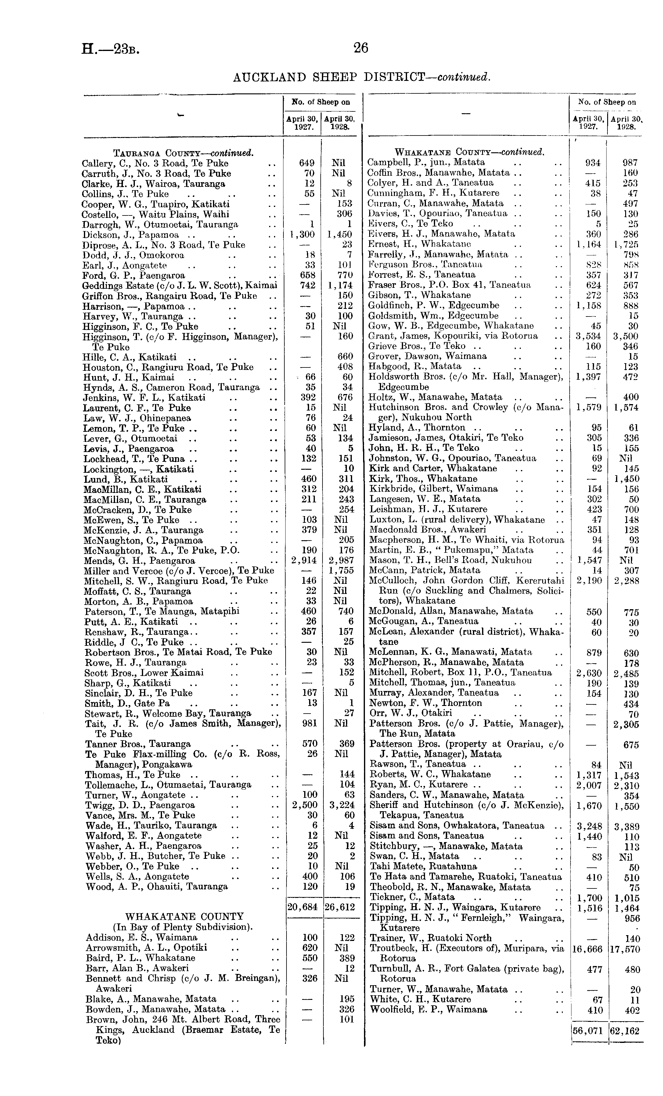No. of Sheep on April 30, April 30, ! 1927. 1928. Tauranga County—continued. Callery, C., No. 3 Road, Te Puke .. 649 Nil Carruth, J., No. 3 Road, Te Puke .. 70 Nil Clarke, H. J., Wairoa, Tauranga .. 12 8 Collins, J., Te Puke .. .. .. 55 Nil Cooper, W. G., Tuapiro, Katikati .. — 153 Costello, —, Waitu Plains, Waihi .. — 306 Darrogh, W., Otumoetai, Tauranga .. 1 1 Dickson, J., Papamoa .. .. .. 1,300 1,450 Diprose, A. L., No. 3 Road, Te Puke .. — 23 Dodd, J. J., Oraokoroa .. .. 18 7 Earl, J., Aongatete .. .. .. 33 101 Ford, G. P., Paengaroa .. .. 658 770 Geddings Estate (e/o J. L. W. Scott), Kaimai 742 1,174 Griffon Bros., Rangairu Road, Te Puke .. — 150 Harrison, —, Papamoa .. .. .. — 212 Harvey, W., Tauranga .. .. .. 30 100 Higginson, F. C., Te Puke .. .. 51 Nil Higginson, T. (e/o F. Higginson, Manager), — 160 Te Puke Hille, C. A., Katikati .. .. .. — 660 Houston, C., Rangiuru Road, Te Puke .. —• 408 Hunt, J. H., Kaimai .. .. .. • 66 60 Hynds, A. S., Cameron Road, Tauranga .. 35 34 Jenkins, W. F. L., Katikati .. .. 392 676 Laurent, C. F., Te Puke .. .. 15 Nil Law, W. J., Ohinepanea .. .. 76 24 Lemon, T. P., Te Puke .. .. .. 60 Nil Lever, G., Otumoetai .. .. .. 53 134 Levis, J., Paengaroa .. .. .. 40 5 Lockhead, T., Te Puna .. .. .. 132 151 Lockington, —, Katikati .. .. — 10 Lund, B., Katikati .. .. .. 460 311 MacMillan, C. E., Katikati .. .. 312 204 MacMillan, C. E., Tauranga .. .. 211 243 McCracken, D., Te Puke .. .. — 254 McEwen, S., Te Puke .. .. .. 103 Nil McKenzie, J. A., Tauranga .. .. 379 Nil McNaughton, C., Papamoa .. .. — 205 McNaughton, R. A., Te Puke, P.O. .. 190 176 Mends, G. H., Paengaroa .. .. 2,914 2,987 Miller and Vercoe (c/o J. Vercoe), Te Puke — 1,755 Mitchell, S. W., Rangiuru Road, Te Puke 146 Nil Moffatt, C. S., Tauranga .. .. 22 Nil Morton, A. B., Papamoa .. .. 33 Nil Paterson, T., Te Maunga, Matapihi .. 460 740 Putt, A. E., Katikati .. .. .. 26 6 Renshaw, R., Tauranga.. .. .. 357 157 Riddle, J C., Te Puke .. .. .. — 25 Robertson Bros., Te Matai Road, Te Puke 30 Nil Rowe, H. J., Tauranga .. .. 23 33 Scott Bros., Lower Kaimai .. .. — 152 Sharp, G., Katikati .. .. .. — 5 Sinclair, D. H., Te Puke .. .. 167 Nil Smith, I)., Gate Pa .. .. 13 1 Stewart, R., Welcome Bay, Tauranga .. — 27 Tait, J. R. (c/o James Smith, Manager), 981 Nil Te Puke Tanner Bros., Tauranga .. .. 570 369 Te Puke Flax-milling Co. (c/o R. Ross, 26 Nil Manager), Pongakawa Thomas, H., Te Puke .. .. .. — 144 Tollemache, L., Otumaetai, Tauranga .. — 104 Turner, W., Aongatete .. .. .. 100 63 Twigg, D. T>., Paengaroa .. .. 2,500 3,224 Vance, Mrs. M., Te Puke .. .. 30 60 Wade, H, Tauriko, Tauranga .. .. 6 4 Walford, E. F., Aongatete .. .. 12 Nil Washer, A. H., Paengaroa .. .. 25 12 Webb, J. H., Butcher, Te Puke .. .. 20 2 Webber, O., Te Puke .. .. .. 10 Nil Wells, S. A., Aongatete .. .. 400 106 Wood, A. P., Ohauiti, Tauranga .. 120 19 20,684 26,612 WHAKATANE COUNTY (In Bay of Plenty Subdivision). Addison, E. S., Waimana .. .. 100 122 Arrowsmith, A. L., Opotiki .. .. 620 Nil Baird, P. L., Whakatane .. .. 550 389 Barr, Alan B., Awakeri .. .. — 12 Bennett and Chrisp (c/o J. M. Breingan), 326 Nil Awakeri Blake, A., Manawahe, Matata .. .. — 195 Bowden, J., Manawahe, Matata .. .. — 326 Brown, John, 246 Mt. Albert Road, Three — 101 Kings, Auckland (Braemar Estate, Te Teko)