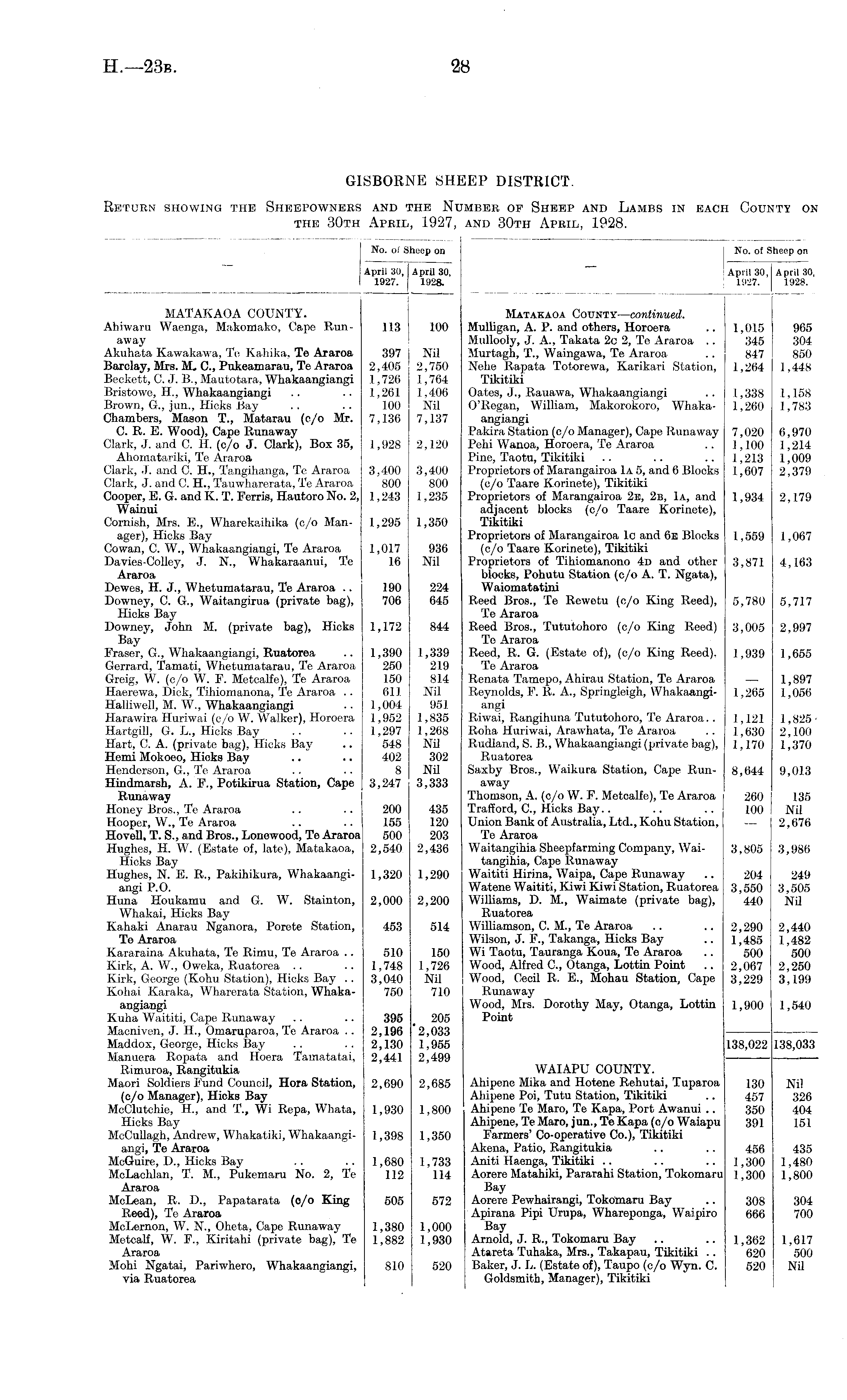 GISBORNE SHEEP DISTRICT. Return showing the Sheepowners and the Number of Sheep and Lambs in each County on the 30th April, 1927, and 30th April, 1928.
