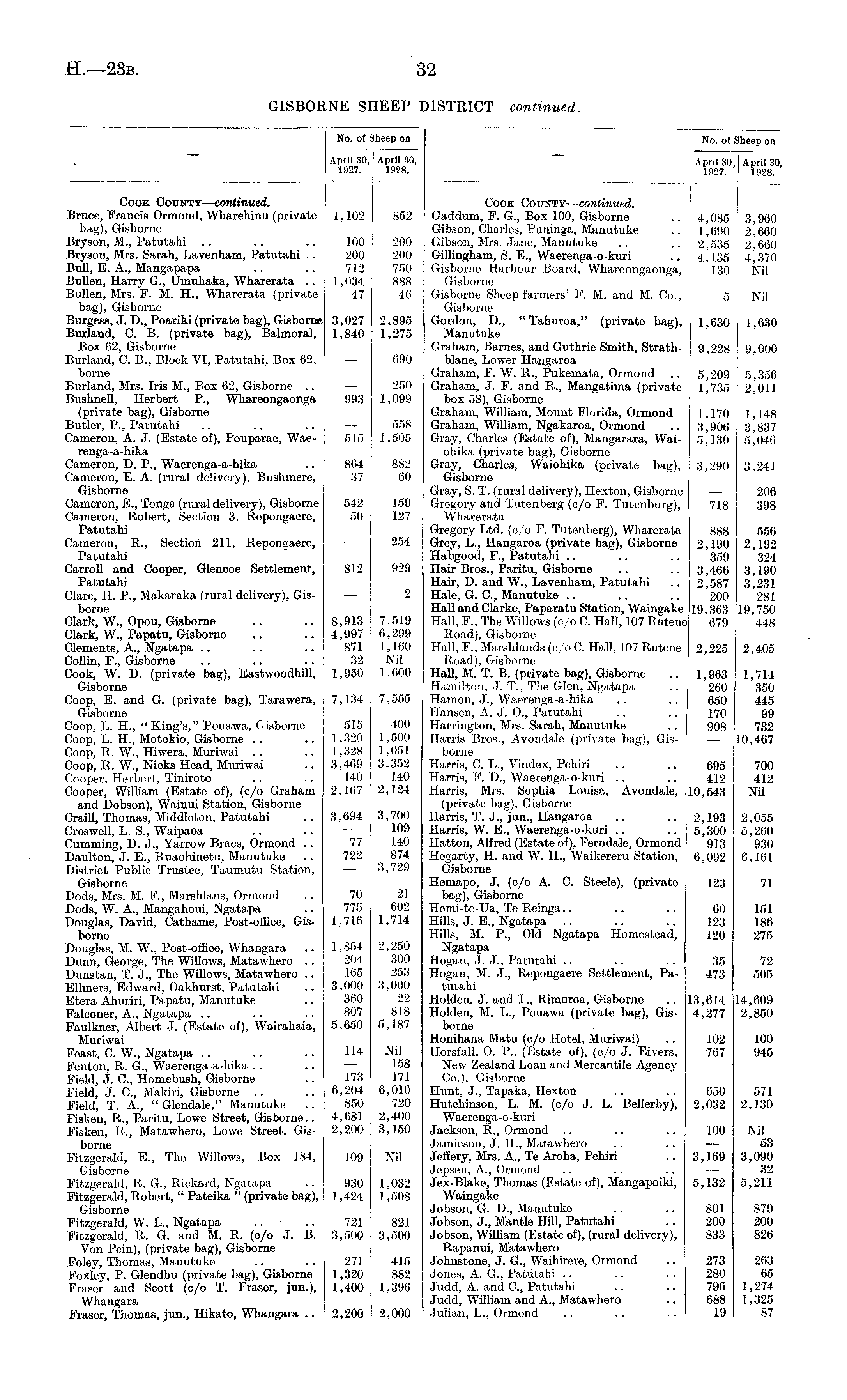 I No. of Sheep on April 30, April 30, 1927. 1928. Cook County—continued. Gaddum, F. G., Box 100, Gisborne .. 4,085 3,960 Gibson, Charles, Puninga, Manutuke .. 1,690 2,660 Gibson, Mrs. Jane, Manutuke .. .. 2,535 2,660 Gillingham, S. E., Waerenga-o-kuri .. 4,135 4,370 Gisborne Harbour Board, Whareongaonga, 130 Nil Gisborne Gisborne Sheep-farmers' F. M. and M. Co., 5 Nil Gisborne Gordon, D., " Tahuroa," (private bag), 1,630 1,630 Manutuke Graham, Barnes, and Guthrie Smith, Strath- 9,228 9,000 blane, Lower Hangaroa Graham, F. W. R., Pukemata, Ormond .. 5,209 5,356 Graham, J. F. and R., Mangatima (private 1,735 2,011 box 58), Gisborne Graham, William, Mount Florida, Ormond 1,170 1,148 Graham, William, Ngakaroa, Ormond .. 3,906 3,837 Gray, Charles (Estate of), Mangarara, Wai- 5,130 5,046 ohika (private bag), Gisborne Gray, Charles, Waiohika (private bag), 3,290 3,241 Gisborne Gray, S. T. (rural delivery), Hexton, Gisborne — 206 Gregory and Tutenberg (c/o F. Tutenburg), 718 398 Wharerata Gregory Ltd. (e/o F. Tutenberg), Wharerata 888 556 Grey, L., Hangaroa (private bag), Gisborne 2,190 2,192 Habgood, F., Patutahi .. .. .. 359 324 Hair Bros., Paritu, Gisborne .. .. 3,466 3,190 Hair, 1). and W., Lavenham, Patutahi .. 2,587 3,231 Hale, G. C., Manutuke .. .. .. 200 281 Hall and Clarke, Paparatu Station, Waingake 19,363 19,750 Hall, F., The Willows (c/o C. Hall, 107 Rutene 679 448 Road), Gisborne Hall, F., Marshlands (c/o C. Hall, 107 Rutene 2,225 2,405 Road), Gisborne Hall, M. T. B. (private bag), Gisborne .. 1,963 1,714 Hamilton, J. T., The Glen, Ngatapa .. 260 350 Hamon, J., Waerenga-a-hika .. .. 650 445 Hansen, A. J. O., Patutahi .. .. 170 99 Harrington, Mrs. Sarah, Manutuke .. 908 732 Harris Bros., Avondale (private bag), Gis- — 10,467 borne Harris, C. L., Vindex, Pehiri .. .. 695 700 Harris, F. D., Waerenga-o-kuri .. .. 412 412 Harris, Mrs. Sophia Louisa, Avondale, 10,543 Nil (private bag), Gisborne Harris, T. J., jun., Hangaroa .. .. 2,193 2,055 Harris, W. E., Waerenga-o-kuri .. .. 5,300 5,260 Hatton, Alfred (Estate of), Ferndale, Ormond 913 930 Hegarty, H. and W. H., Waikereru Station, 6,092 6,161 Gisborne Hemapo, J. (c/o A. C. Steele), (private 123 71 bag), Gisborne Hemi-te-Ua, Te Reinga.. .. .. 60 151 Hills, J. E., Ngatapa .. .. .. 123 186 Hills, M. P., Old Ngatapa Homestead, 120 275 Ngatapa Hogan, J. J., Patutahi .. .. .. 35 72 Hogan, M. J., Repongaere Settlement, Pa- 473 505 tutahi Holden, J. and T., Rimuroa, Gisborne .. 13,614 14,609 Holden, M. L., Pouawa (private bag), Gis- 4,277 2,850 borne Honihana Matu (c/o Hotel, Muriwai) .. 102 100 Horsfall, O. P., (Estate of), (c/o J. Eivers, 767 945 New Zealand Loan and Mercantile Agency Co.), Gisborne Hunt, J., Tapaka, Hexton .. .. 650 571 Hutchinson, L. M. (c/o J. L. Bellerby), 2,032 2,130 Waerenga-o-kuri Jackson, R., Ormond .. .. .. 100 Nil Jamieson, J. H., Matawhero .. .. — 53 Jeffery, Mrs. A., Te Aroha, Pehiri . . 3,169 3,090 Jepsen, A., Ormond .. .. .. — 32 Jex-Blake, Thomas (Estate of), Mangapoiki, 5,132 5,211 Waingake Jobson, G. D., Manutuke .. .. 801 879 Jobson, J., Mantle Hill, Patutahi .. 200 200 Jobson, William (Estate of), (rural delivery), 833 826 Rapanui, Matawhero Johnstone, J. G., Waihirere, Ormond .. 273 263 Jones, A. G., Patutahi .. .. .. 280 65 Judd, A. and C., Patutahi .. .. 795 1,274 Judd, William and A., Matawhero .. 688 1,325 Julian, L., Ormond .. .. .. 19 87