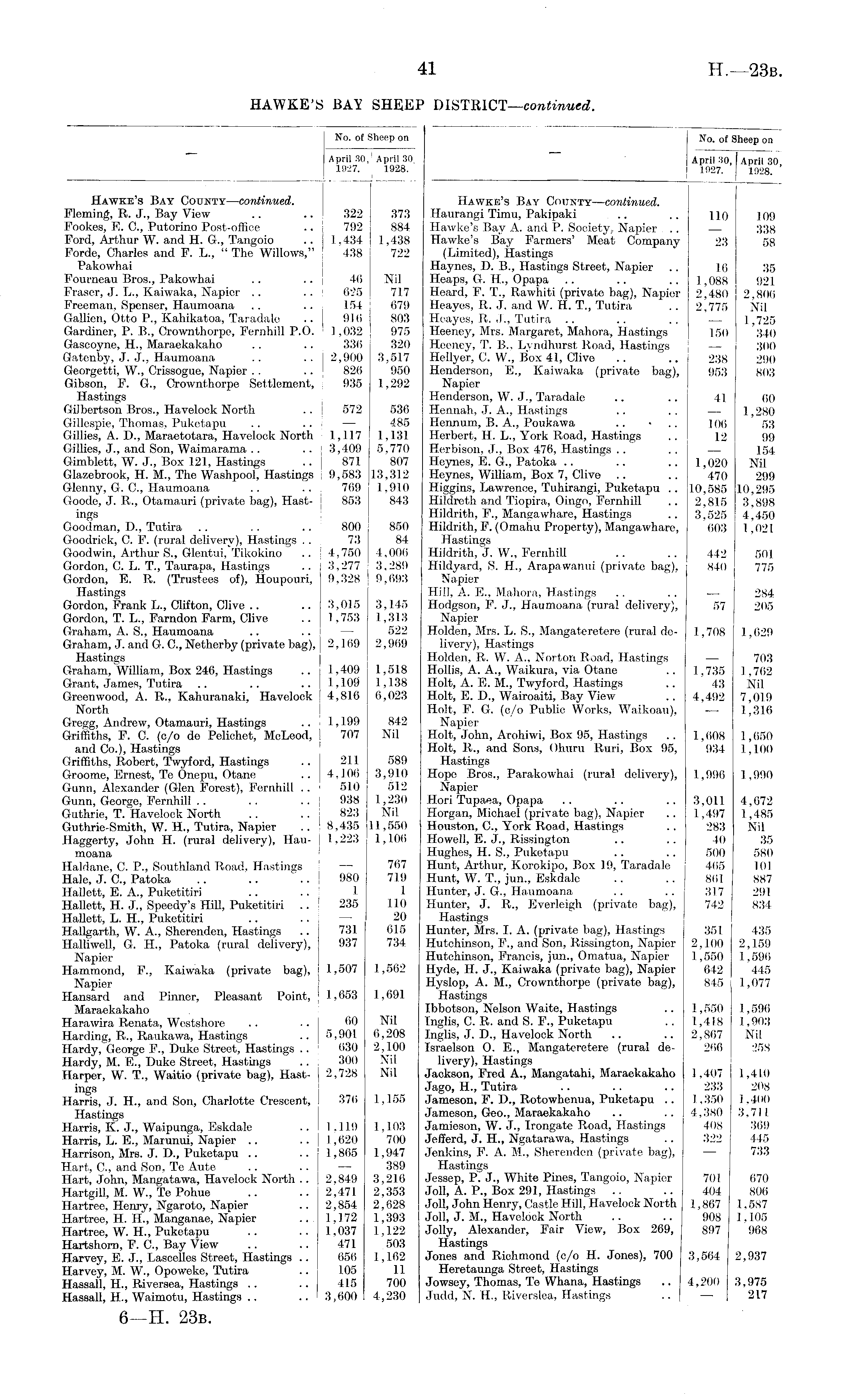 No. of Sheep on April 30, April 30 1927. | 1928. Hawke's Bay County—continued. Fleming, R. J., Bay View .. .. 322 373 Fookes, E. C., Putorino Post-office .. 792 884 Ford, Arthur W. and H. G., Tangoio .. 1,434 1,438 Forde, Charles and F. L., " The Willows," 438 722 Pakowhai Fourneau Bros., Pakowhai .. .. 46 Nil Fraser, J. L., Kaiwaka, Napier .. .. 625 717 Freeman, Spenser, Haumoana .. .. J 154 679 Gallien, Otto P., Kahikatoa, Taradale .. | 916 803 Gardiner, P. B., Crownthorpe, Fernhill P.O. 1,032 975 Gascoyne, H., Maraekakaho .. .. j 336 320 Gatenby, J. J., Haumoana .. .. j 2,900 3,517 Georgetti, W., Crissogue, Napier .. .. j 826 950 Gibson, F. G., Crownthorpe Settlement, j 935 1,292 Hastings Gilbertson Bros., Haveloek North .. j 572 536 Gillespie, Thomas, Puketapu .. .. I — 485 Gillies, A. D., Maraetotara, Haveloek North ; 1,117 1,131 Gillies, J., and Son, Waimarama .. .. | 3,409 5,770 Gimblett, W. J., Box 121, Hastings .. j 871 807 Glazebrook, H. M., The Washpool, Hastings | 9,583 13,312 Glenny, G. C., Haumoana .. .. j 769 1,910 Goode, J. R., Otamauri (private bag), Hast- | 853 843 ings Goodman, D., Tutira .. .. .. 800 850 Goodrick, C. F. (rural delivery), Hastings .. j 73 84 Goodwin, Arthur S., Glentui, Tikokino .. j 4,750 4,006 Gordon, C. L. T., Taurapa, Hastings .. 3,277 3,289 Gordon, E. R. (Trustees of), Houpouri, 9,328 9,693 Hastings Gordon, Frank L., Clifton, Clive .. .. 3,015 3,145 Gordon, T. L., Farndon Farm, Clive .. 1,753 1,313 Graham, A. S., Haumoana .. .. — 522 Graham, J. and G. C., Netherby (private bag), 2,169 2,969 Hastings Graham, William, Box 246, Hastings .. 1,409 1,518 Grant, James, Tutira .. .. .. 1,109 1,138 Greenwood, A. R., Kahuranaki, Haveloek 4,816 6,023 North Gregg, Andrew, Otamauri, Hastings .. ■ 1,199 842 Griffiths, F. C. (e/o de Peliohet, MeLeod, ! 707 Nil and Co.), Hastings Griffiths, Robert, Twyford, Hastings .. 211 589 Groome, Ernest, Te Onepu, Otane .. 4,106 3,910 Gunn, Alexander (Glen Forest), Fernhill .. 510 512 Gunn, George, Fernhill .. .. .. 938 1,230 Guthrie, T. Haveloek North .. .. 823 Nil Guthrie-Smith, W. H., Tutira, Napier .. 8,435 jl 1,550 Haggerty, John H. (rural delivery), Hau- 1,223 1,106 moana Haldane, C. P., Southland Road, Hastings — 767 Hale, J. C., Patoka .. .. .. 980 719 Hallett, E. A., Puketitiri .. .. 1 1 Hallett, H. J., Speedy's Hill, Puketitiri .. 235 110 Hallett, L. H., Puketitiri .. .. — 20 Hallgarth, W. A., Sherenden, Hastings .. 731 615 Halliwell, G. H., Patoka (rural delivery), 937 734 Napier Hammond, F., Kaiwaka (private bag), 1,507 1,562 Napier Hansard and Pinner, Pleasant Point, 1,653 1,691 Maraekakaho Harawira Renata, Westshore .. .. 60 Nil Harding, R., Raukawa, Hastings .. 5,901 6,208 Hardy, George F., Duke Street, Hastings .. 630 2,100 Hardy, M. E., Duke Street, Hastings .. 300 Nil Harper, W. T., Waitio (private bag), Hast- 2,728 Nil ings Harris, J. H., and Son, Charlotte Crescent, 376 1,155 Hastings Harris, K. J., Waipunga, Eskdale .. 1,119 1,103 Harris, L. E., Marunui, Napier .. .. 1,620 700 Harrison, Mrs. J. D., Puketapu .. .. 1,865 1,947 Hart, C., and Son, Te Aute .. .. — 389 Hart, John, Mangatawa, Haveloek North .. 2.849 3,216 Hartgill, M. W., Te Pohue .. .. 2,47i 2,353 Hartree, Henry, Ngaroto, Napier .. 2,854 2,628 Hartree, H. H., Manganae, Napier .. 1,172 1,393 Hartree, W. H., Puketapu .. .. 1,037 1,122 Hartshorn, F. C., Bay View .. .. 471 503 Harvey, E. J., Laseelles Street, Hastings .. 656 1,162 Harvey, M. W., Opoweke, Tutira .. 105 11 Hassall, H., Riversea, Hastings .. .. 415 700 Hassall, H., Waimotu, Hastings .. .. 3,600 4,230