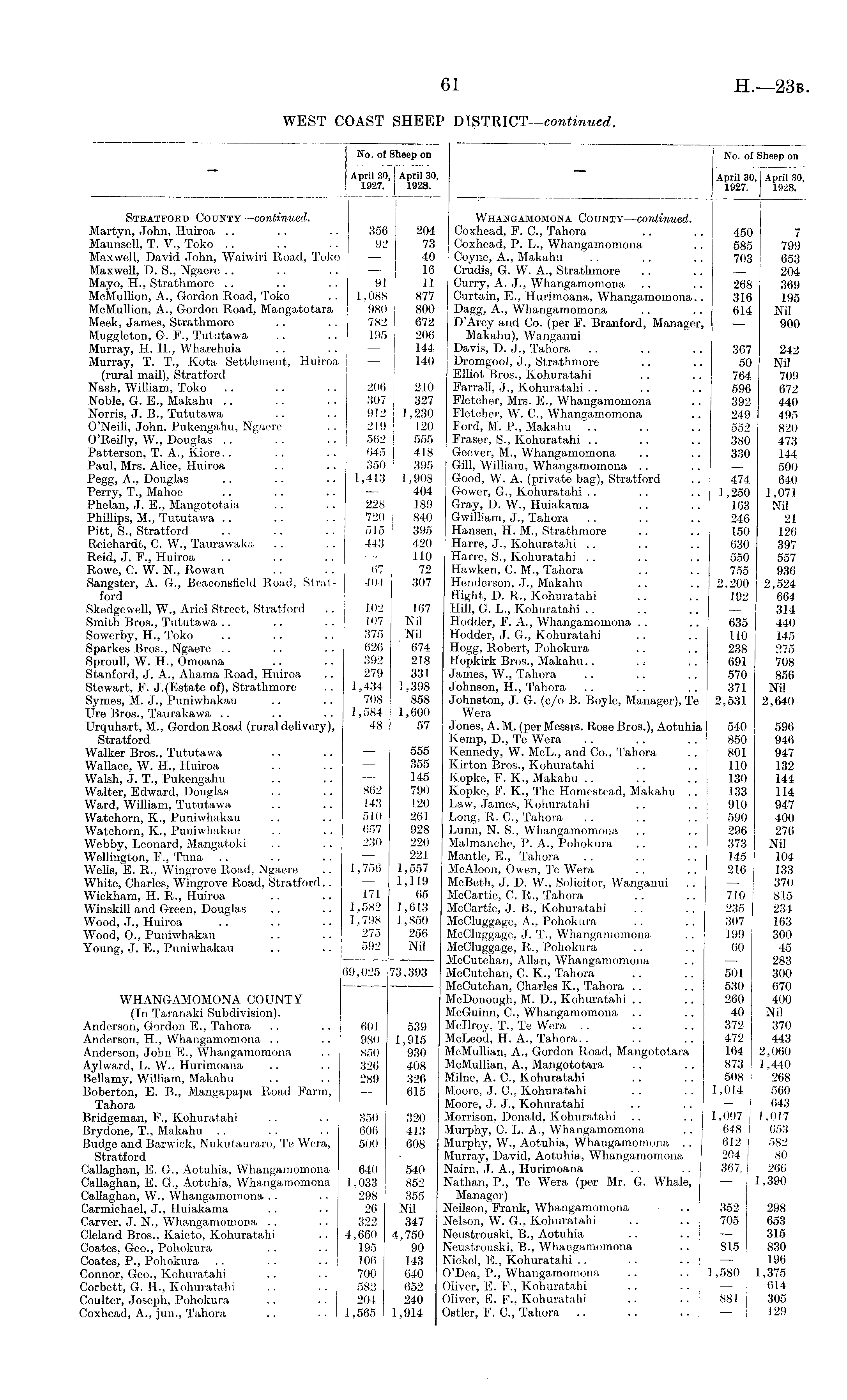No. of Sheep od April 30, April 30, 1927. 1928. Stratford County—continued. Martyn, John, Huiroa .. . . .. 356 204 Maunsell, T. V., Toko .. .. .. 92 73 Maxwell, David John, Waiwiri Road, Toko — 40 Maxwell, D. S., Ngaere .. .. .. — 16 Mayo, H., Strathmore .. .. .. 91 11 MeMullion, A., Gordon Road, Toko .. 1,088 877 McMullion, A., Gordon Road, Mangatotara 980 800 Meek, James, Strathmore .. .. 782 672 Muggleton, G. F., Tututawa .. .. 195 206 Murray, H. H., Wharehuia .. .. — 144 Murray, T. T., Kota Settlement, Huiroa — 140 (rural mail), Stratford Nash, William, Toko .. .. .. 206 210 Noble, G. E., Makahu .. .. .. 307 327 Norris, J. B., Tututawa .. .. 912 1,230 O'Neill, John, Pukengahu, Ngaere . . 219 120 O'Reilly, W., Douglas .. . . .. 562 ' 555 Patterson, T. A., Kiore.. .. .. 645 418 Paul, Mrs. Alice, Huiroa .. .. 350 395 Pegg, A., Douglas .. .. .. 1,413 1,908 Perry, T., Mahoe .. .. .. -— 404 Phelan, J. E., Mangototaia .. .. 228 189 Phillips, M., Tututawa .. .. .. 720 840 Pitt, S., Stratford .. .. .. J 515 395 Reichardt, C. W., Taurawaka .. .. 443 420 Reid, J. F., Huiroa .. .. .. — 110 Rowe, C. W. N., Rowan .. .. 67 72 Sangster, A. G., Beaconsfield Road, Strat- 404 307 ford Skedgewell, W., Ariel Street, Stratford .. 102 167 Smith Bros., Tututawa .. .. .. 107 Nil Sowerby, H., Toko .. .. .. 375 Nil Sparkes Bros., Ngaere .. .. .. 626 674 Sproull, W. H., Omoana .. .. 392 218 Stanford, J. A., Ahama Road, Huiroa .. 279 331 Stewart, F. J.(Estate of), Strathmore .. 1,434 1,398 Symes, M. J., Puniwhakau .. .. 708 858 Ure Bros., Taurakawa .. .. .. 1,584 1,600 Urquhart, M., Gordon Road (rural delivery), 48 57 Stratford Walker Bros., Tututawa .. .. — 555 Wallace, W. H., Huiroa . . .. —• 355 Walsh, J. T., Pukengahu .. .. — 145 Walter, Edward, Douglas .. .. 862 790 Ward, William, Tututawa .. .. 143 120 Watehorn, K., Puniwhakau .. .. 510 261 Watohorn, K., Puniwhakau .. .. 657 928 Webby, Leonard, Mangatoki .. .. 230 220 Wellington, F., Tuna .. .. .. — 221 Wells, E. R., Wingrove Road, Ngaere .. 1,756 1,557 White, Charles, Wingrove Road, Stratford.. — 1,119 Wickham, H. R., Huiroa .. .. 171 65 Winskill and Green, Douglas .. .. 1,582 1,613 Wood, J., Huiroa .. .. .. 1,798 1,850 Wood, 0., Puniwhakau .. .. 275 256 Young, J. E., Puniwhakau .. .. 592 Nil 69,025 73,393 WHANGAMOMONA COUNTY (In Taranaki Subdivision). Anderson, Gordon E., Tahora .. .. 601 539 Anderson, H., Whangamomona .. .. 980 1,915 Anderson, John E., Whangamomona .. 850 930 Aylward, L. W., Hurimoana .. .. 326 408 Bellamy, William, Makahu .. .. 289 326 Boberton, E. B., Mangapapa Road Farm, — 615 Tahora Bridgeman, F., Kohuratahi .. .. 350 320 Brydone, T., Makahu .. . . .. 606 413 Budge and Barwick, Nukutauraro, Te Wera, 500 608 Stratford Callaghan, E. G., Aotuhia, Whangamomona 640 540 Callaghan, E. G., Aotuhia, Whangamomona 1,033 852 Callaghan, W., Whangamomona . . .. 298 355 Carmichael, J., Huiakama .. .. 26 Nil Carver, J. N., Whangamomona .. .. 322 347 Cleland Bros., Kaieto, Kohuratahi .. 4,660 4,750 Coates, Geo., Pohokura .. .. 195 90 Coates, P., Pohokura .. .. .. 106 143 Connor, Geo., Kohuratahi .. .. 700 640 Corbett, G. H., Kohuratahi .. .. 582 652 Coulter, Joseph, Pohokura .. .. 204 240 Coxhead, A., jun., Tahora .. ..I 1,565 1,914