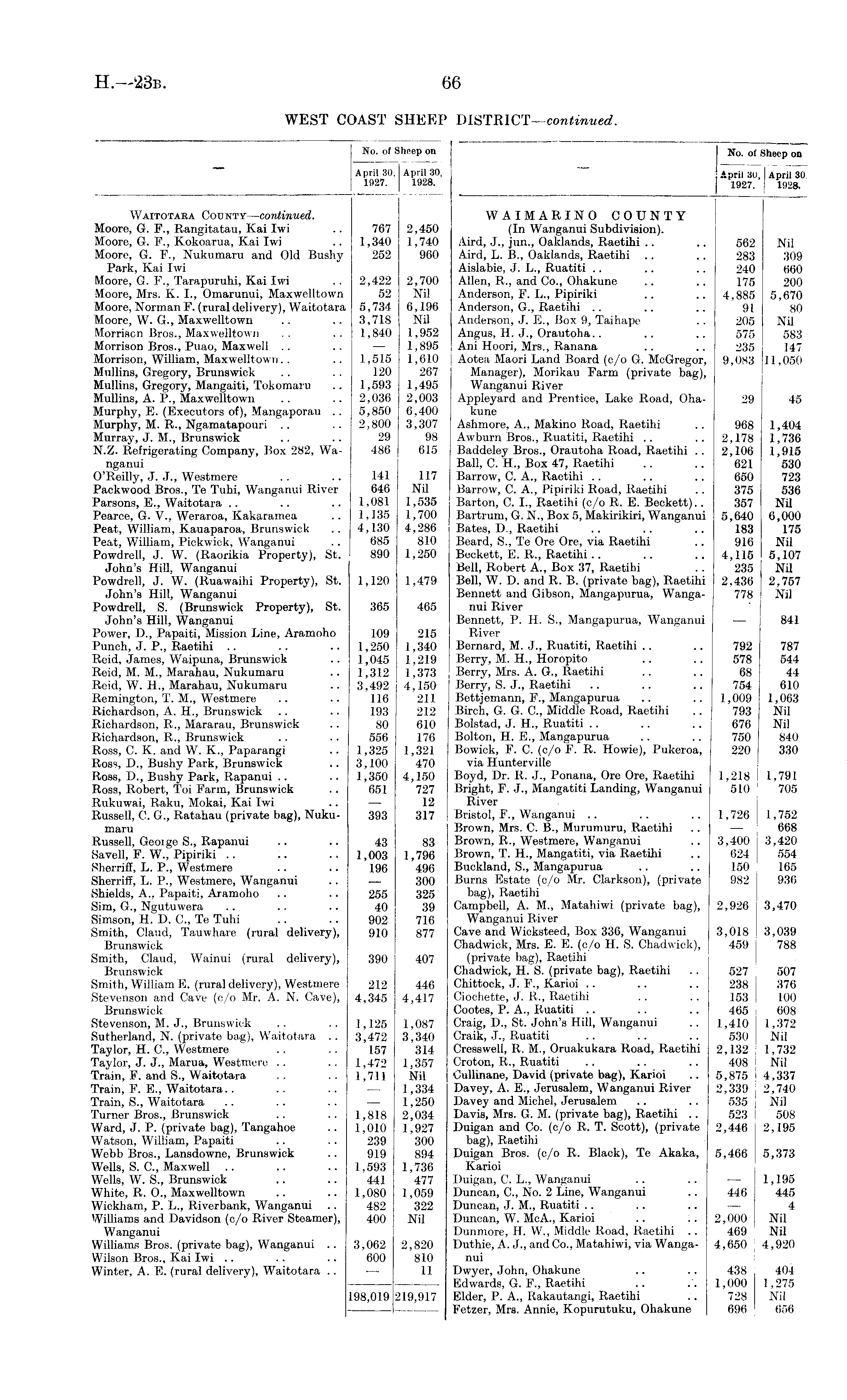 No. of Sheep on April 3U, I April 30 1927. I 1928. WAIMARINO COUNTY (In Wanganui Subdivision). Aird, J., jun., Oaklands, Raetihi .. .. 562 Nil Aird, L. B., Oaklands, Raetihi .. .. 283 309 Aislabie, J. L., Ruatiti .. .. .. 240 660 Allen, R., and Co., Ohakune . . .. 175 200 Anderson, F. L., Pipiriki .. .. 4,885 5,670 Anderson, G., Raetihi .. .. .. 91 80 Anderson, J. E., Box 9, Taihape .. 205 Nil Angus, H. J., Orautoha.. .. .. 575 583 Ani Hoori, Mrs., Ranana .. .. 235 147 Aotea Maori Land Board (c/o G. McGregor, 9,083 11,050 Manager), Morikau Farm (private bag), Wanganui River Appleyard and Prentice, Lake Road, Oha- 29 45 kune Ashmore, A., Makino Road, Raetihi .. 968 1,404 Aw burn Bros., Ruatiti, Raetihi .. .. 2,178 1,736 Baddeley Bros., Orautoha Road, Raetihi .. 2,106 1,915 Ball, C. H., Box 47, Raetihi .. .. 621 530 Barrow, C. A., Raetihi .. .. .. 650 723 Barrow, C. A., Pipiriki Road, Raetihi .. 375 536 Barton, C. I., Raetihi (c/o R. E. Beckett).. 357 Nil Bartrum, G. N., Box 5, Makirikiri, Wanganui 5,640 6,000 Bates, D., Raetihi .. .. .. 183 175 Beard, S., Te Ore Ore, via Raetihi .. 916 Nil Beckett, E. R., Raetihi.. .. .. 4,115 5,107 I Bell, Robert A., Box 37, Raetihi .. 235 Nil Bell, W. D. and R. B. (private bag), Raetihi 2,436 2,757 Bennett and Gibson, Mangapurua, Wanga- 778 Nil nui River Bennett, P. H. S., Mangapurua, Wanganui — 841 River Bernard, M. J., Ruatiti, Raetihi .. .. 792 787 Berry, M. H., Horopito .. .. 578 544 Berry, Mrs. A. G., Raetihi .. .. 68 44 Berry, S. J., Raetihi .. .. .. 754 610 Bettjemann, F., Mangapurua .. .. 1,009 1,063 Birch, G. G. C., Middle Road, Raetihi .. 793 Nil Bolstad, J. H., Ruatiti .. .. .. 676 Nil Bolton, H. E., Mangapurua .. .. 750 840 Bowick, F. C. (c/o F. R. Howie), Pukeroa, 220 330 via Hunterville Boyd, Dr. R. J., Ponana, Ore Ore, Raetihi 1,218 1,791 Bright, F. J., Mangatiti Landing, Wanganui 510 705 River Bristol, F., Wanganui .. .. .. 1,726 1,752 Brown, Mrs. C. B., Murumuru, Raetihi .. — 668 Brown, R., Westmere, Wanganui .. 3,400 , 3,420 Brown, T. H., Mangatiti, via Raetihi .. 624 554 Buckland, S., Mangapurua .. .. 150 165 Burns Estate (c/o Mr. Clarkson), (private 982 936 bag), Raetihi Campbell, A. M., Matahiwi (private bag), 2,926 3,470 Wanganui River Cave and Wicksteed, Box 336, Wanganui 3,018 3,039 Chadwick, Mrs. E. E. (c/o H. S. Chadwick), 459 788 (private bag), Raetihi Chadwick, H. S. (private bag), Raetihi . . 527 507 Chittock, J. F., Karioi .. .. .. 238 j 376 Ciochette, J. R., Raetihi . . .. 153 1 100 Cootes, P. A., Ruatiti .. .. .. 465 608 Craig, D., St. John's Hill, Wanganui .. 1,410 1,372 Craik, J., Ruatiti .. .. .. 530 ' Nil Cresswell, R. M., Oruakukara Road, Raetihi 2,132 1,732 Croton, R., Ruatiti .. .. .. 408 Nil Cullinane, David (private bag), Karioi .. 5,875 4,337 Davey, A. E., Jerusalem, Wanganui River 2,339 2,740 Davey and Michel, Jerusalem .. .. 535 Nil Davis, Mrs. G. M. (private bag), Raetihi .. 523 508 Duigan and Co. (c/o R. T. Scott), (private 2,446 2,195 bag), Raetihi Duigan Bros, (c/o R. Black), Te Akaka, 5,466 5,373 Karioi Duigan, C. L., Wanganui .. .. — 1,195 Duncan, C., No. 2 Line, Wanganui .. 446 445 Duncan, J. M., Ruatiti .. .. .. — 4 Duncan, W. McA., Karioi .. .. 2,000 Nil Dunraore, H. W., Middle Road, Raetihi .. 469 Nil Duthie, A. J., and Co., Matahiwi, via Wanga- 4,650 4,920 nui Dwyer, John, Ohakune .. .. 438 404 Edwards, G. F., Raetihi .. 1,000 1,275 Elder, P. A., Rakautangi, Raetihi .. 728 Nil Fetzer, Mrs. Annie, Kopurutuku, Ohakune 696 656